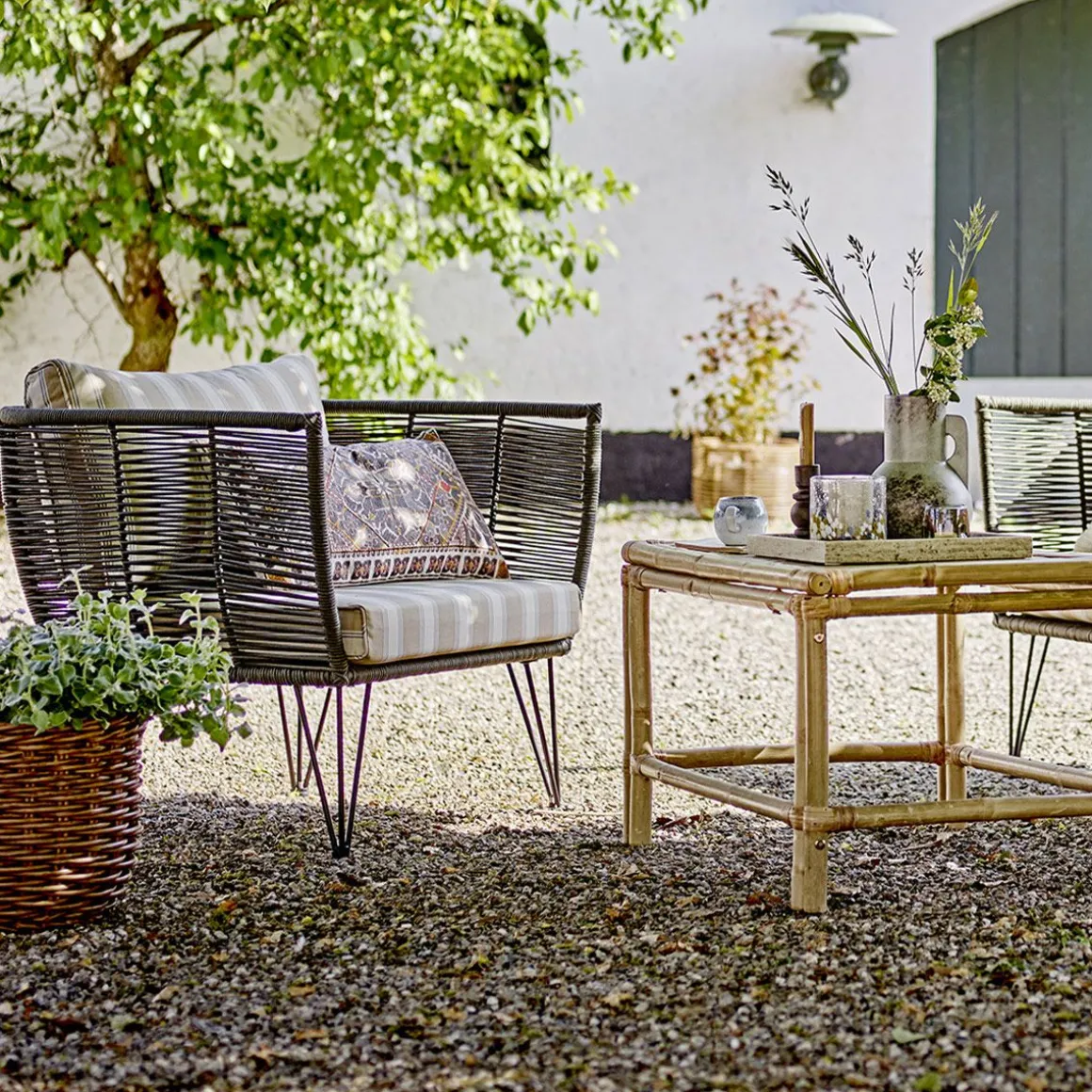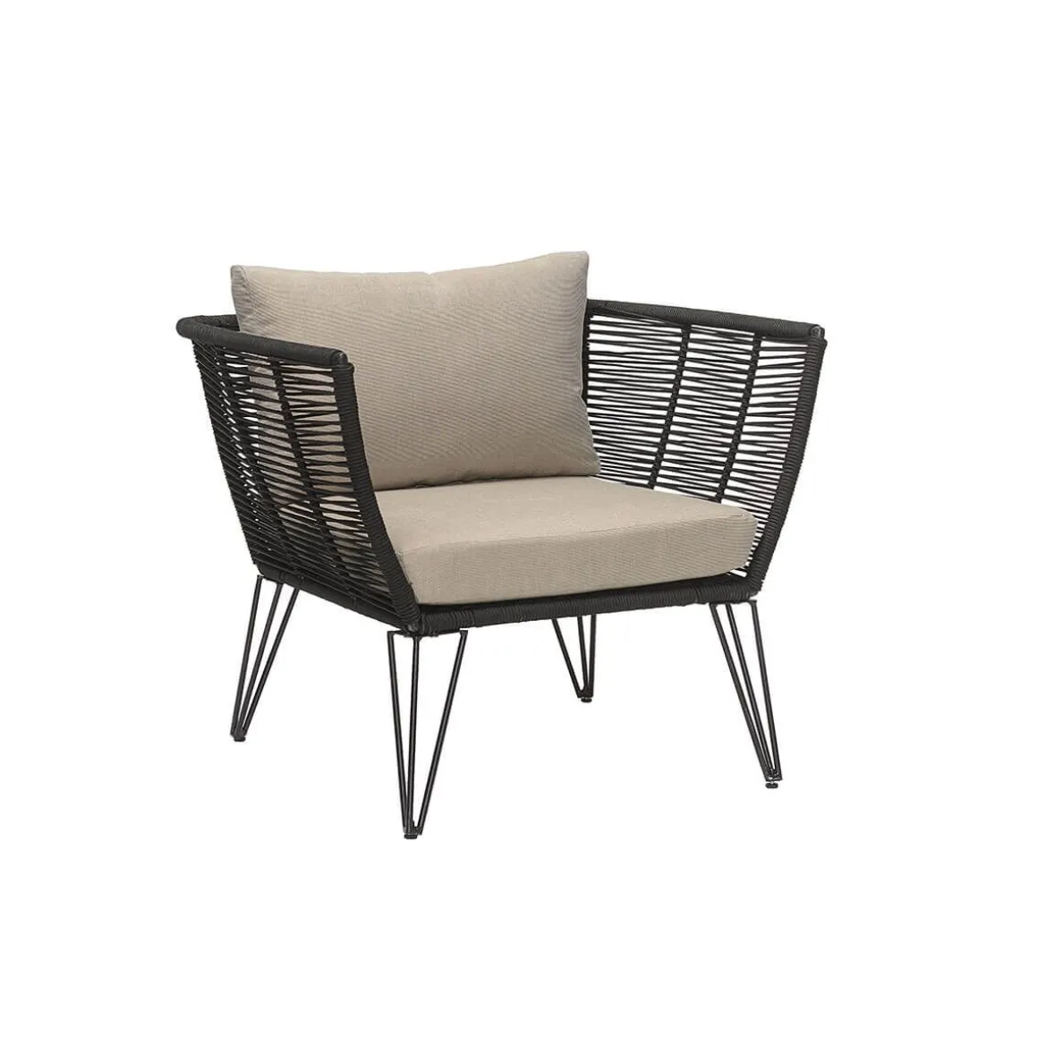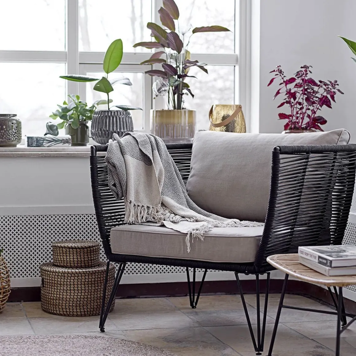 Mundo Outdoor de Bloomingville. La chaise de salon Mundo de Bloomingville est en métal noir revêtu de poudre avec une corde en polyester noir tissée à la main sur le cadre. Les housses de coussin de couleur marron clair sont en polyester et peuvent être lavées à 30 degrés. La chaise de jardin convient à tous les espaces extérieurs, mais en protégeant la chaise de la lumière directe du soleil, la couleur du tissu et la durabilité de la chaise seront prolongées. Profitez d’une chaise d’extérieur très confortable avec des coussins doux, parfaite pour les moments de détente et de convivialité. Il peut être utiliser à l’intérieur comme à l’extérieur.
