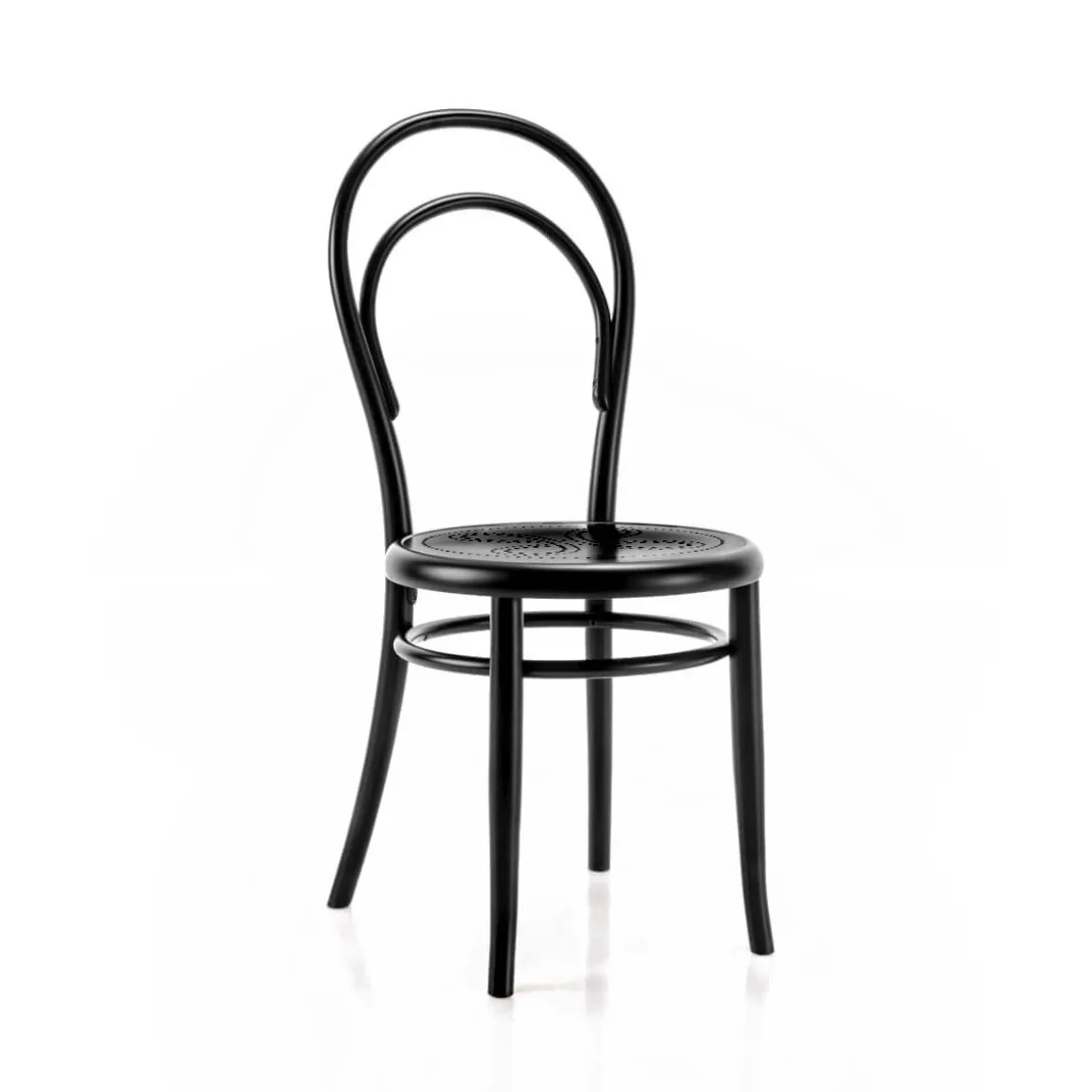 Le grand classique de la marque. Le produit le plus connu et vendu. Conçu par Michael Thonet en 1860, la chaise n° 14 a immédiatement été qualifiée de chaise de bistrot. Minimaliste par l’usage du matériau et par le nombre de pièces le constituant, la numéro 14 est le résultat d’une recherche technologique de près de vingt ans. Simple, polyvalente et toujours à jour, elle est considérée comme le premier exemple de design industriel. Sa structure est composée d’éléments en hêtre massif cintrés à la vapeur magistralement cintrés. Le dos et les jambes arrières prennent forme à partir d’un seul morceau de bois. Disponible avec différentes variantes de siège.