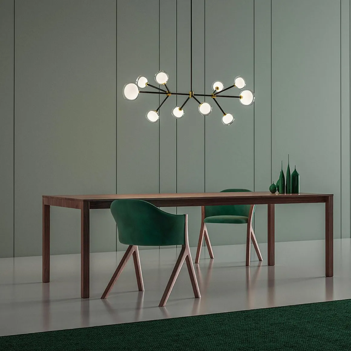 Collection Nabila de Tooy inspirée de lampes des années 50, élégantes et sophistiquées, représentant le détail pour enrichir n’importe quel endroit. Un objet lumineux sphérique double face en verre borosilicaté rend ces lampes existantes dans différentes compositions, avec une structure faite de métal laqué enrichie de détails en laiton brossé. Différents modèles sont disponibles pour toutes les situations. Richesse et sobriété en un seul élément.