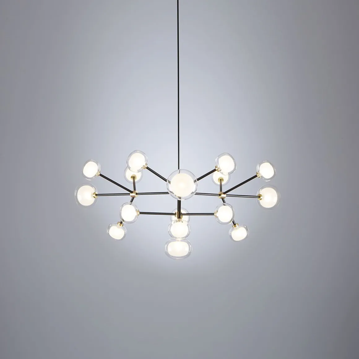 Collection Nabila de Tooy inspirée de lampes des années 50, élégantes et sophistiquées, représentant le détail pour enrichir n’importe quel endroit. Un objet lumineux sphérique double face en verre borosilicaté rend ces lampes existantes dans différentes compositions, avec une structure faite de métal laqué enrichie de détails en laiton brossé. Différents modèles sont disponibles pour toutes les situations. Richesse et sobriété en un seul élément.