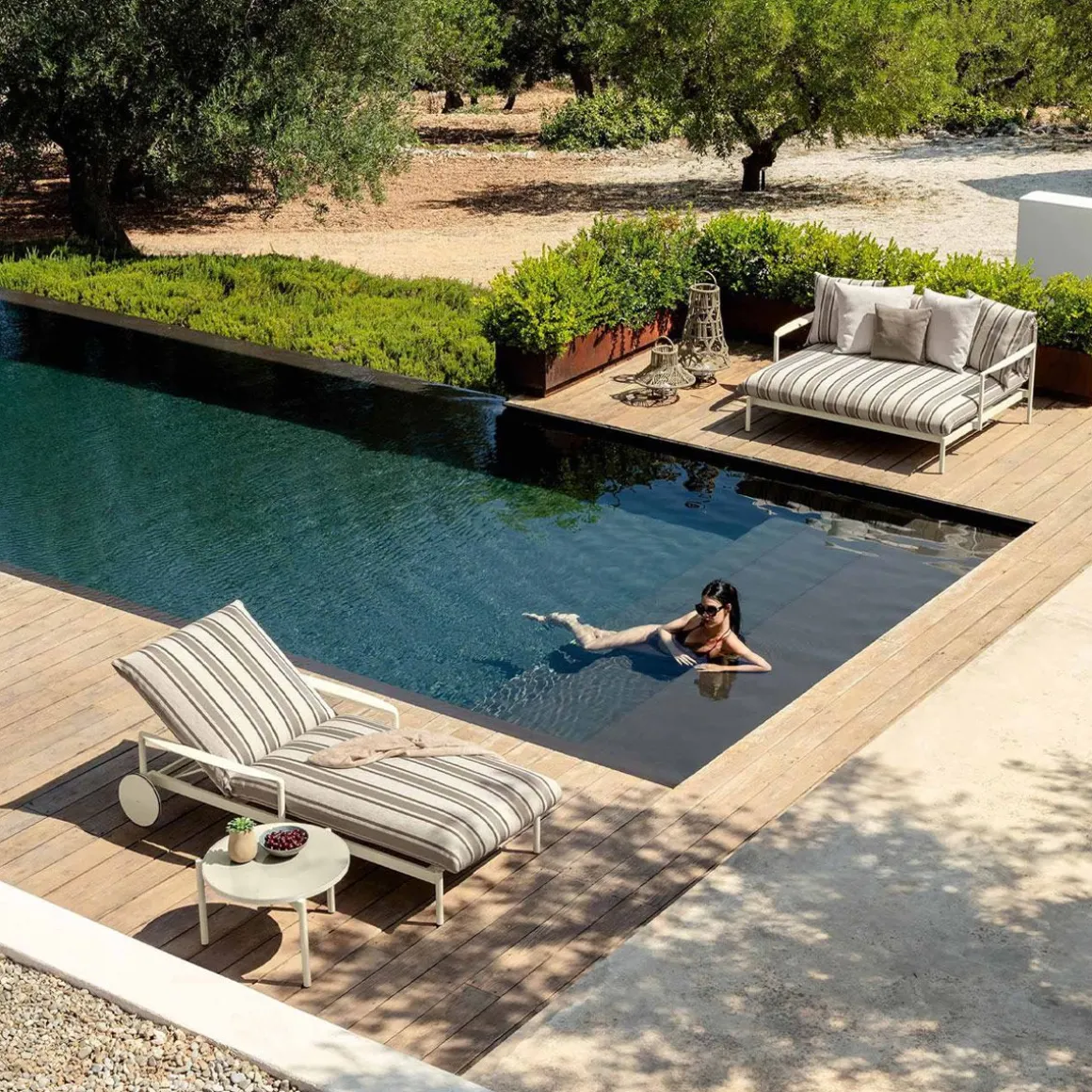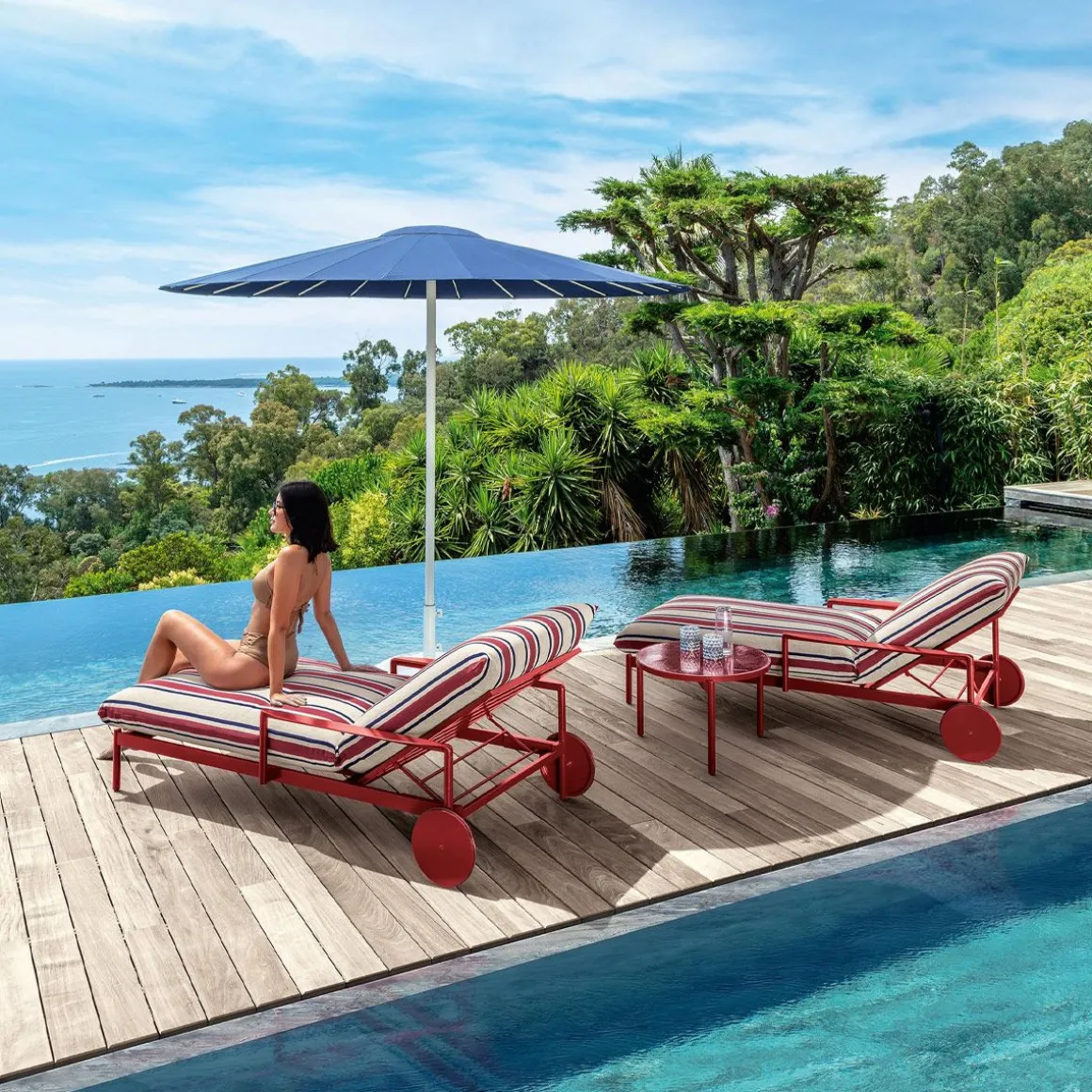 Nalu de Talenti par Ludovica + Roberto Palomba. Le premier lit de bronzage avec accoudoirs appartient à la collection Nalu du studio Palomba-Serafini. Le style rétro avec des mécanismes de réglage à plusieurs étages, vous permet de vivre votre piscine dans un confort total.