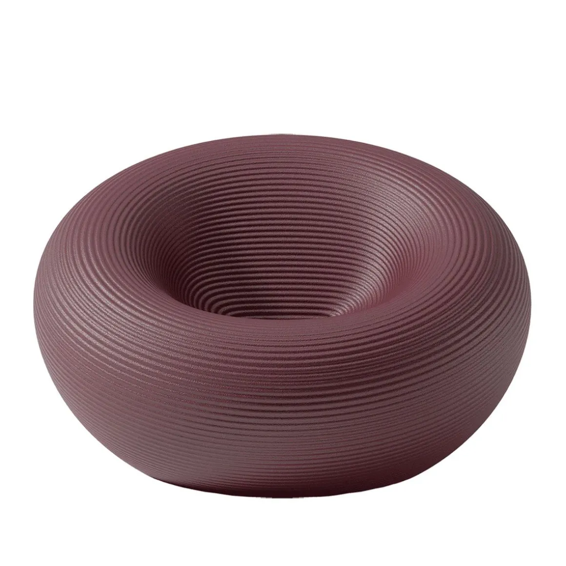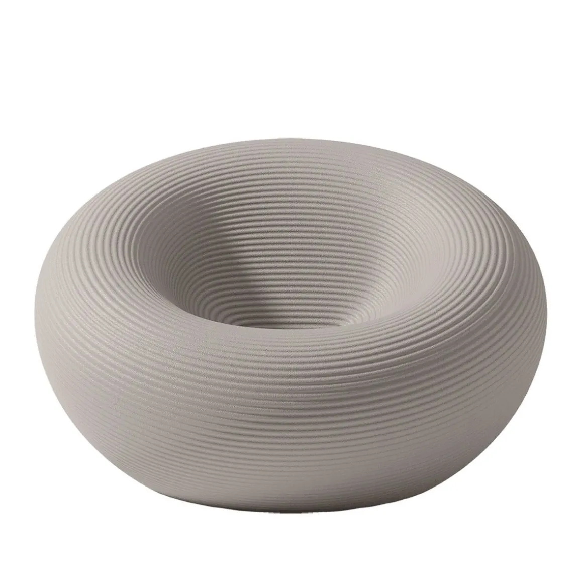 Nami de Qeeboo par Stefano Giovannoni. Le fauteuil Nami est obtenu par rotation d’une section sur un axe diagonal. Il présente une forme parfaitement circulaire où les moulures qui caractérisent sa surface se déroulent du centre vers les bords, formant une succession d’anneaux concentriques. Au centre du fauteuil se trouve le canal de reflux de l’eau. Disponible en six coloris, trois d’entre eux sont de couleur uniforme, les trois autres sont issus du recyclage et du mélange de matériaux avec deux ou trois nuances différentes.