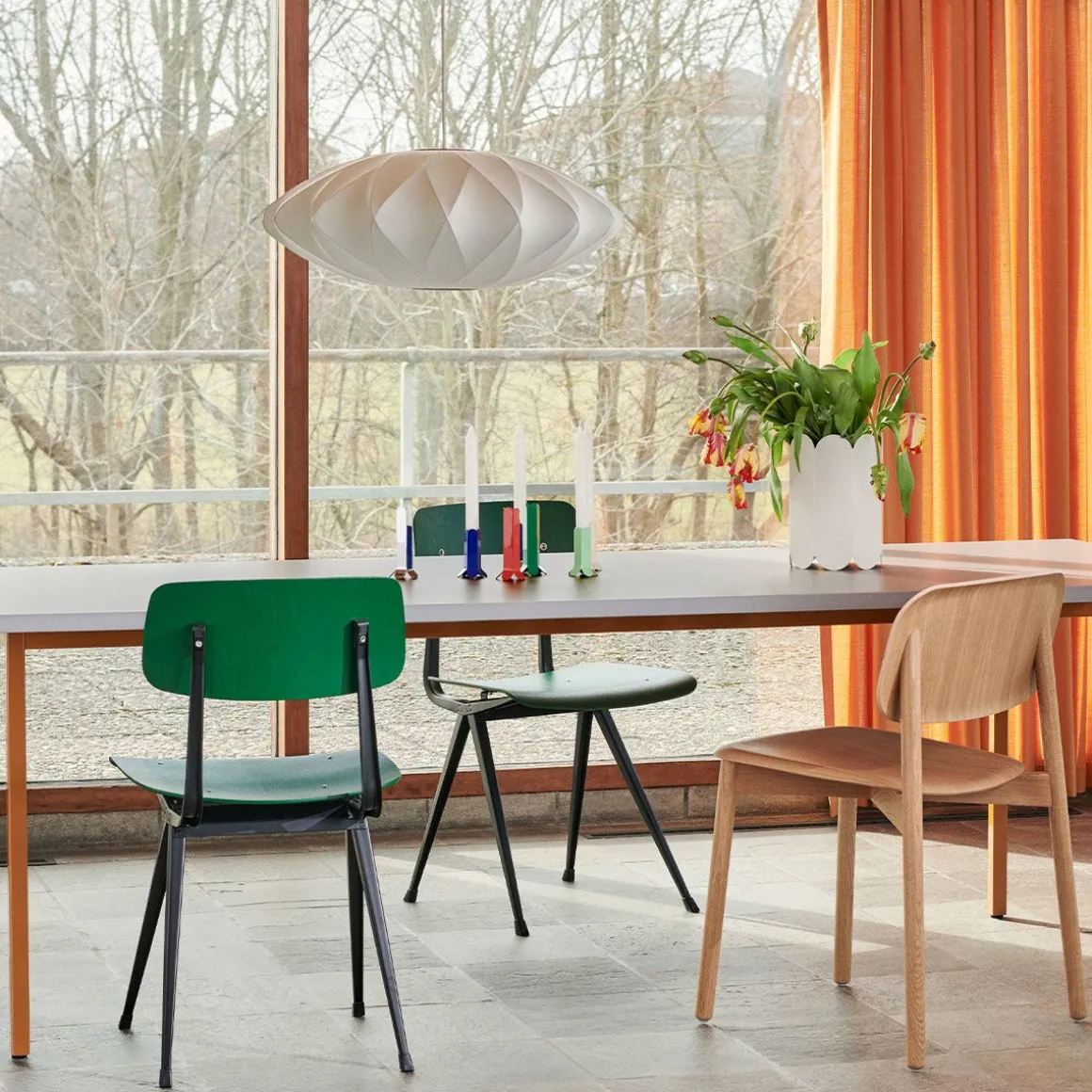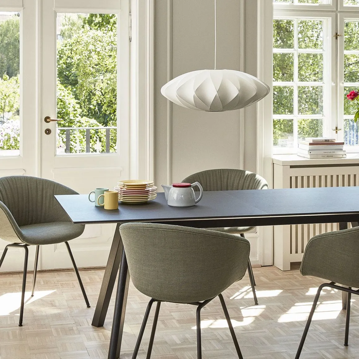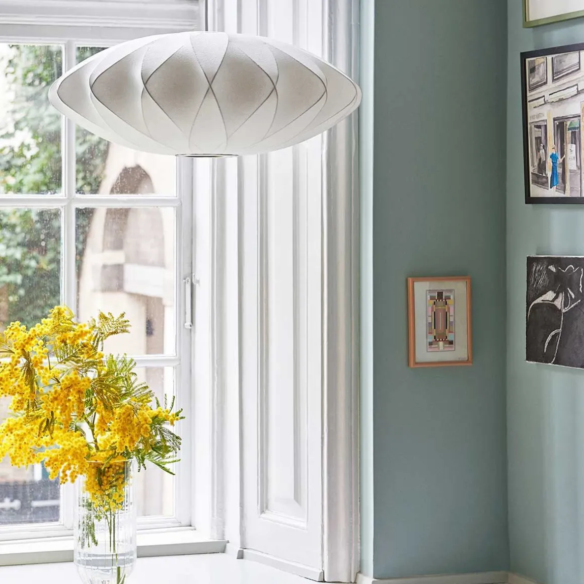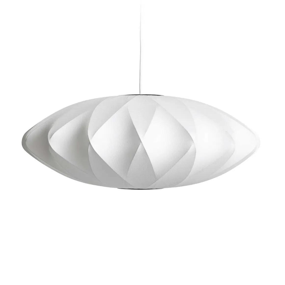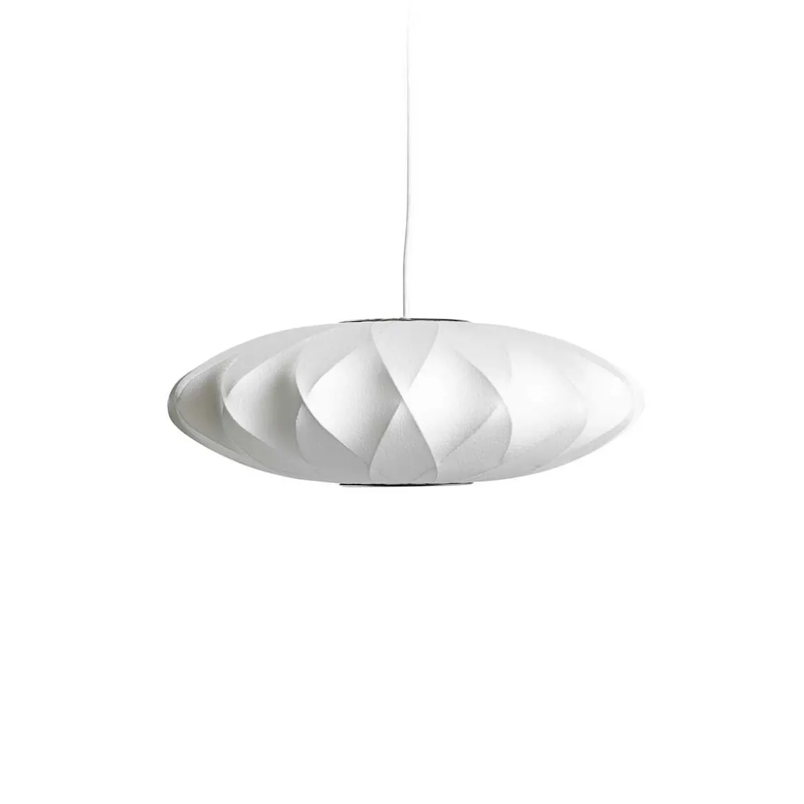 Nelson Saucer Crisscross Bubble de Hay. Conçue par le designer américain George Nelson en 1947 et produite pour la première fois en 1952, la lampe Bubble a marqué une révolution dans l’industrie de l’éclairage moderniste. Disponibles dans un assortiment de tailles et de formes organiques, ces orbes élégants trouvent leur inspiration dans un ensemble de lampes suspendues suédoises recouvertes de soie que Nelson voulait pour son bureau, mais qu’il trouvait trop cher. Utilisant l’ingéniosité qui caractérisait son processus de travail, il a décidé d’utiliser un aérosol en plastique autolubrifiant mis au point par l’armée américaine et l’a appliqué sur une structure en acier léger et arrondi pour produire ces luminaires doux et brillants.