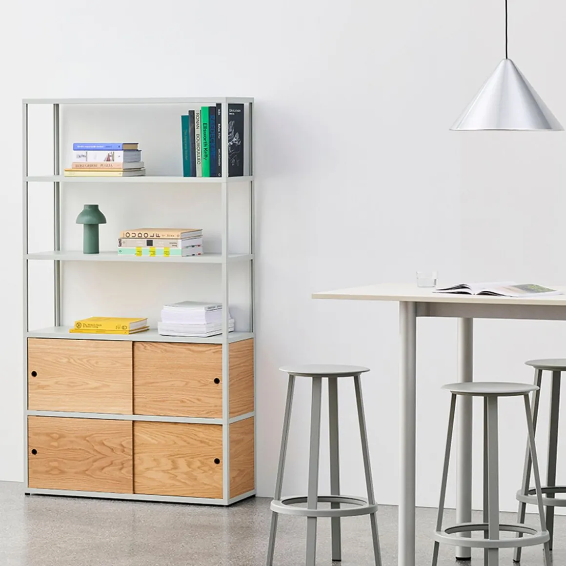 Développé en collaboration avec HAY, New Order de Stefan Diez est un système d’étagères polyvalent conçu pour s’adapter aux modes de vie contemporains. Sa structure simple à grille ouverte offre un cadre flexible et fonctionnel permettant à l’utilisateur de sélectionner des solutions de rangement prédéfinies pour répondre à ses besoins spécifiques. New Order est proposé dans une grande variété de couleurs et de combinaisons, avec une sélection de configurations préconfigurées, adaptées à une utilisation dans le salon, la cuisine, le bureau à domicile, ainsi que dans les environnements professionnels.
