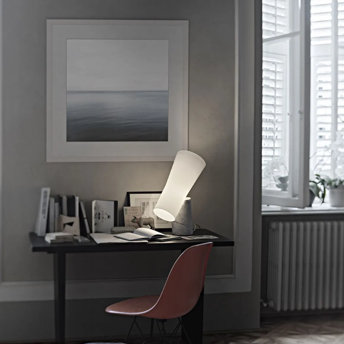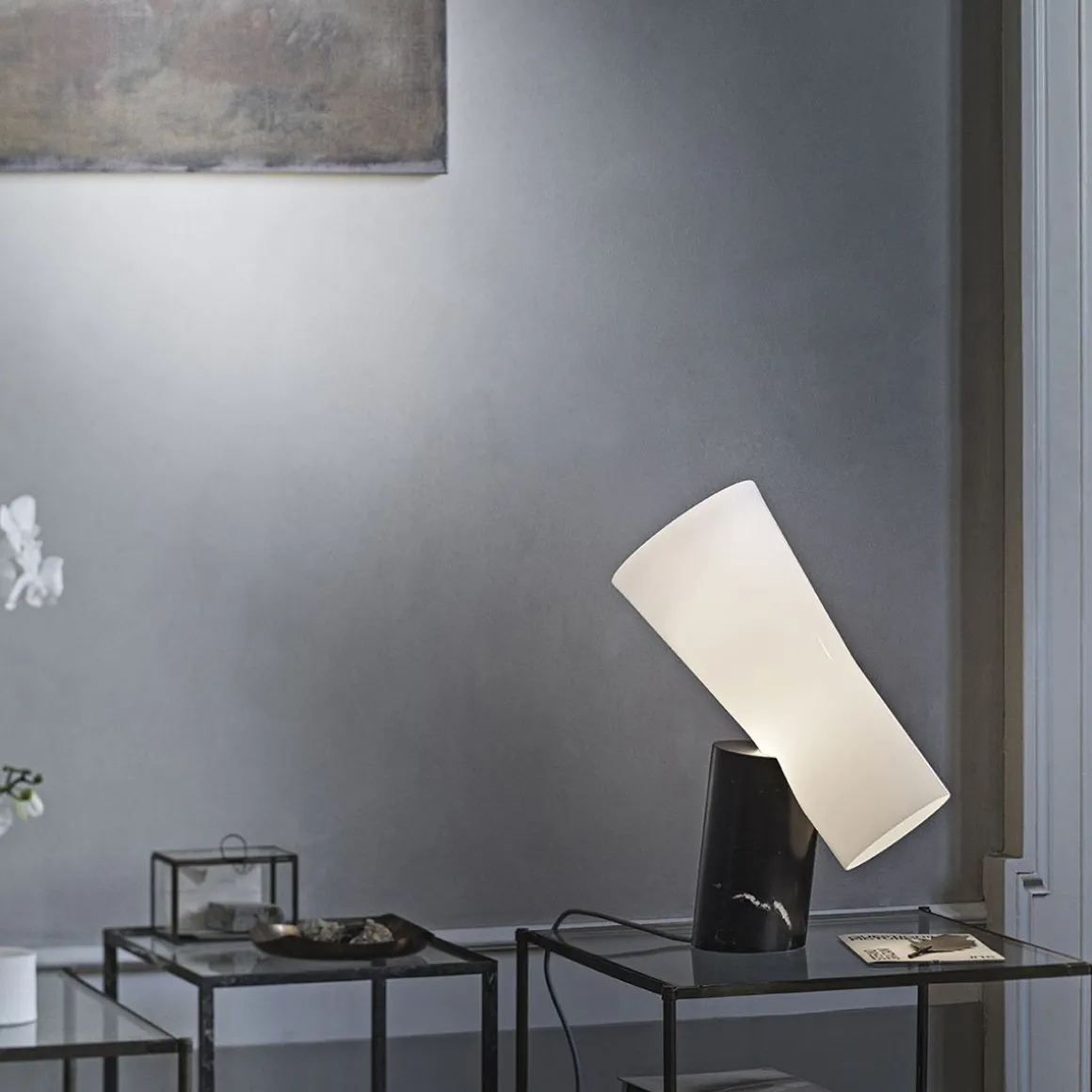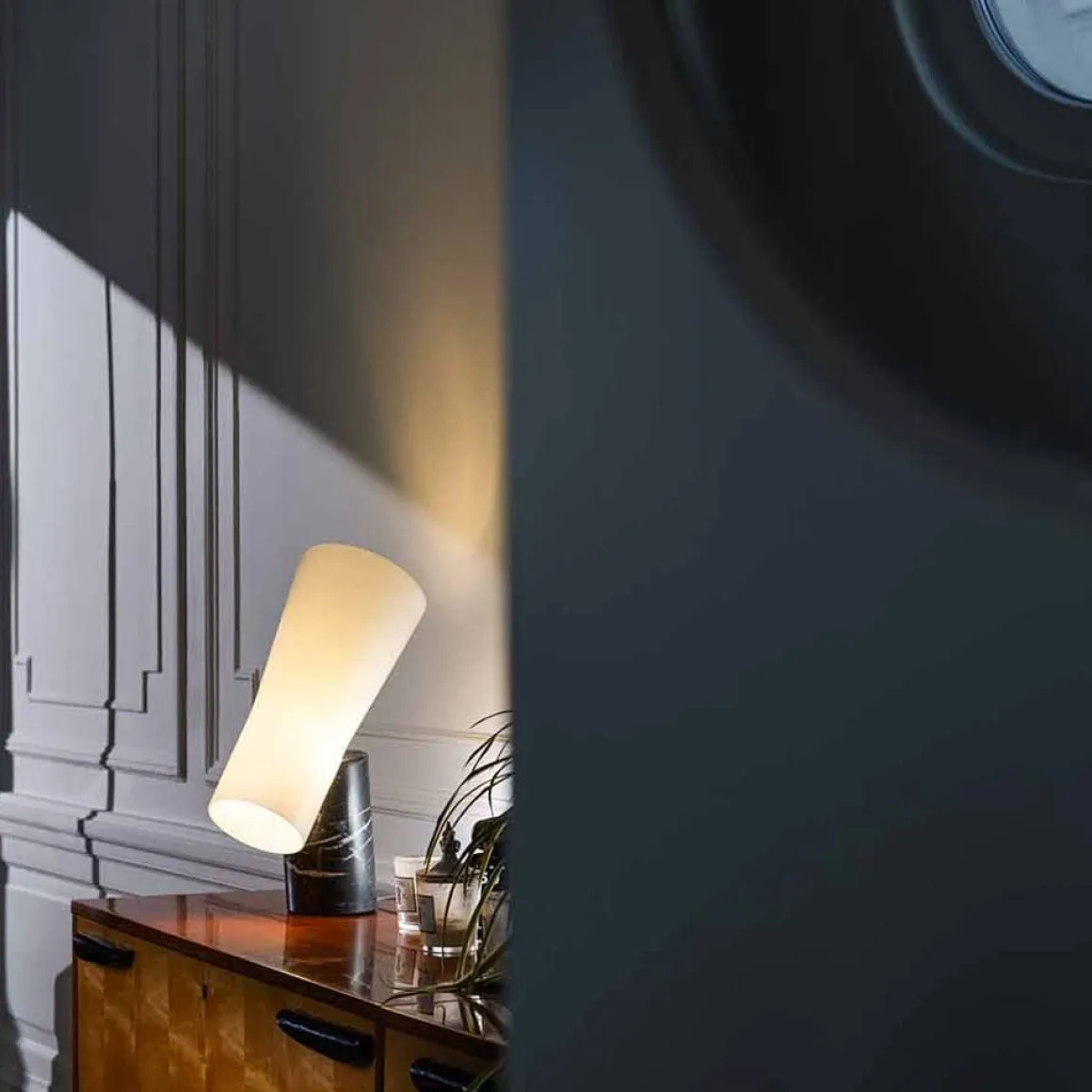 Nile est une lampe d’ameublement de grand caractère, avec une présence scénique importante, capable de transférer sa propre élégance sophistiqué à n’importe quel environnement. Un objet qui représente l’équilibre parfait entre deux opposés, la consistance du marbre et la délicatesse du verre, entre la froideur d’une matière extraite et la chaleur d’une matière soufflée. Belle même éteinte, elle s’illumine de façon merveilleuse lorsque la lumière filtre à travers le précieux verre soufflé à la bouche, se dirigeant vers le bas sur le dessus et vers le haut à travers les deux côtés ouverts du diffuseur. La composition des deux volumes un jeu invisible de poids, de positions et d’articulations qui détermine un effet global dynamique.