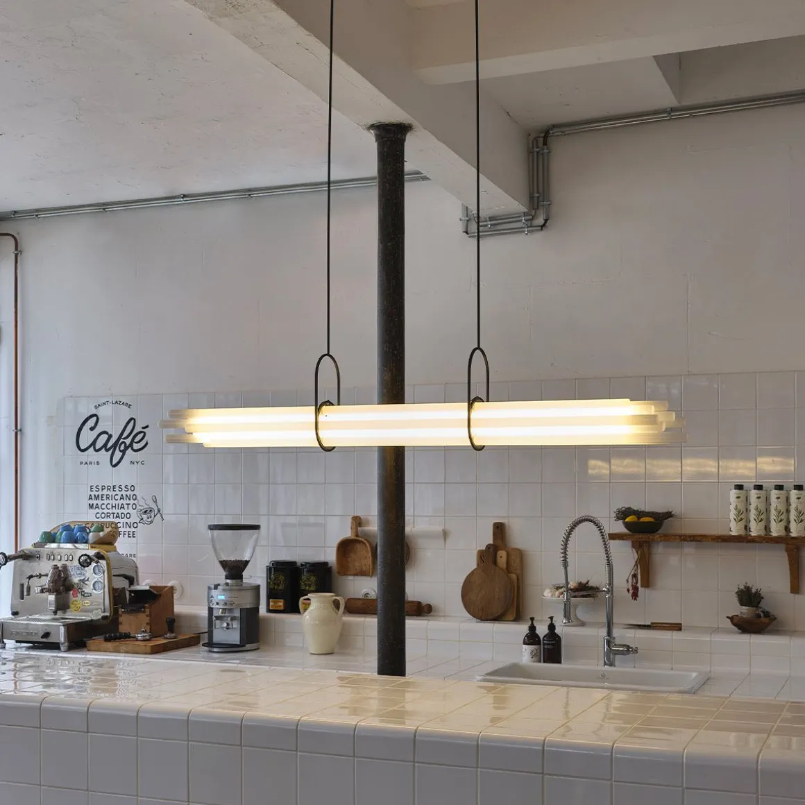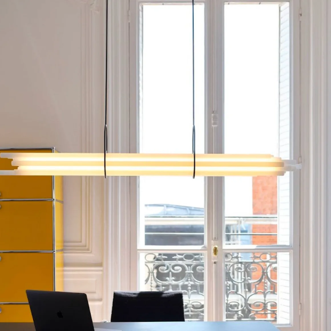 La collaboration entre DCWéditions et Sebastian Summa s’étoffe avec une nouvelle référence plafonnière : la grande suspension NL12. Pensé pour éclairer une grande table de salle-à-manger, astucieusement appareillé façon trompe l’œil, ce luminaire est composé de douze tubes en verre borosilicate dont un seul, fonctionnant telle une centrale, est source de lumière, les autres tubes relayant par réfraction et prisme sa diffusion. Aucun fil visible, aucun LED visible, aucune structure en aluminium visible : NL 12 évoque ainsi un faisceau céleste à la fois radical et poétique.