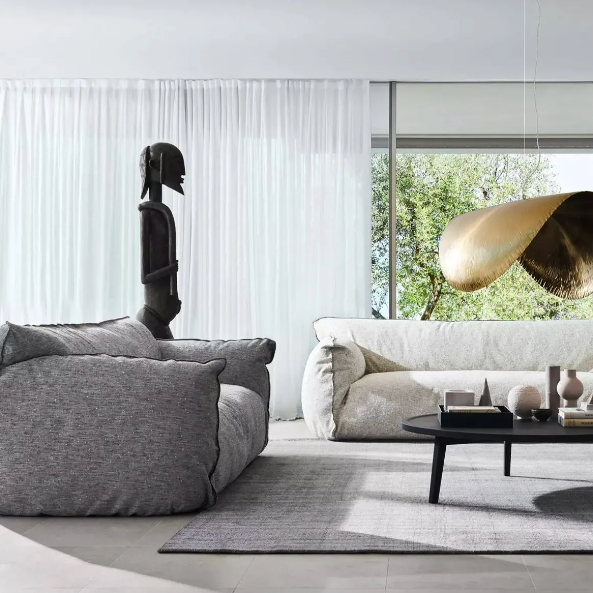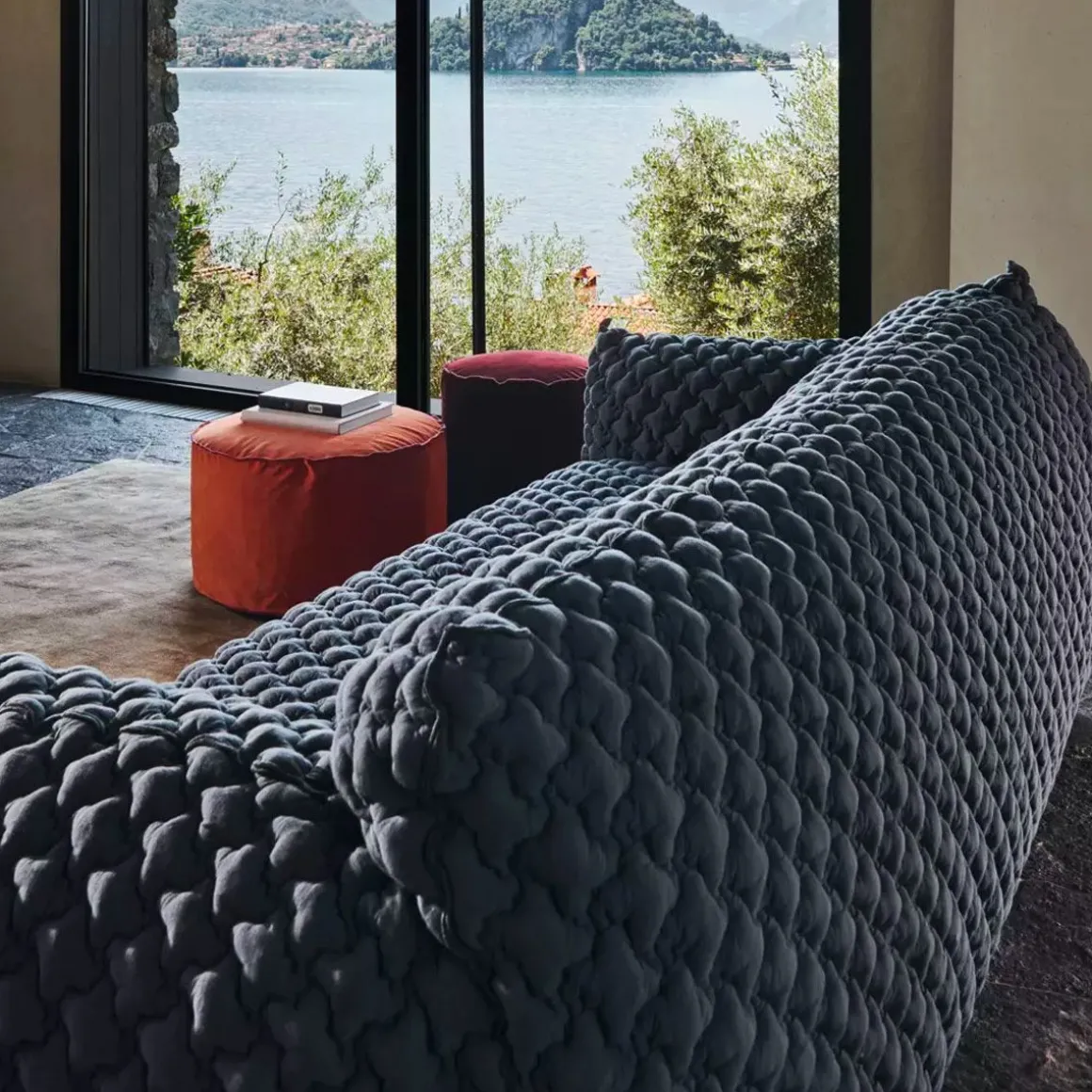 Nuvola canapé de Gervasoni par Paola Navone. Famille de canapés aux formes tendres et attrayantes, Nuvola possède une esthétique qui invite à s’y plonger : les accoudoirs hauts accueillent une assise profonde comme une embrassade pour créer une véritable impression de cocon. Disponibles en version deux ou trois places, ils sont rembourrés de mousse de polyuréthane de différentes densités et recouverts d’une courtepointe matelassée garnie de duvet d’oie et de flocons en fibre de polyester. La housse, amovible, est ornée de coutures apparentes qui dessinent le profil du produit et peut être réalisée avec tous les revêtements du catalogue, pour un maximum de polyvalence.