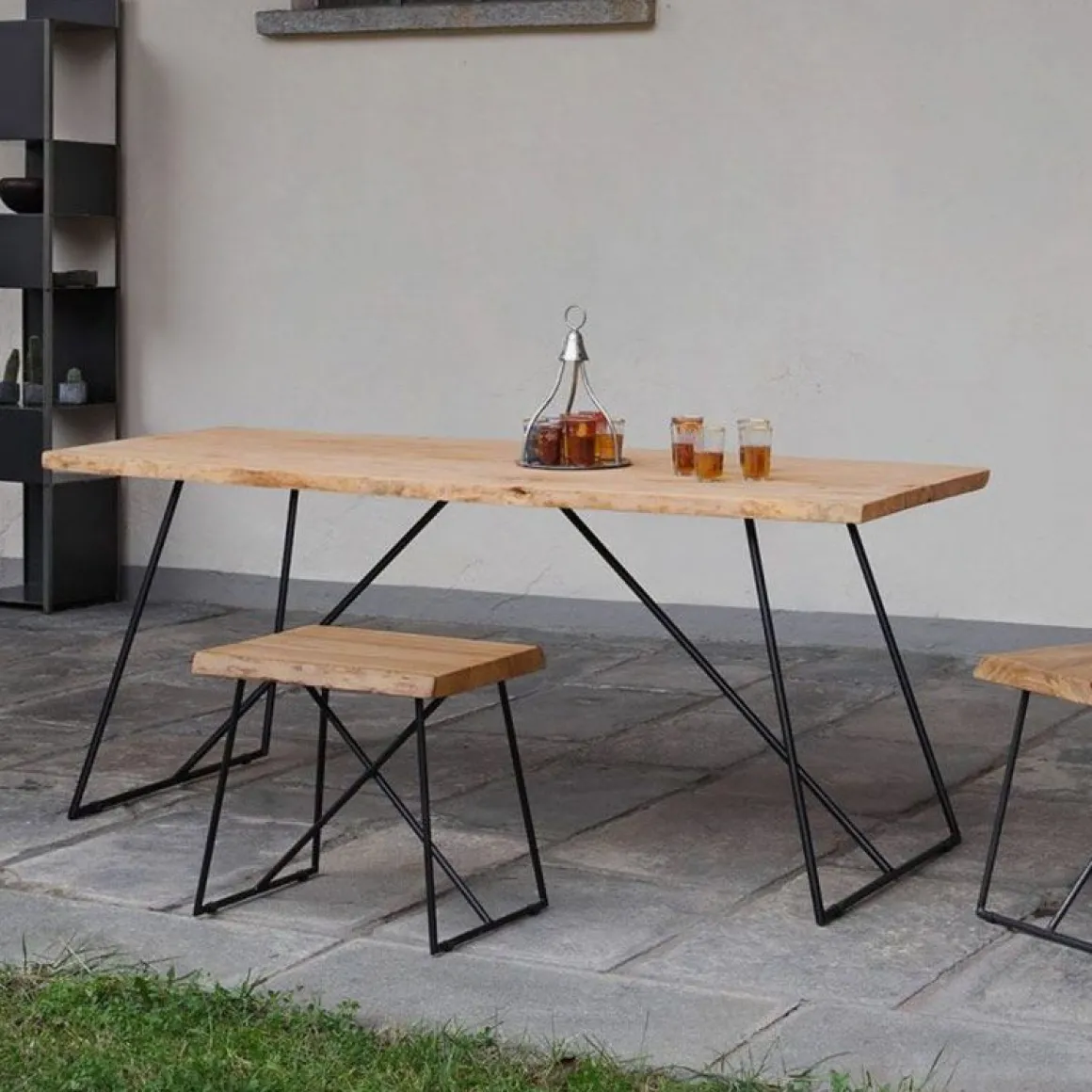 Matériaux : peinture époxy noir cuivré sablé et bois d’olivier massif vieilli