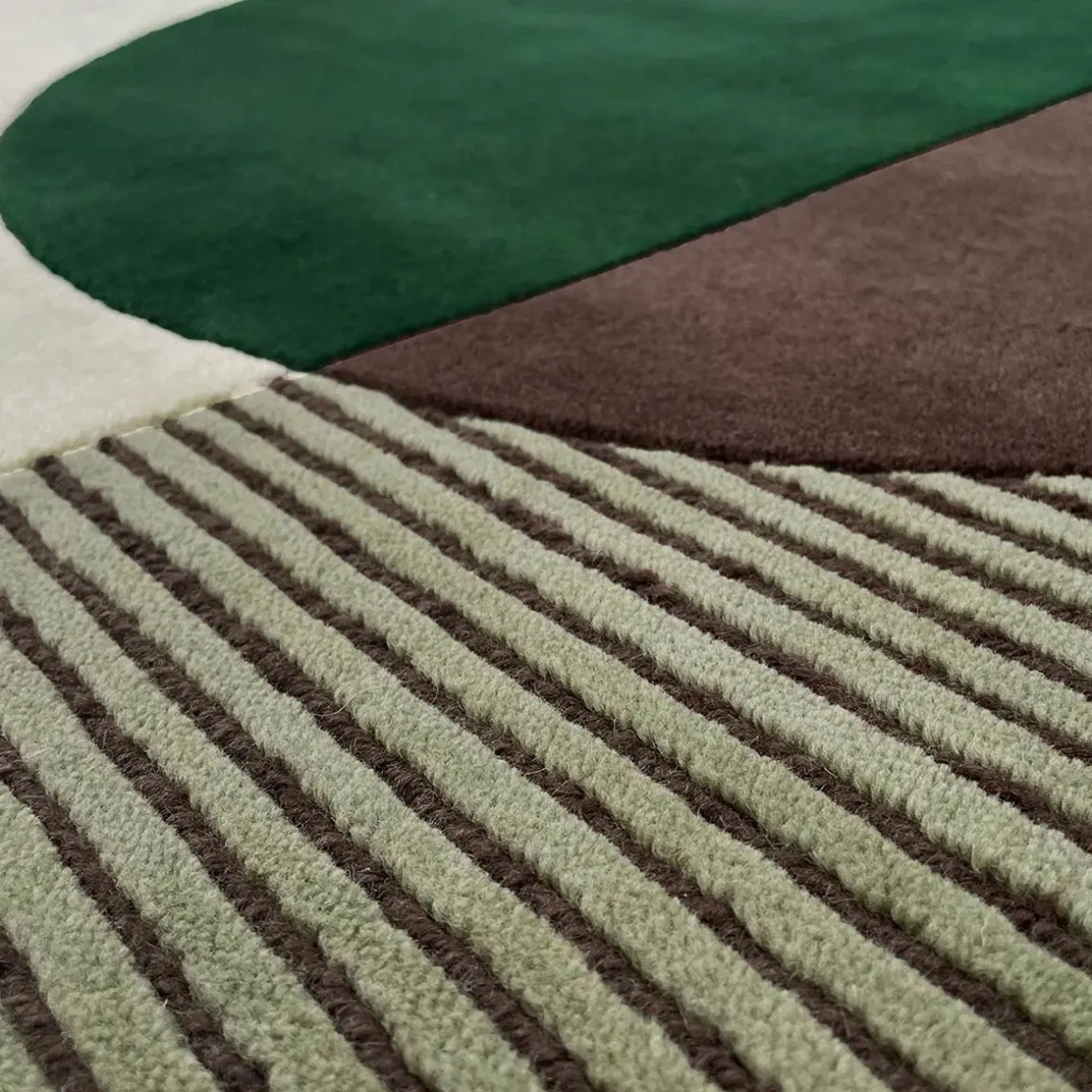L’utilisation de la couleur en aplat traçant des motifs géométriques se joue du regard. Les courbes apportent de la douceur aux teintes pendant que la superposition des formes et des stries les densifie.
