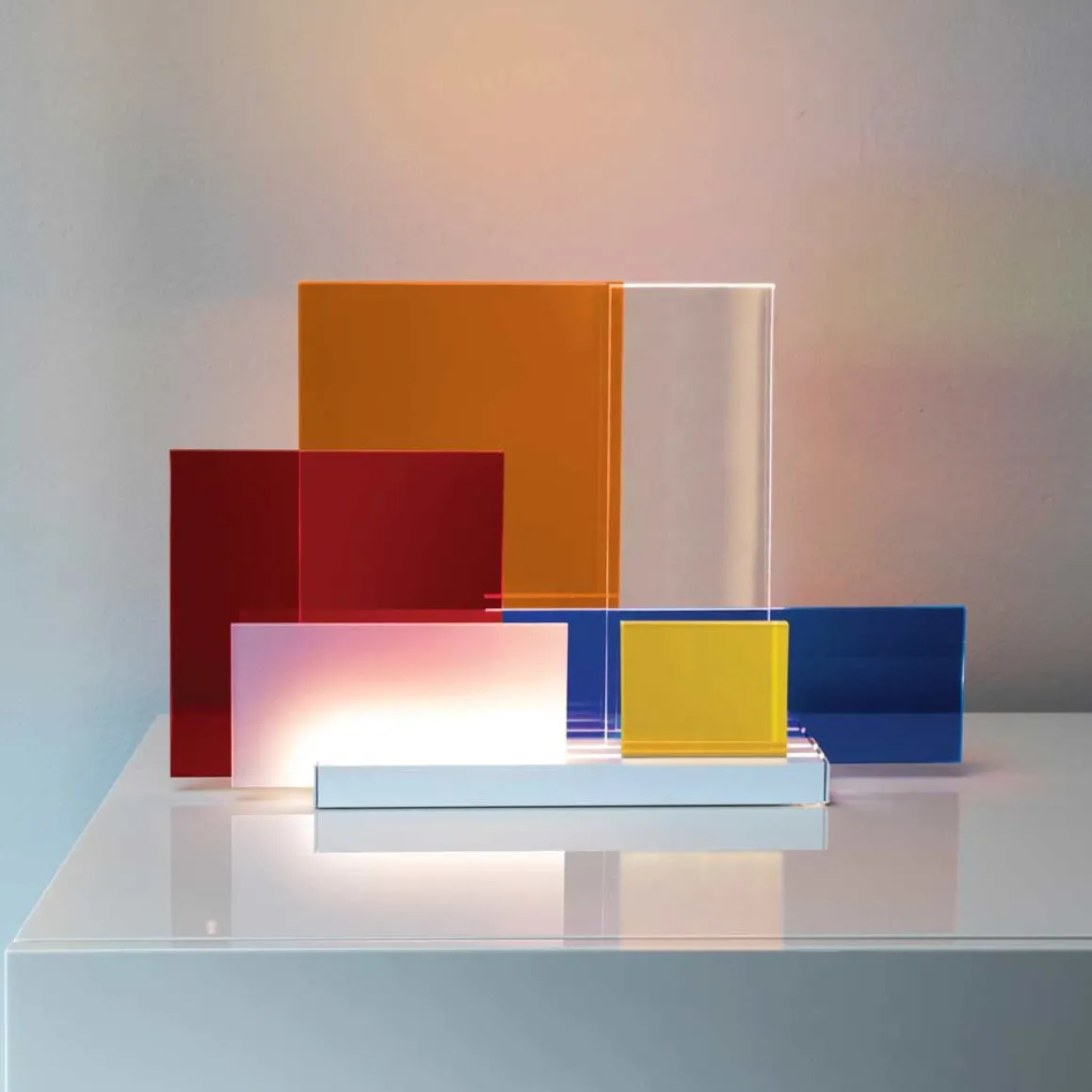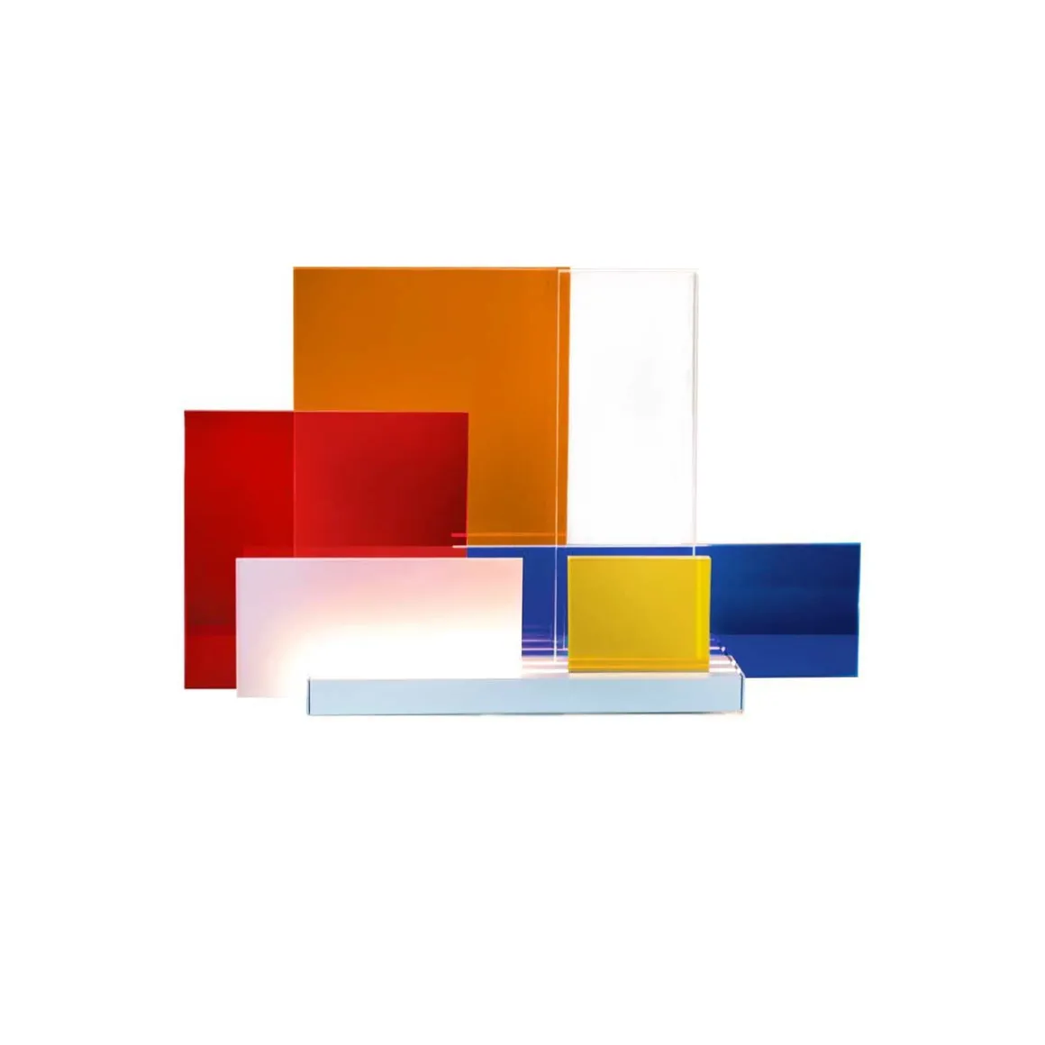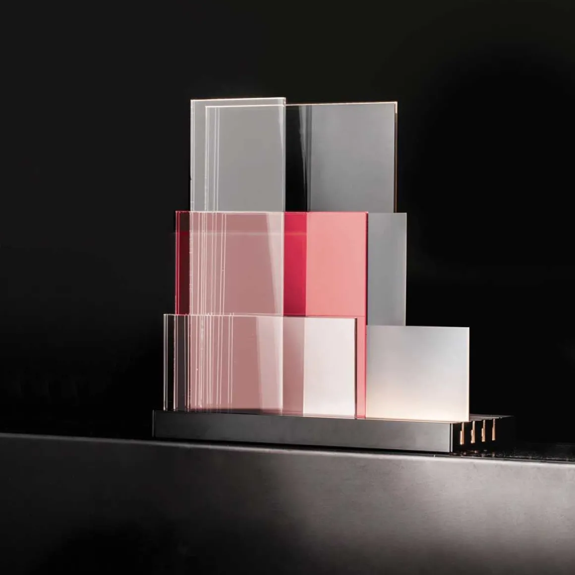 La base de la lampe de table LED, présente 4 rails ou positionner au choix les différents diffuseurs pour créer d’infinies configurations de luminière et de transparence.