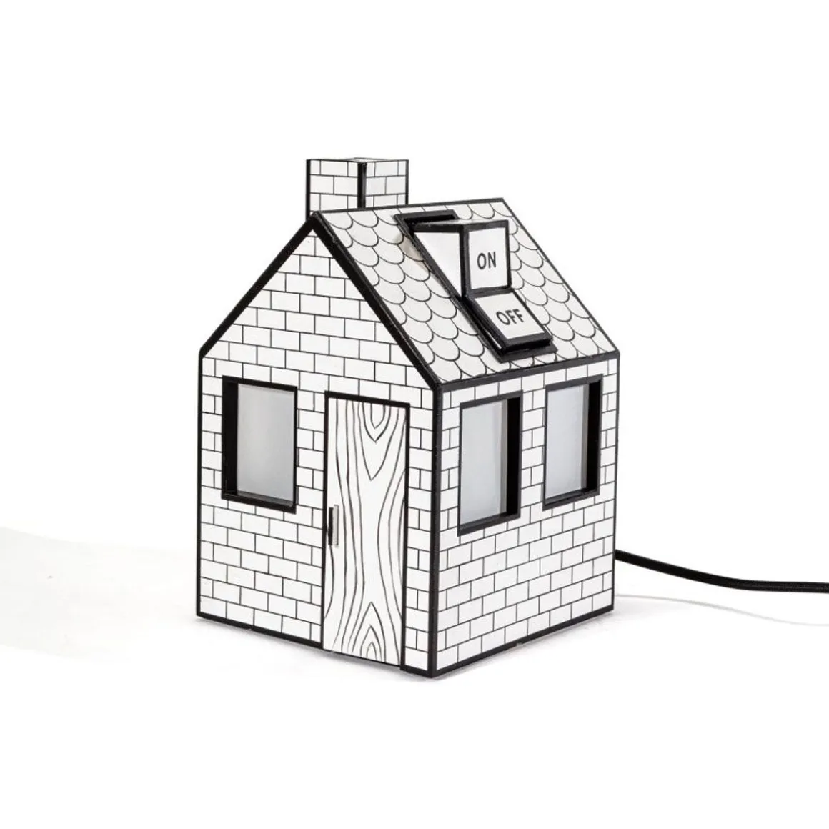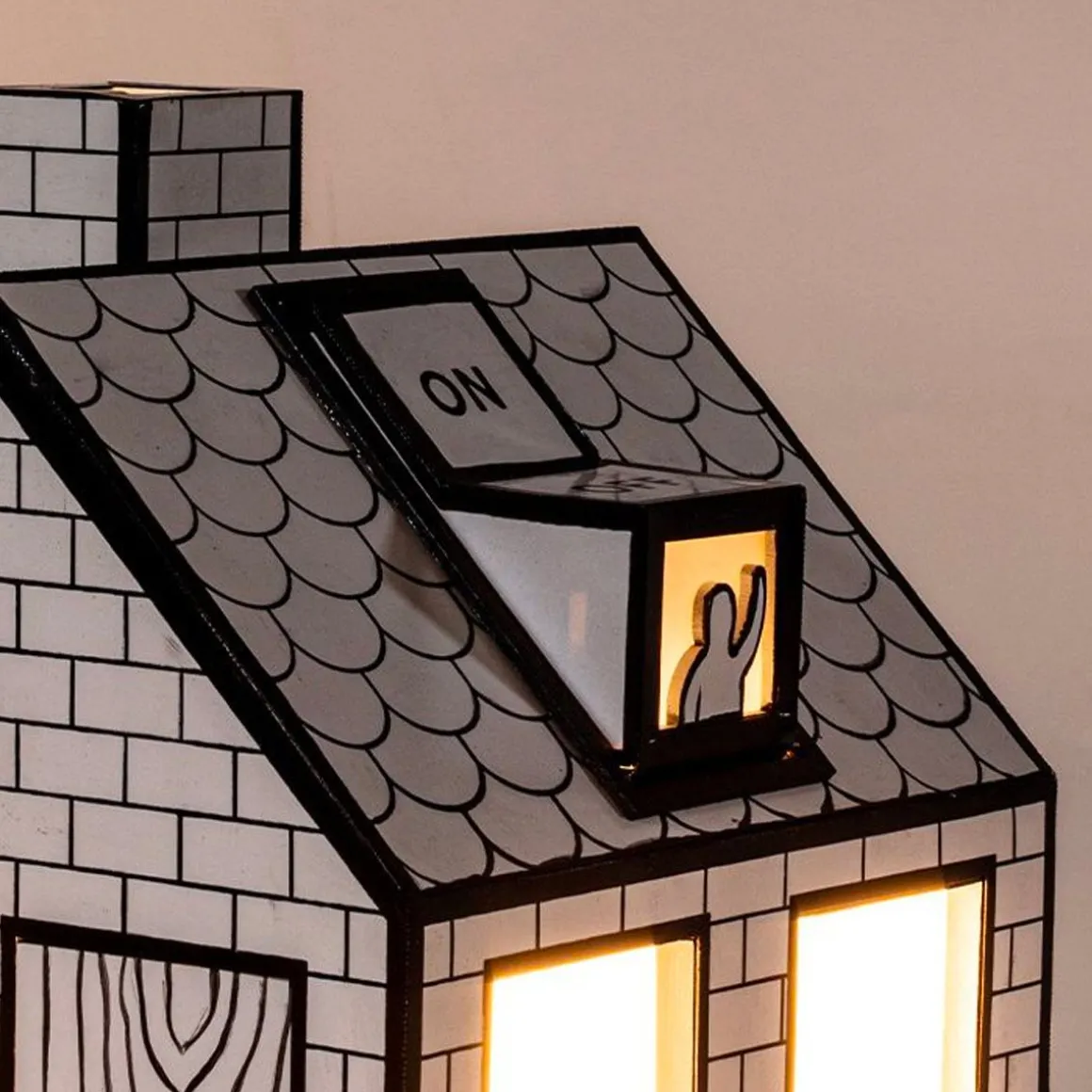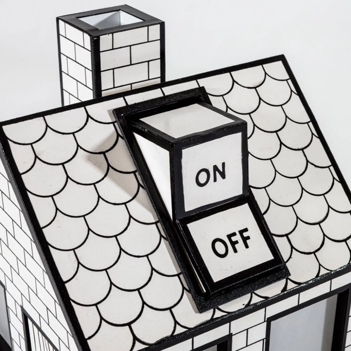 On-off de Seletti par Tomas Schats. Je regardais par ma lucarne la rangée de maisons juste en face de notre rue. Les familles se sont rassemblées chez elles après une journée de travail/d’école. Lentement (chacun à la fois), ils allumèrent leurs lumières. D’une manière enfantine, j’ai pensé à allumer la lumière en poussant les lucarnes de l’autre côté de la rue. Dans le design « ON-OFF », j’ai traduit ce sentiment de la manière la plus concise en utilisant la lucarne comme interrupteur. Je veux inciter le visiteur à (re)penser des situations courantes. Lui montrer une situation ordinaire sous un angle différent.