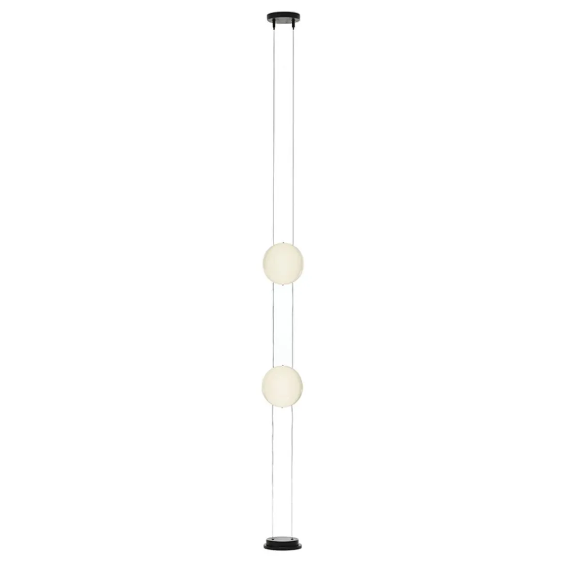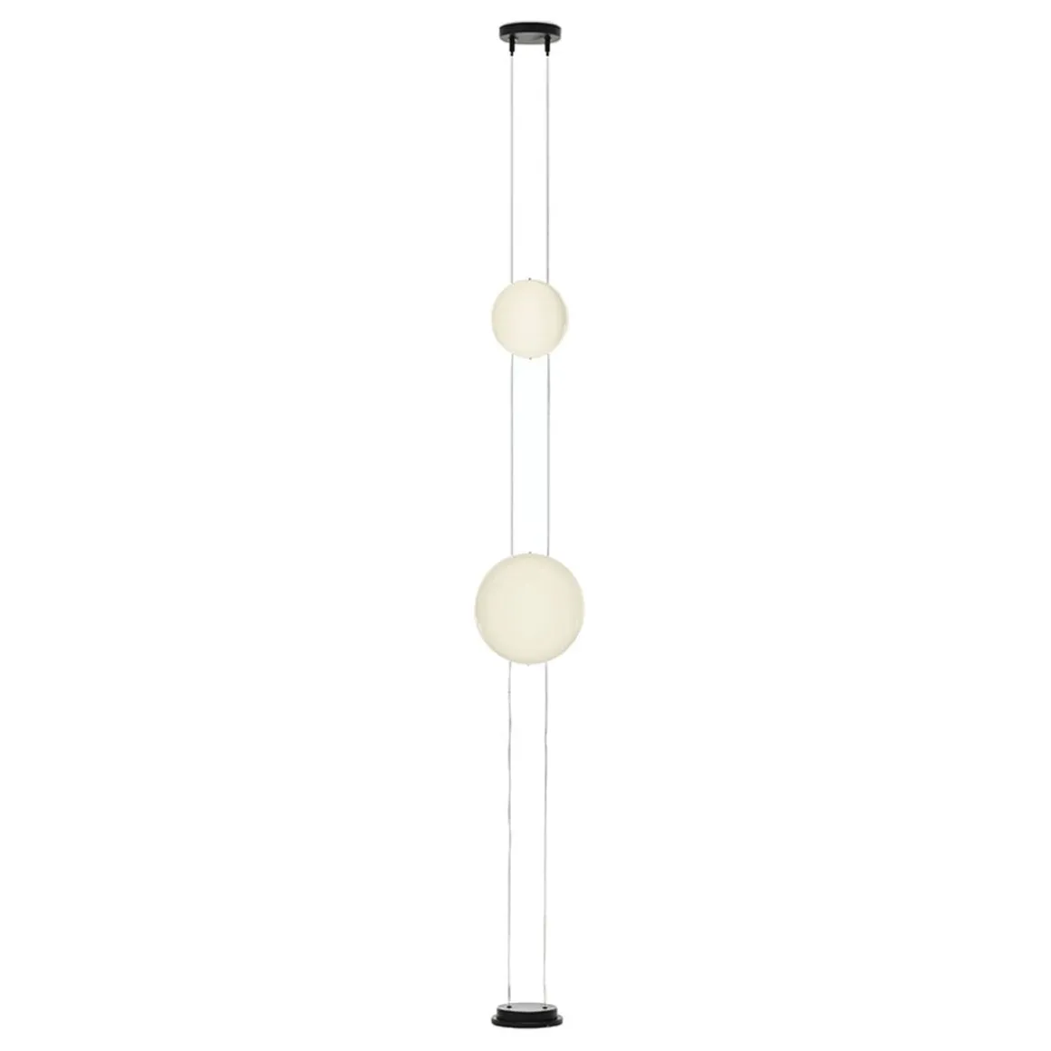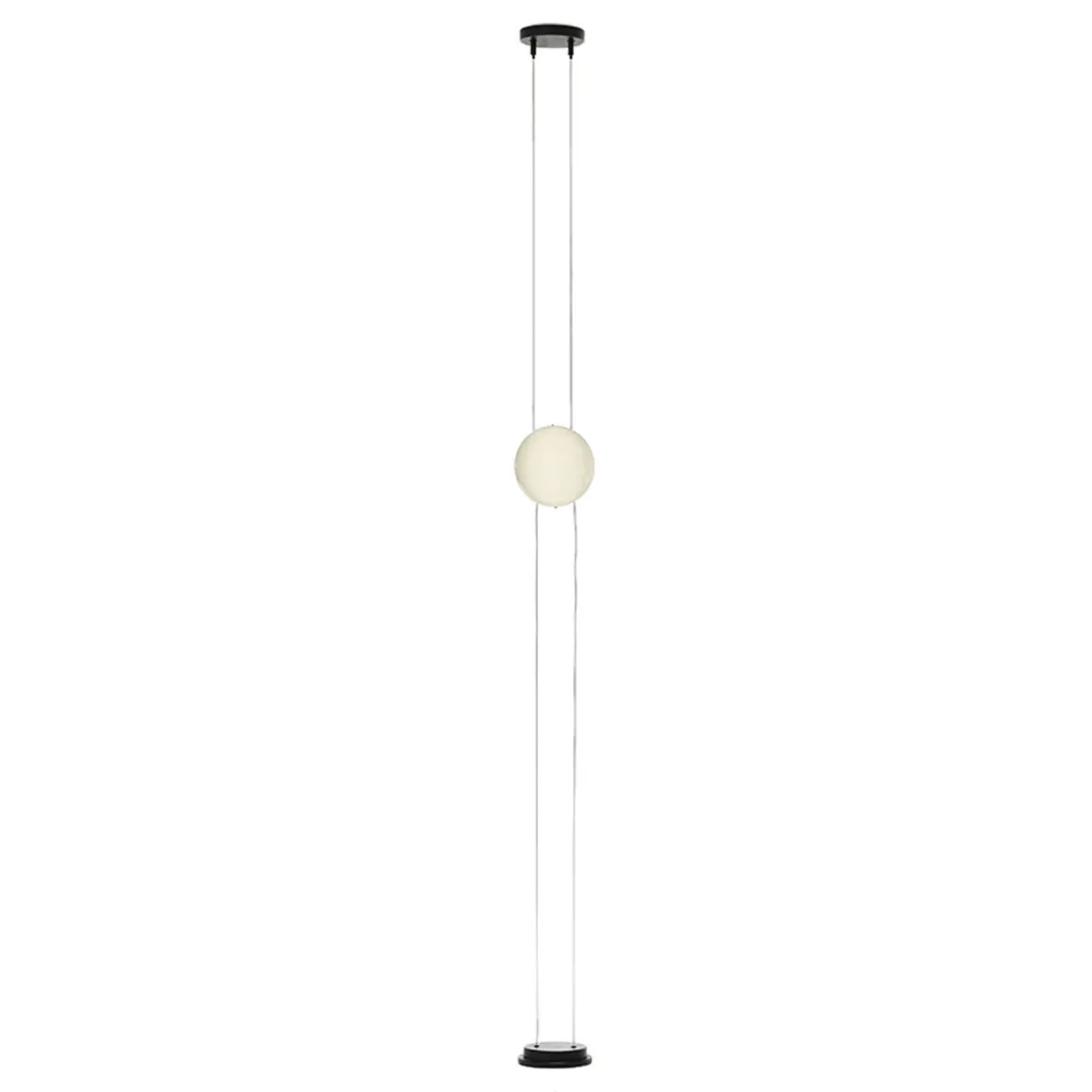 Plafonnier lampadaire à lumière diffuse. Le diffuseur sphérique coulisse sur des câbles parallèles qui le traversent comme des rails reliés sur sol au plafond. L’absence de câble d’alimentation rend le design d’Orbit extrêment épuré et essentiel. Comme le lever et le coucher du soleil, le lampe Orbit peut être réglée en hauteur et en intensité lumineuse pour créer différents scénarios d’éclairage.