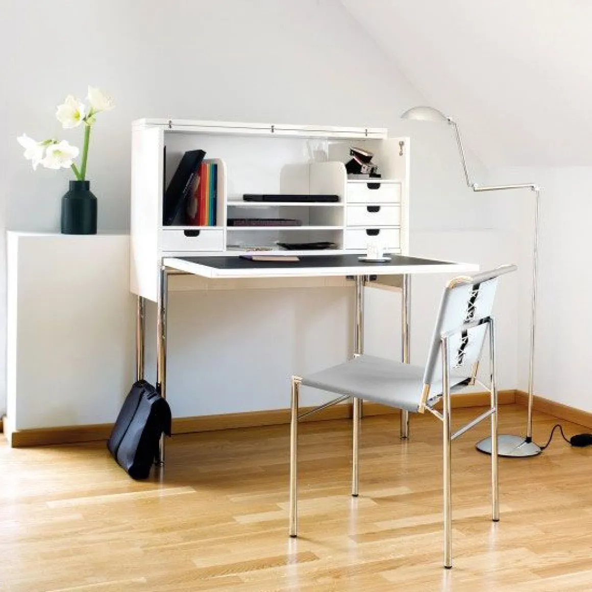 Ce secrétaire allie modernisme et tradition et s’intègre ainsi à différents types d’intérieur.