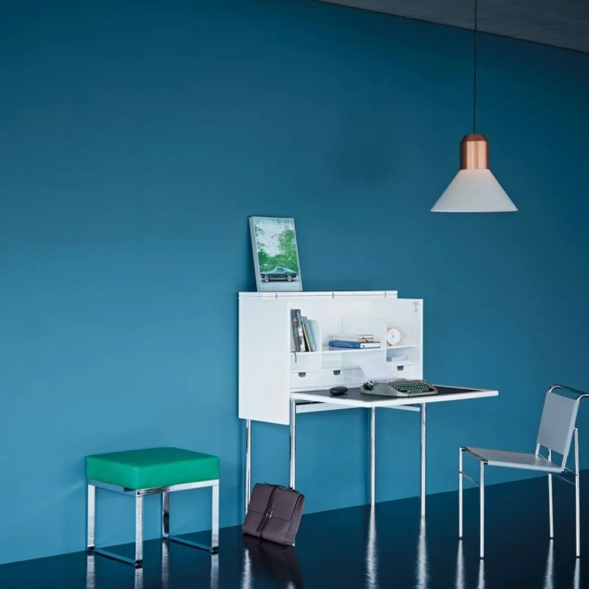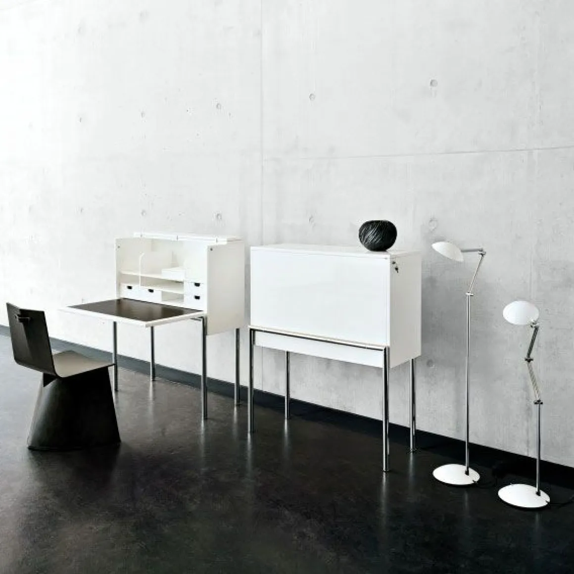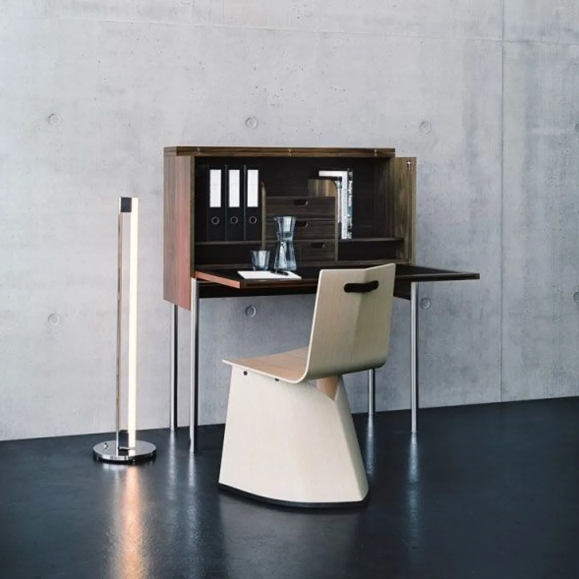 Konstantin Grcic a mis en scène l’aspect individualiste à travers le bureau Orcus. Très fonctionnel, Orcus est parfaitement adapté aux exigences actuelles et aux nouvelles technologies.