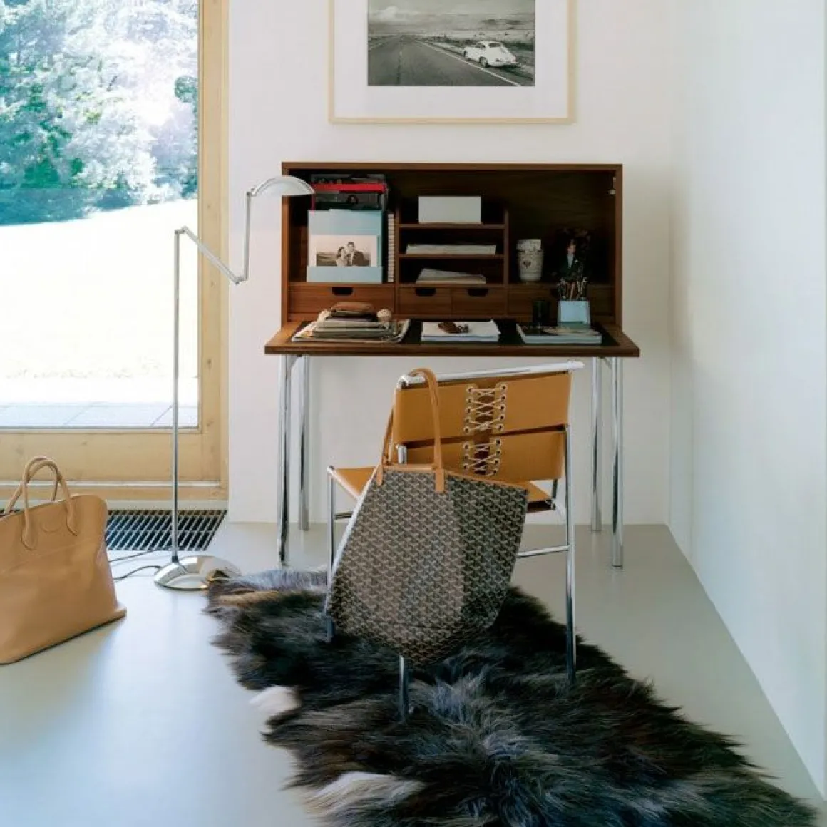 Le bureau Orcus combine bois et métal pour un rendu original : le contreplaqué de noyer est associé à une structure en tube d’acier chromé.