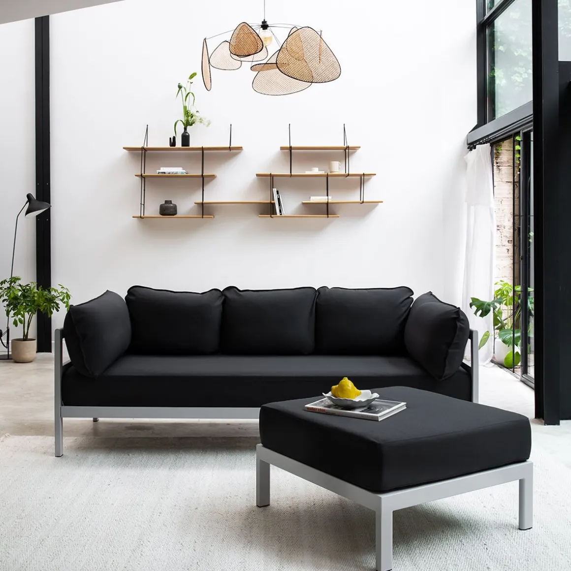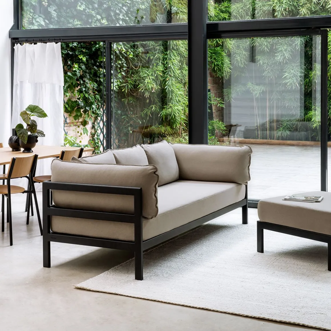 Matériaux : textile en polyester recyclé à partir de bouteilles en plastique, labellisé « OEKO-TEX 100 », coussins granit de flocons en mousse recyclé, structure en acier