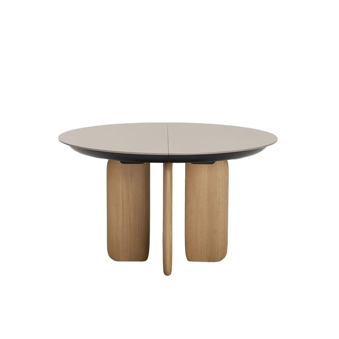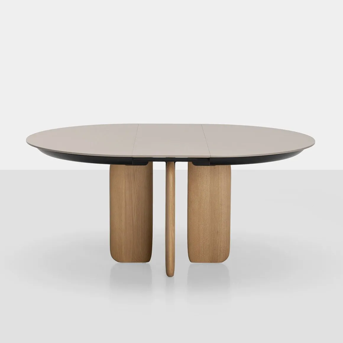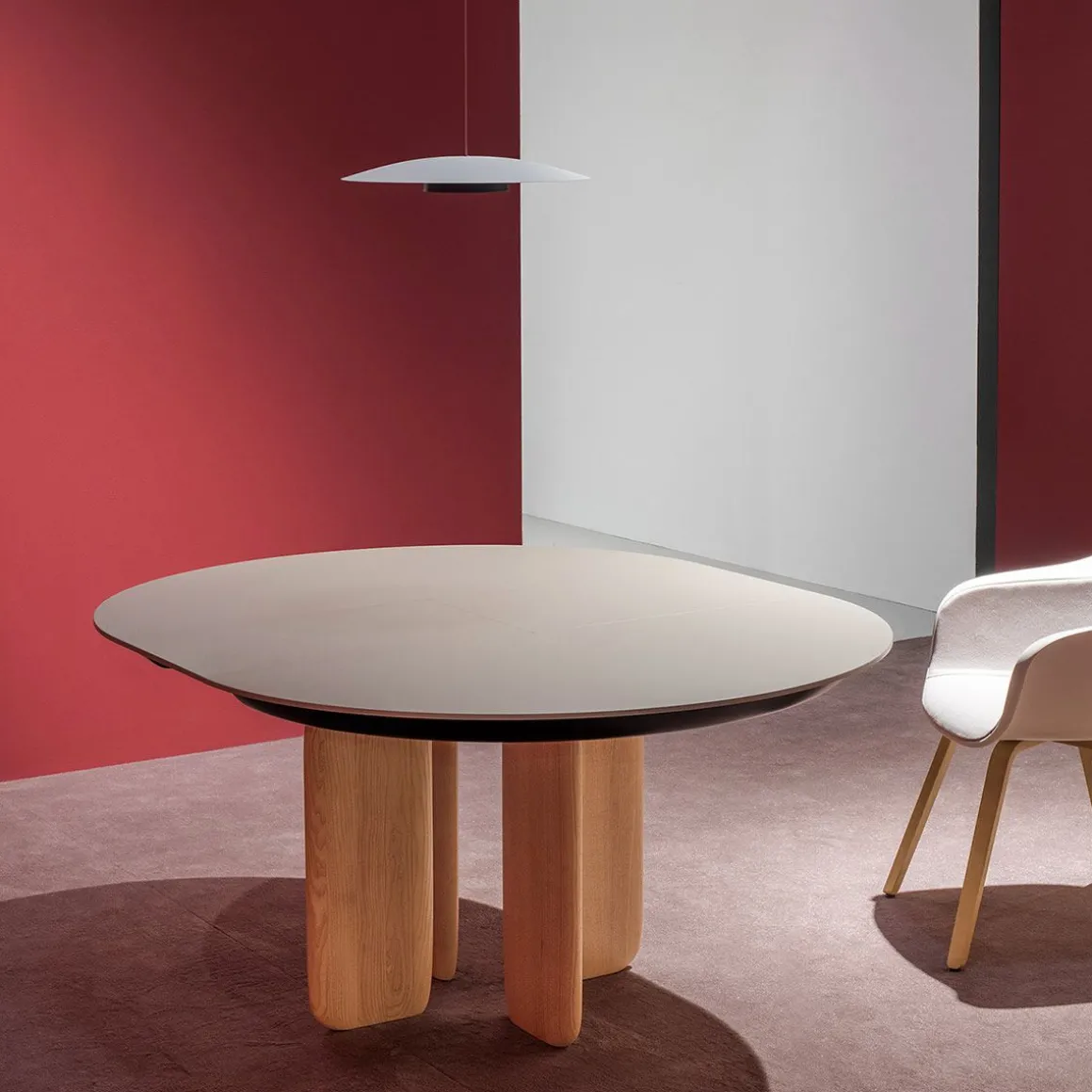 Pala de Kristalia par Monica Graffeo. Pala est un système de tables rondes et ovales dont le pied rappelle la lame du gouvernail. Disponible en version fixe, il se distingue par sa version extensible fluide et innovante, une caractéristique distinctive des collections de tables Kristalia.