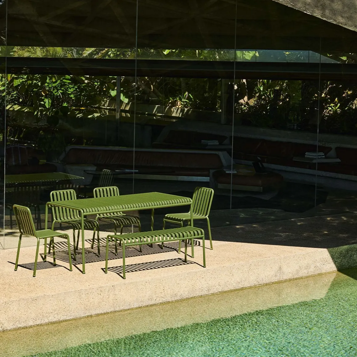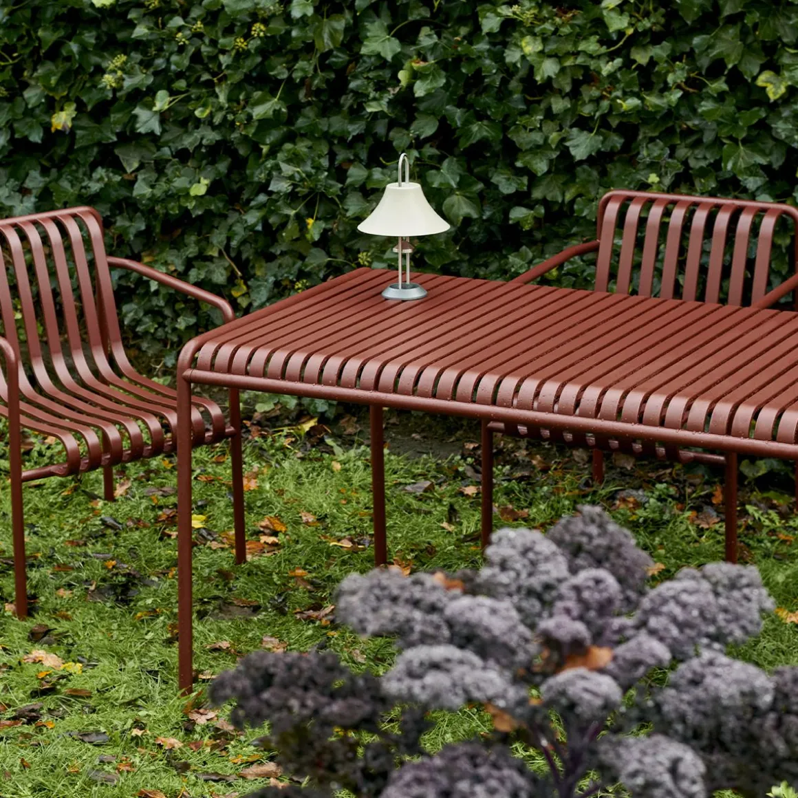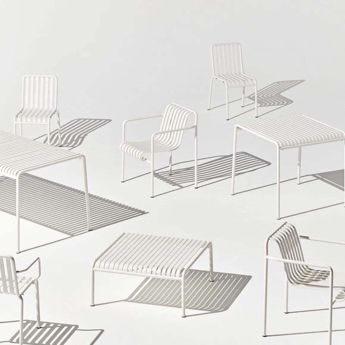 Palissade table de Hay. Palissade est une collection de mobilier d’extérieur conçue par Ronan et Erwan Bouroullec pour Hay. La collection a été conçue pour s’adapter à une grande variété d’environnements : cafés, restaurants, jardins, terrasses et balcons. La contractire permet un large éventail de typologie avec un langage formel commun. Des tabourets et des bancs aux chaises en passant par les tables, les chaises longues et les canapés, la collection comprends 13 éléments différents, unis non seulement par leur image graphique, mais également par leur caractéristiques communes : ils sont solides sans être volumineux, élégants sans être fragiles.