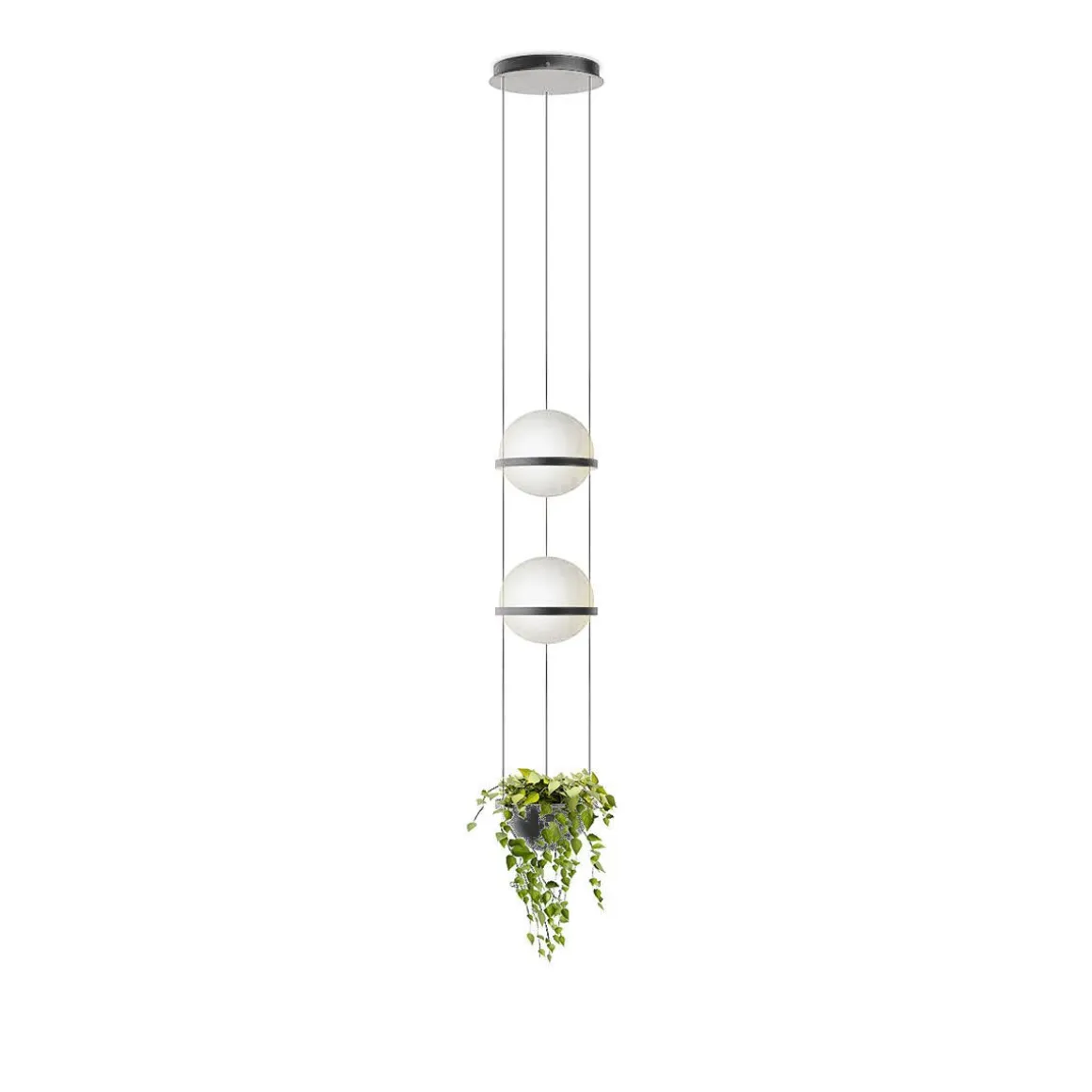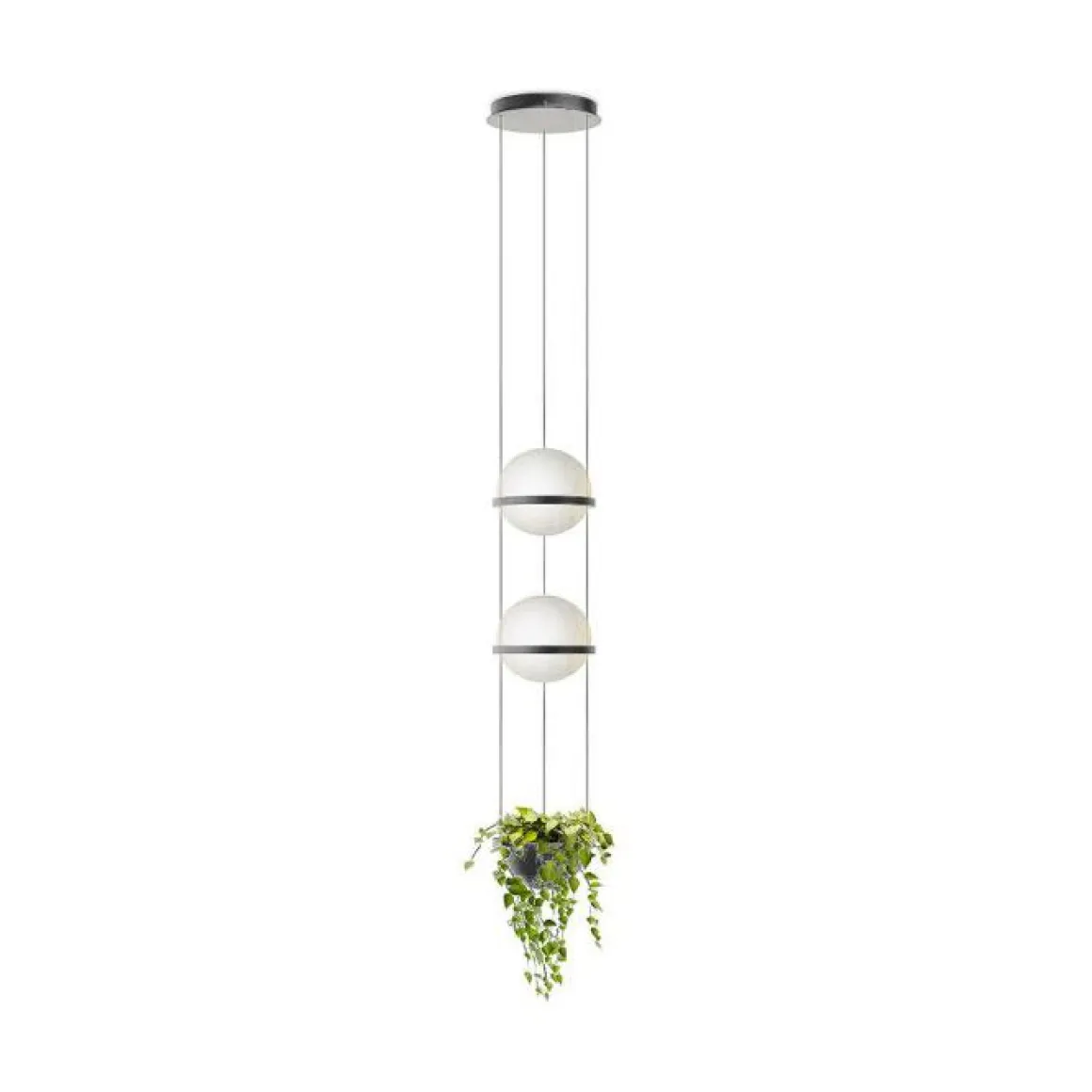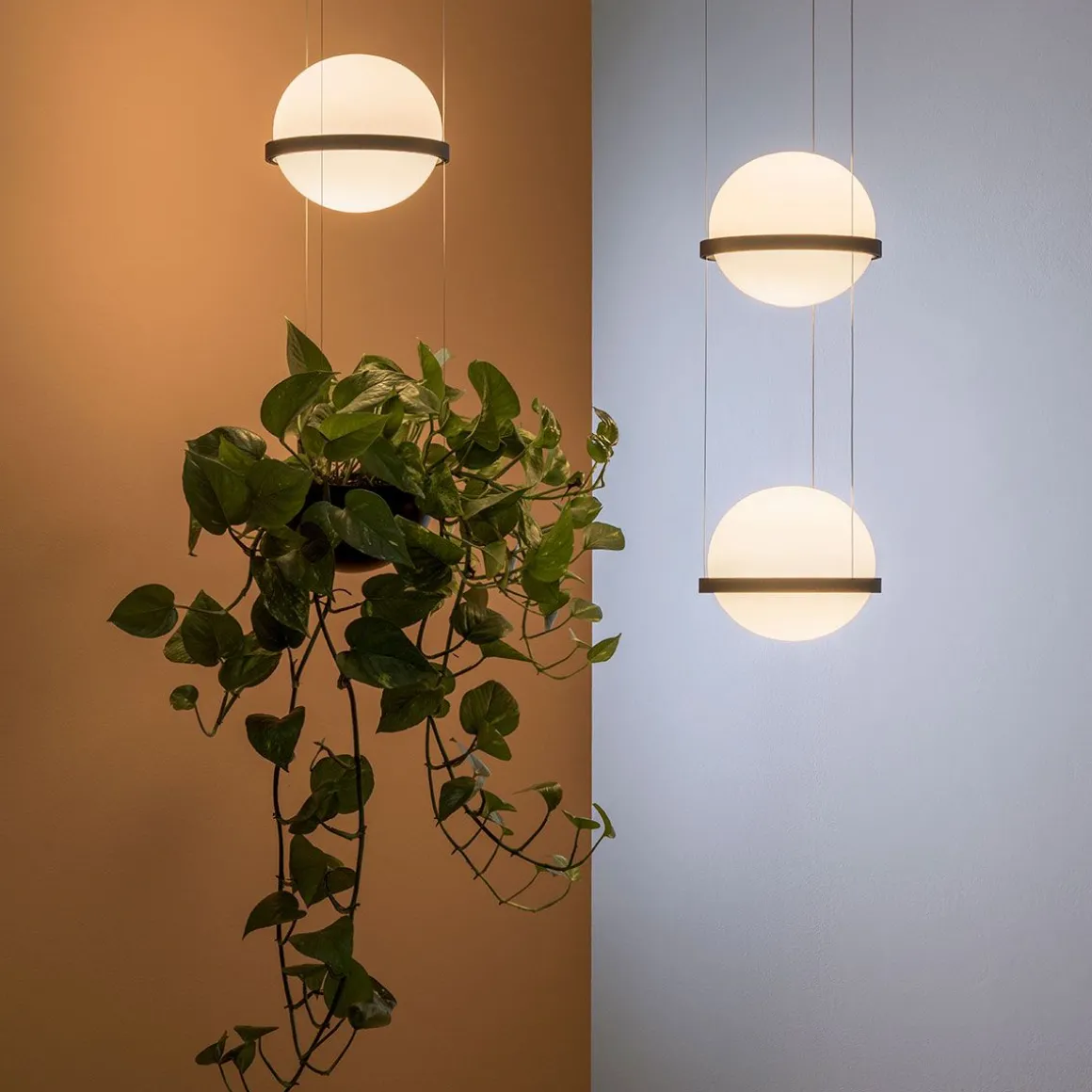 Antoni Arola considère Palma comme un projet d’aménagement paysager qui se transforme au fi l du temps une fois que le designer a terminé son travail. Le pouvoir qu’a Palma de créer une ambiance en intérieur se renforce à mesure qu’il s’étend comme un jardin suspendu lumineux. La boule en verre classique, légèrement écrasée, évolue vers l’organique et le système de câble invisible inédit de la version suspension accentue encore cette sensation de flottaison. Palma 3720 (modèle 1) se compose de deux demi-sphères en verre soufflé opalin réunies par un anneau et des structures en aluminium. Elle est équipée d’une source LED à intensité variable. Palma 3724 et 3728 (modèles 2 et 4) permettent d’intégrer des plantes dans les compositions d’éclairage pour que les intérieurs prennent vie. Quand aux Palma 3726 et 3730 (modèles 3 et 5), les combinaisons groupées semblent flotter dans l’air grâce au système de câblage et de suspension imperceptible et inédit, et aux anneaux qui rassemblent les deux parties de la sphère.