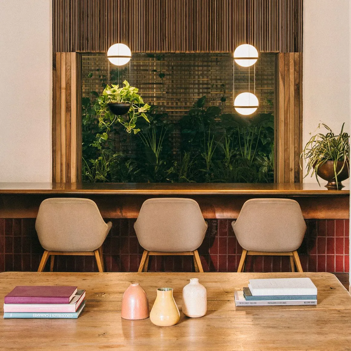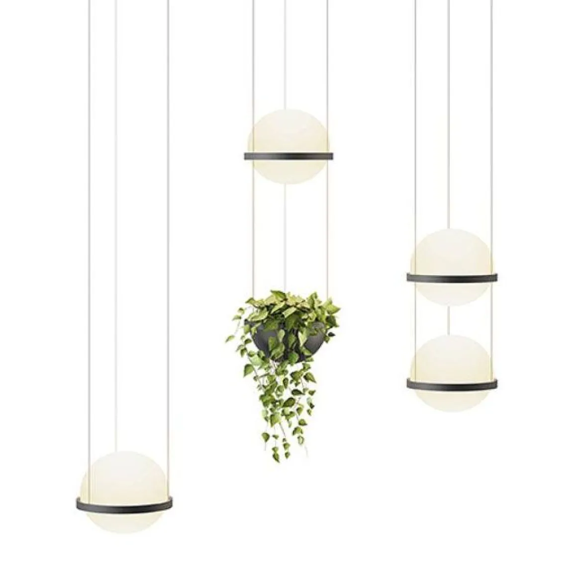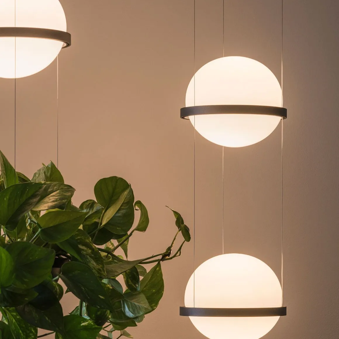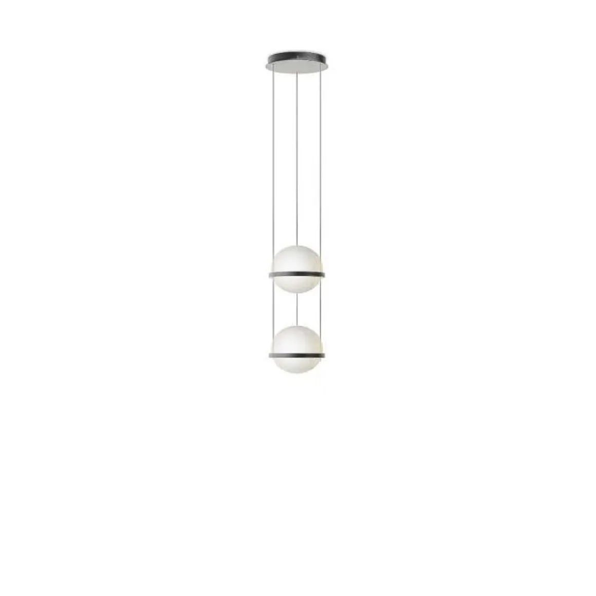 Antoni Arola considère Palma comme un projet d’aménagement paysager qui se transforme au fi l du temps une fois que le designer a terminé son travail. Le pouvoir qu’a Palma de créer une ambiance en intérieur se renforce à mesure qu’il s’étend comme un jardin suspendu lumineux. La boule en verre classique, légèrement écrasée, évolue vers l’organique et le système de câble invisible inédit de la version suspension accentue encore cette sensation de flottaison. Palma 3720 (modèle 1) se compose de deux demi-sphères en verre soufflé opalin réunies par un anneau et des structures en aluminium. Elle est équipée d’une source LED à intensité variable. Palma 3724 et 3728 (modèles 2 et 4) permettent d’intégrer des plantes dans les compositions d’éclairage pour que les intérieurs prennent vie. Quand aux Palma 3726 et 3730 (modèles 3 et 5), les combinaisons groupées semblent flotter dans l’air grâce au système de câblage et de suspension imperceptible et inédit, et aux anneaux qui rassemblent les deux parties de la sphère.