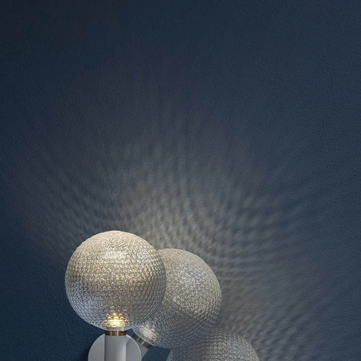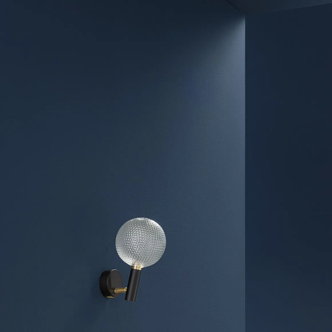 Les nouveaux modèles Par 18 de Catellani & Smith se caractérisent par des écrans en verre soufflé irrégulier. Cette texture exclusive, créée selon le design de Catellani & Smith par des maîtres verriers bohémiens et ressemblant joyeusement à une balle de golf, vise à maintenir la transparence du verre tout en générant une interaction distinctive de la lumière avec la surface irrégulière des sphères. L’applique Par 18 est disponible en deux finitions, blanche et noire, toutes deux avec des éléments en laiton. Grâce à la lumière émise par une LED COB basse tension, le Par 18 crée une lumière diffuse, ainsi qu’un motif d’ombre suggestif sur le mur ou le plafond, grâce à la surface irrégulière de la sphère en verre de 16 cm. L’articulation en laiton sur la base permet une rotation de la sphère à 350° sur l’axe horizontal et jusqu’à 90° sur l’axe vertical ; le faisceau lumineux peut être ajusté dans la direction désirée et recréer des effets lumineux suggestifs sur le mur.