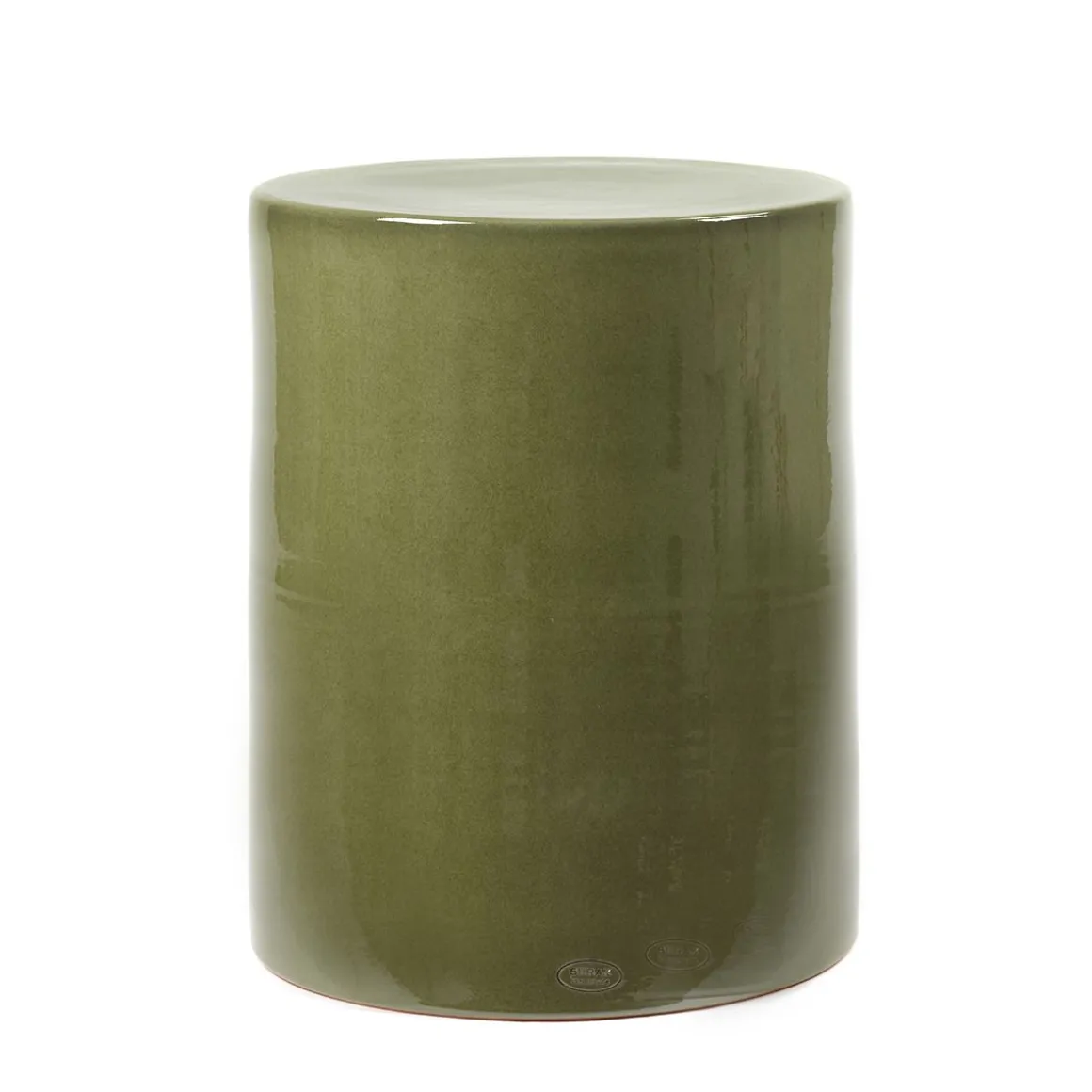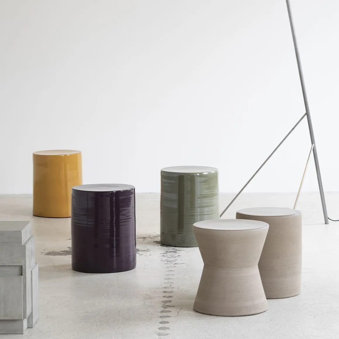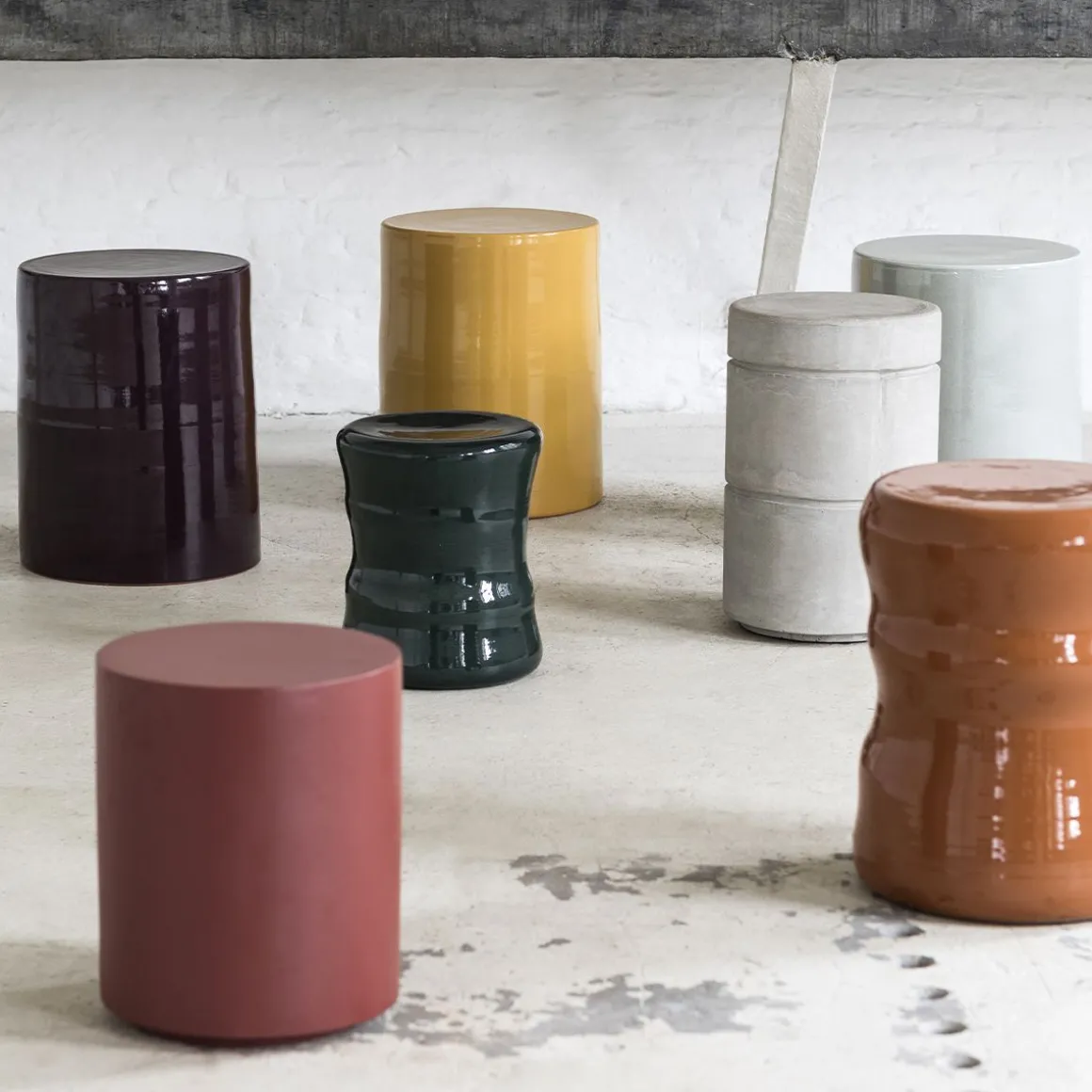 Table d’appoint et tabouret faits à la main en grès à la signature immanquable. Cette table d’appoint affiche une forte personnalité éclectique et se compose d’un assemblage de figures géométriques, de matériaux et de couleurs qui portent indubitablement sa signature.