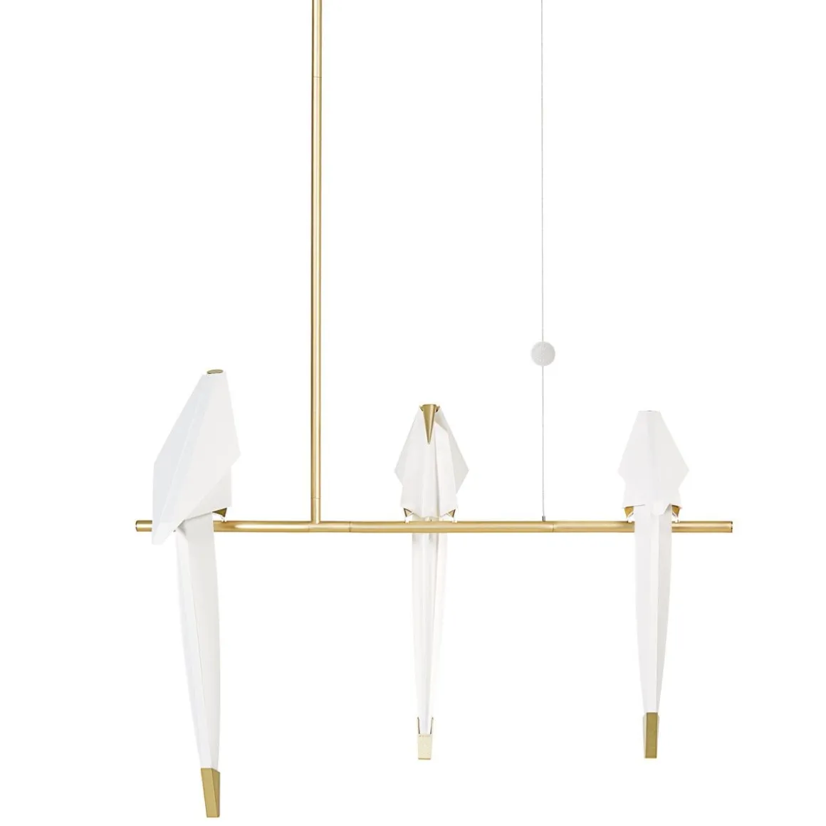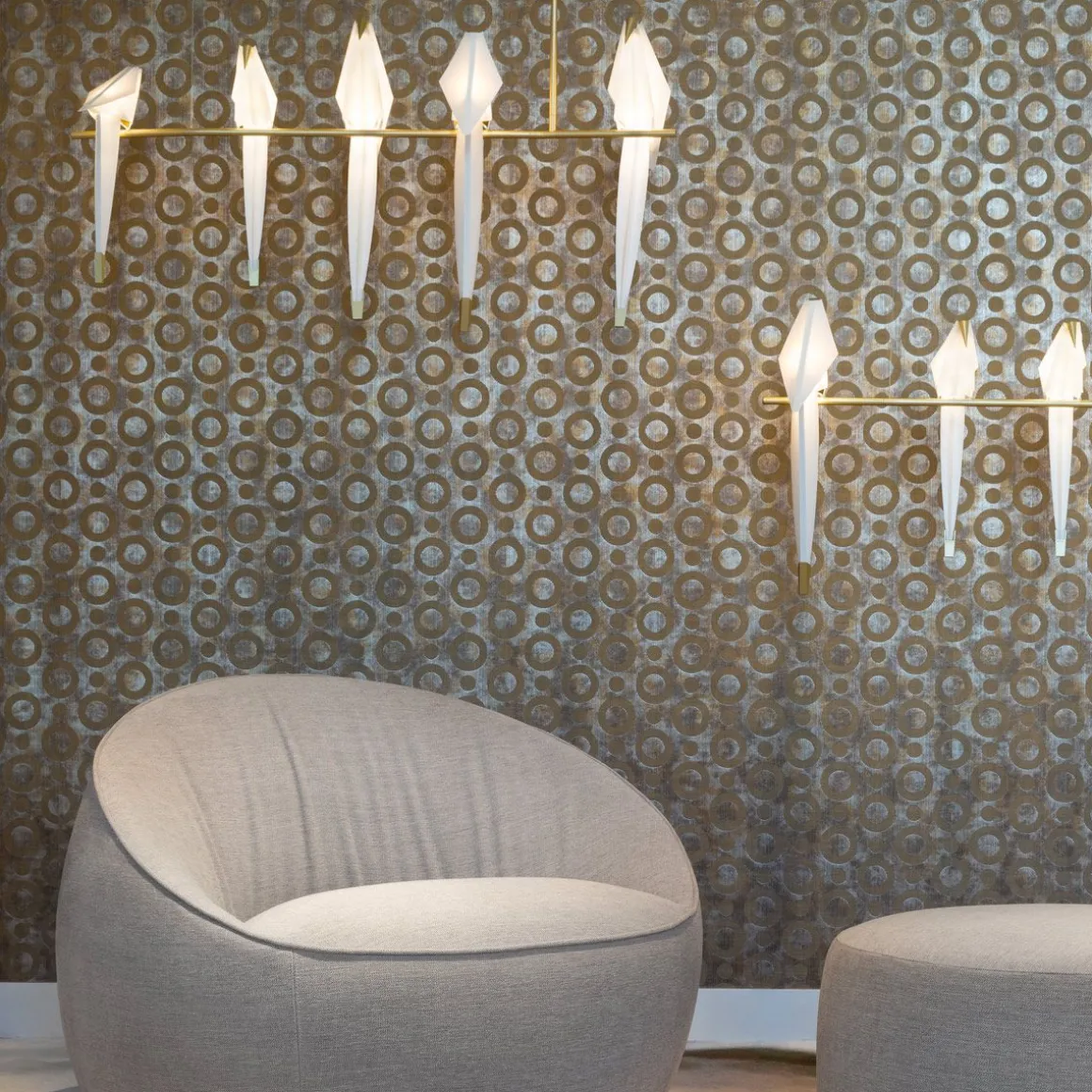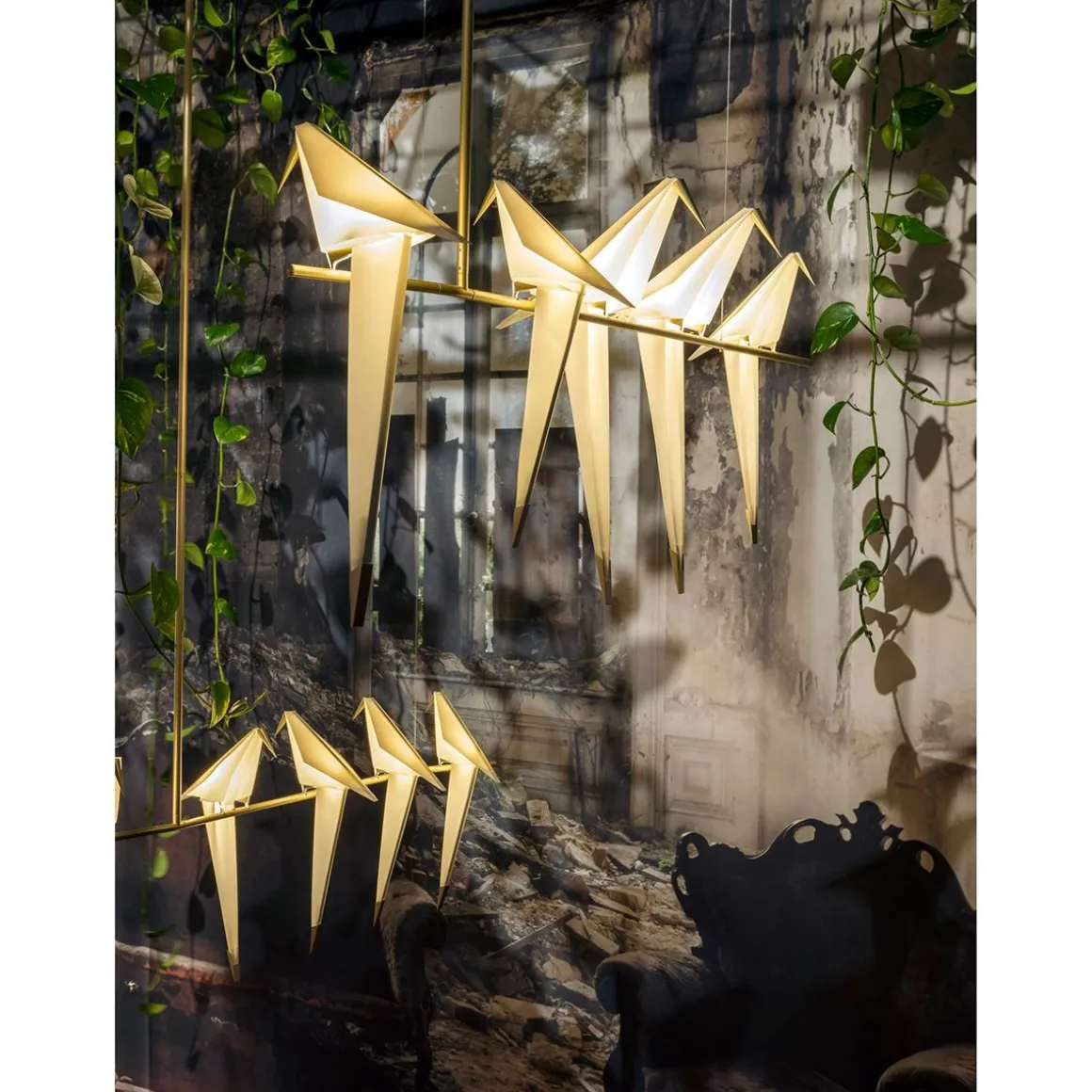 Quoi de plus poétique et d’une élégance captivante qu’un oiseau perché sur une branche, flirtant, chantant et célébrant la vie? Nous reconnaissons tous cette image et volons un moment de notre temps précieux pour admirer ce triomphe de la nature et de la beauté. Inspiré par une telle gloire naturelle et fasciné pour toujours par la combinaison de l’équilibre et du mouvement, Umut Yamac a créé la famille Perch Light. Une série de lampes abstraites sculpturales, en papier plié et laiton, se dévoilent sur leurs perchoirs métalliques, comme des oiseaux gracieusement balancés sur une branche. Ces oiseaux ensoleillés sont libres de se balancer lorsqu’ils sont doucement touchés, brillants et apportant la promesse du printemps.