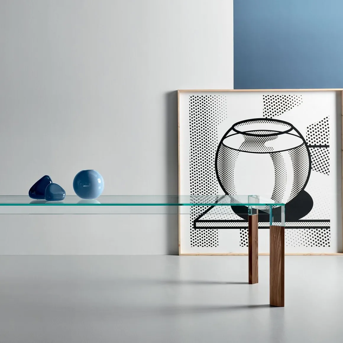 Une table à manger classique où le verre et le bois s’entraident et se mettent en valeur. Les lignes constructives de la structure deviennent visibles grâce à la transparence du cristal, tandis que le bois nous rappelle des souvenirs architecturaux et soutient la versatilité qualifiée du produit dans son environnement.