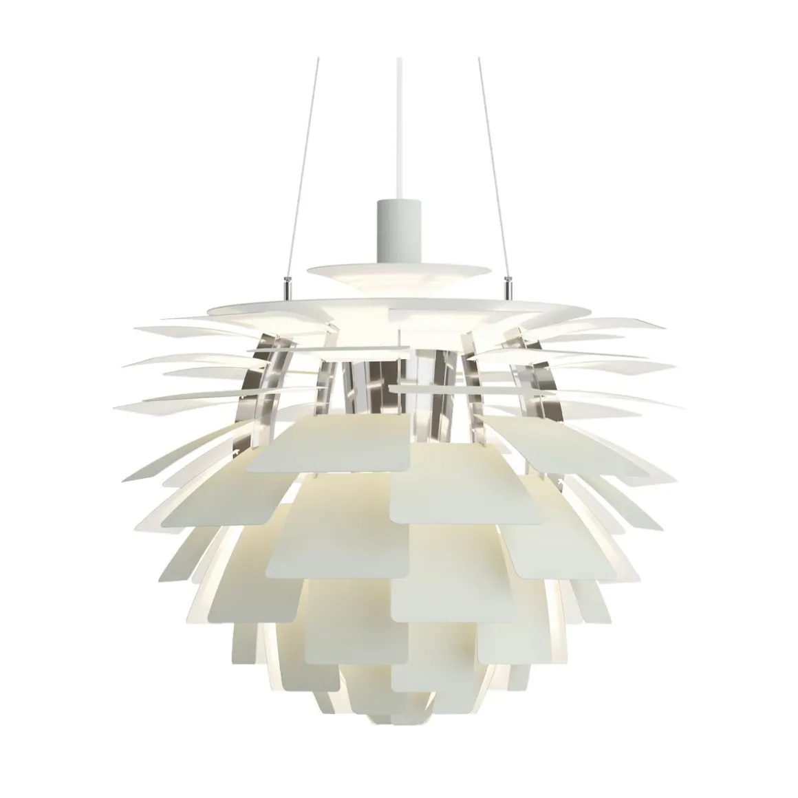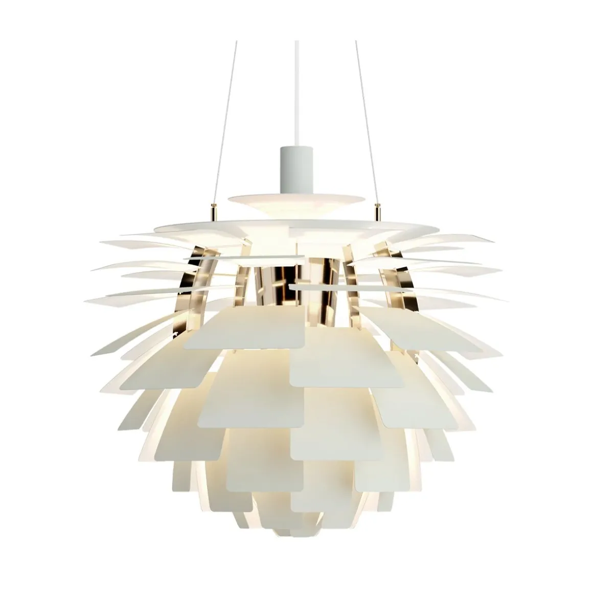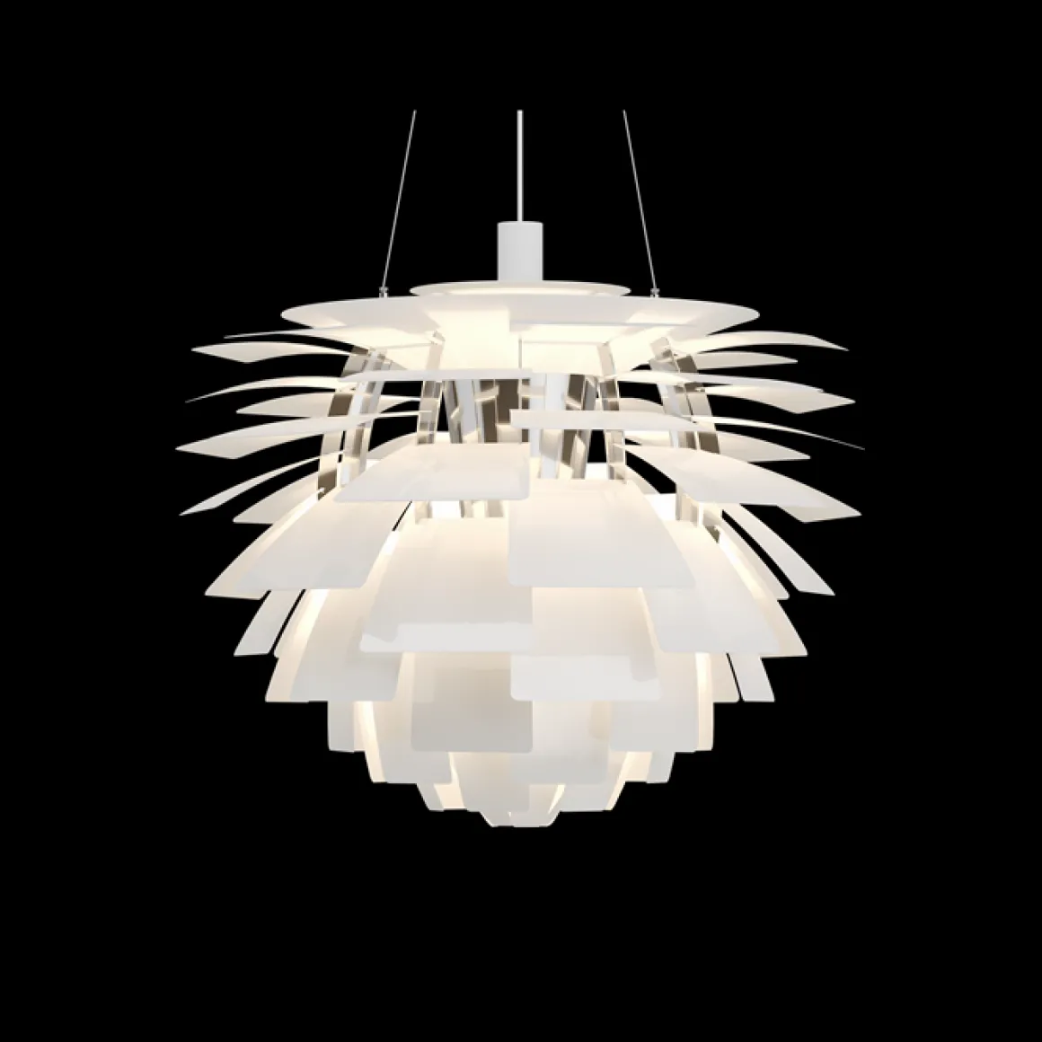 PH Artichoke de Louis Poulsen par Poul Henningsen. La suspension Artichoke, PH Pomme de Pin est connue dans le monde entier par son style sculptural unique. Réalisée par Poul Henningsen il y a plus de 40 ans elle a obtenu le statut d’icône en matière de design. Le luminaire se compose de 12 fois 6 lamelles qui dirigent la lumière de façon à la fois à éclairer le luminaire même et à émettre une lumière unique et 100 % anti-éblouissante. Le PH Pomme de Pin a été développé à l’origine pour un restaurant de Copenhague nommé le Pavillon Langelinie, où vous pouvez encore l’admirer aujourd’hui.