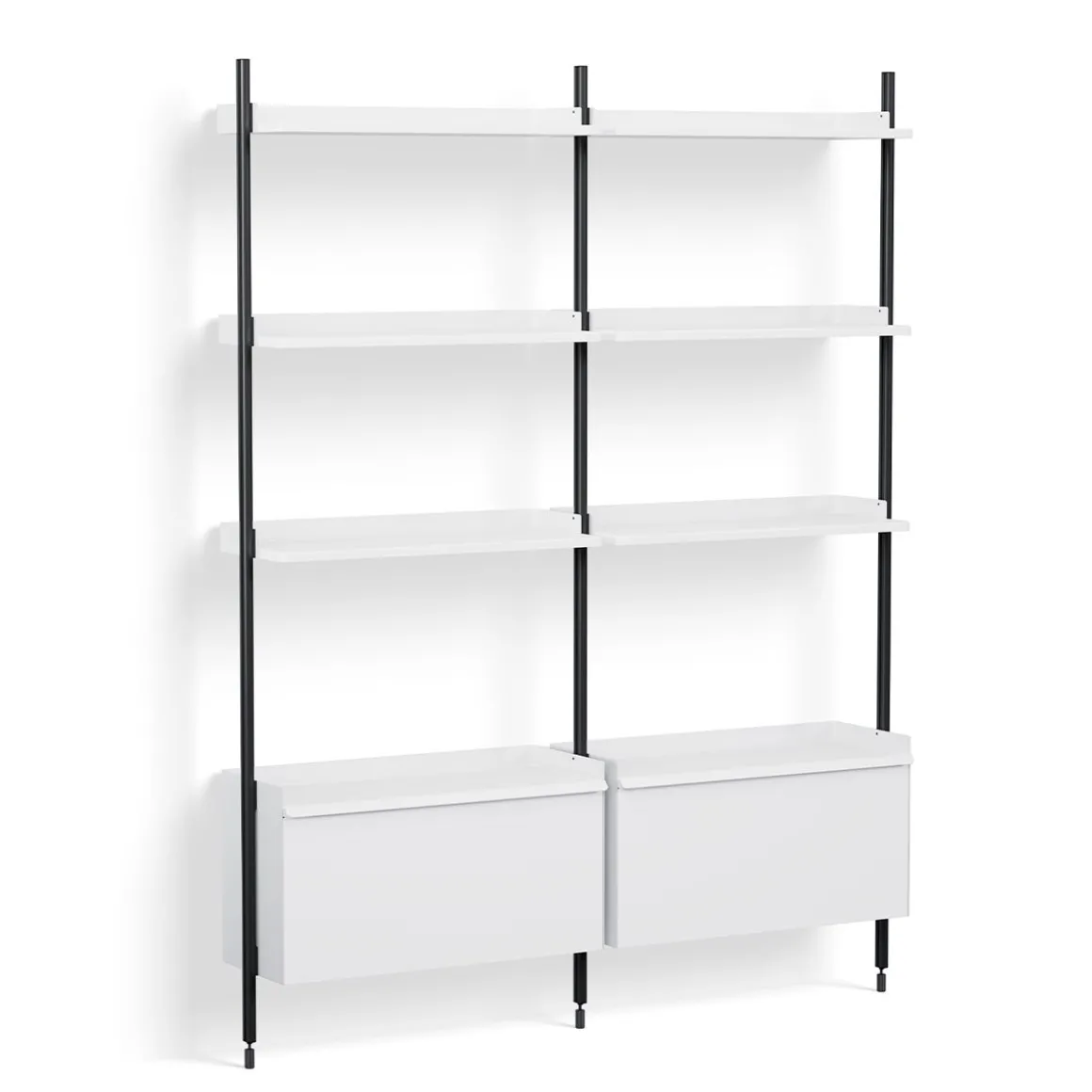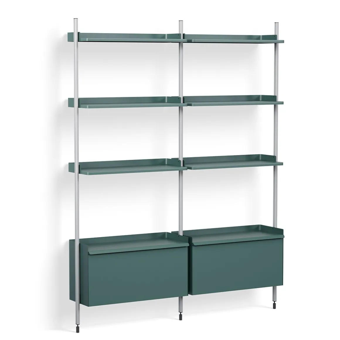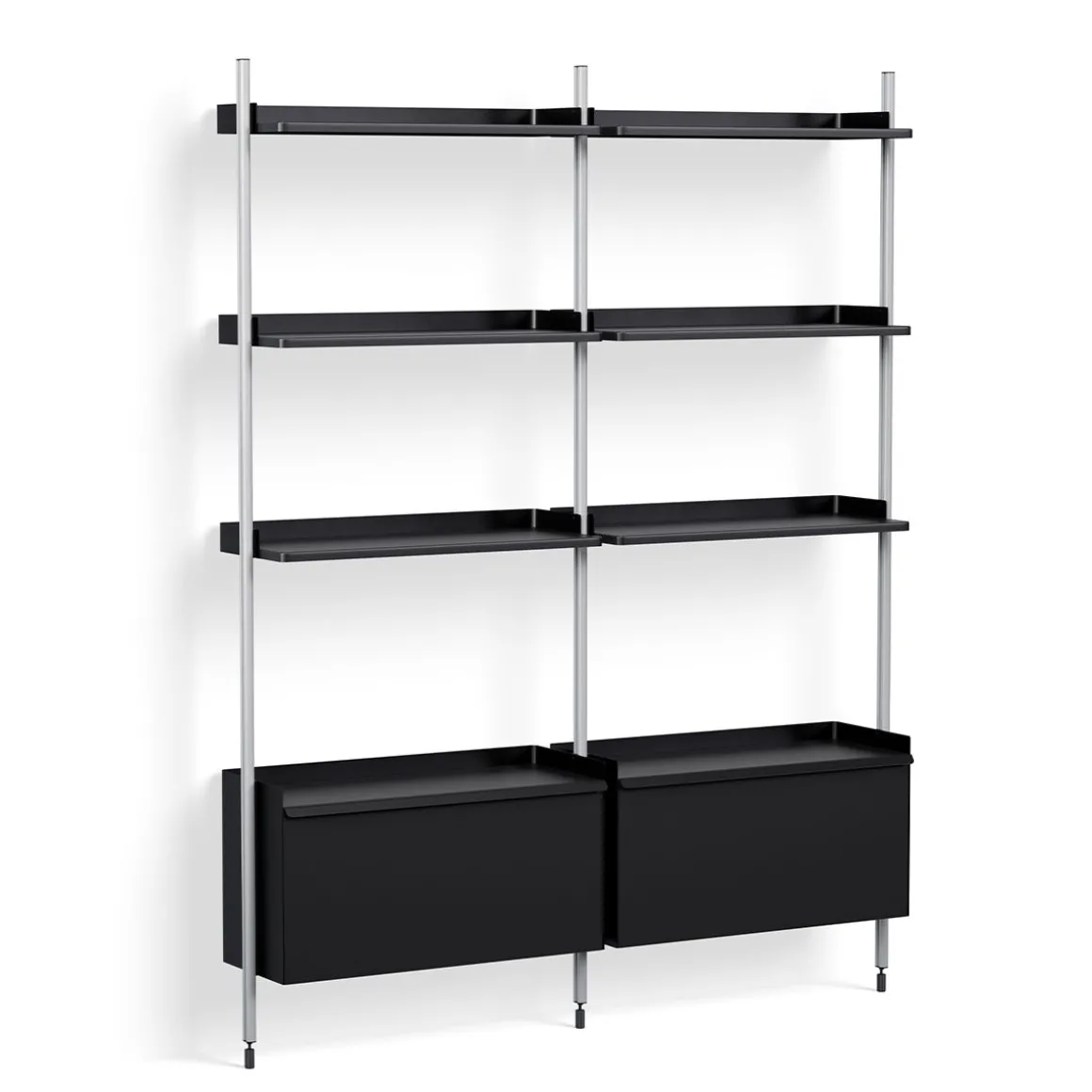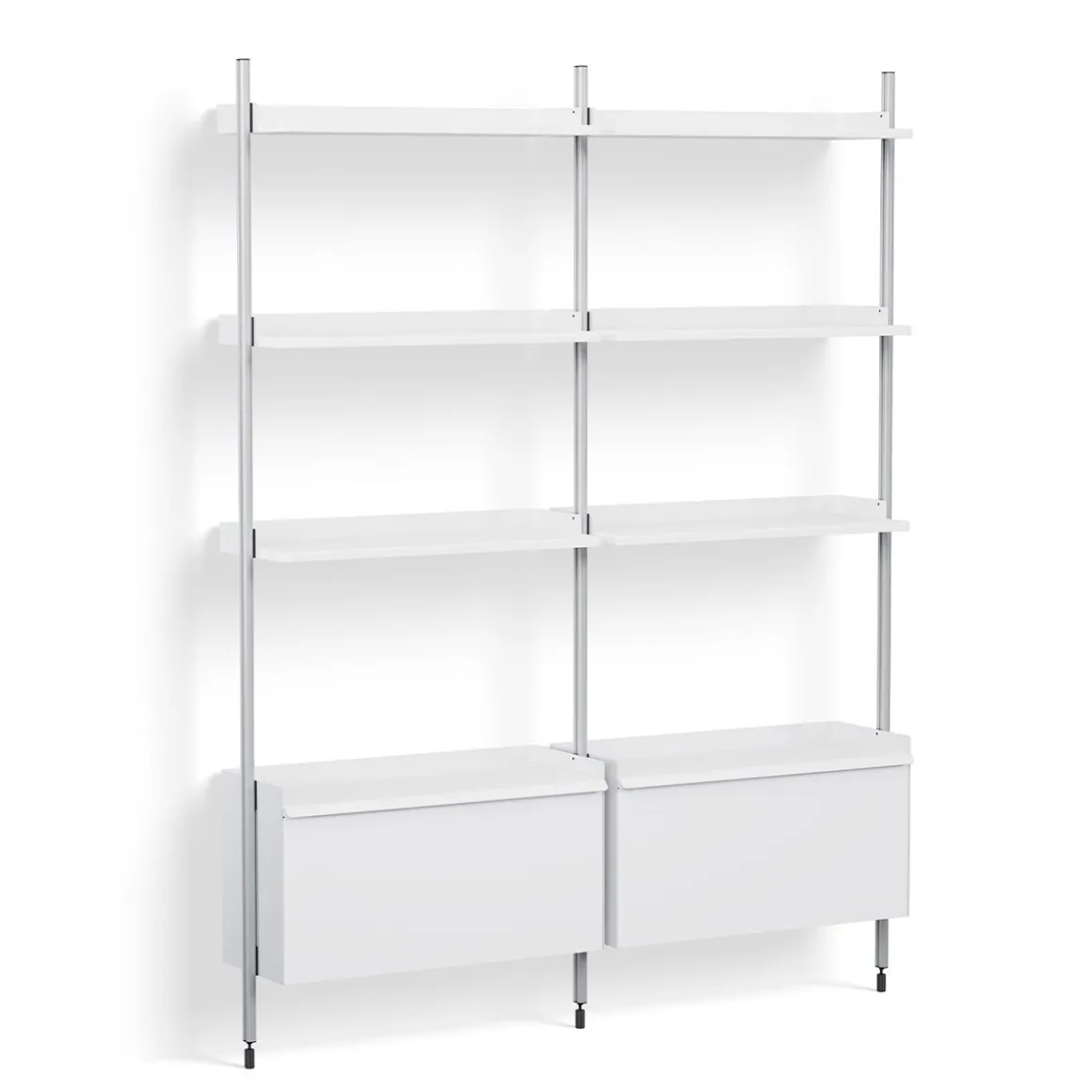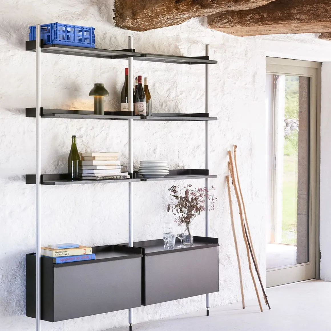 Pier System 132 2 Columns de Hay. Conçu par les designers français Ronan et Erwan Bouroullec, Pier System est un système de rangement multifonctionnel développé pour s’adapter aux exigences du style de vie moderne. Doté d’un design plat facile à assembler, à reconfigurer et à recycler, la construction simple offre une solution de rayonnage flexible pour organiser et stocker une multitude d’articles. Construit à partir d’aluminium léger et d’acier en utilisant le nombre minimum de composants requis pour créer un système de stockage complet, Pier System est disponible dans une variété de couleurs et de configurations d’ensemble qui peuvent être combinées les unes avec les autres. Les éléments qui font partie de ces configurations peuvent être déplacés selon les besoins et les envies, permettant à l’utilisateur d’intégrer des fonctions de travail, de garde-robe ou d’organisation dans la plupart des pièces et des environnements, des salons et chambres aux halls d’entrée et aux bureaux.