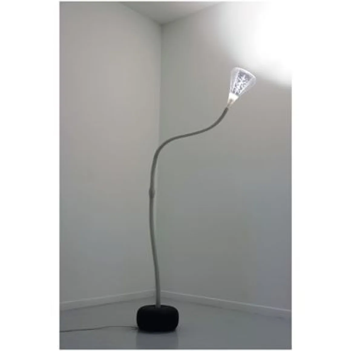 Le lampadaire Pipe Artemide est constitué d’un tube en acier, rigide dans sa partie inférieure et flexible dans sa partie supérieure. La tige est revêtue d’une gaine en silicone naturelle transparente (anti jaunissement) et terminée par un diffuseur de forme conique. Le diffuseur est en polycarbonate verni transparent. Le reflecteur interne est en aluminium spéculaire comprenant de petites perforations. La base est acier verni peint en noir effet « soft touch ». Emission directe orientable et diffuse.