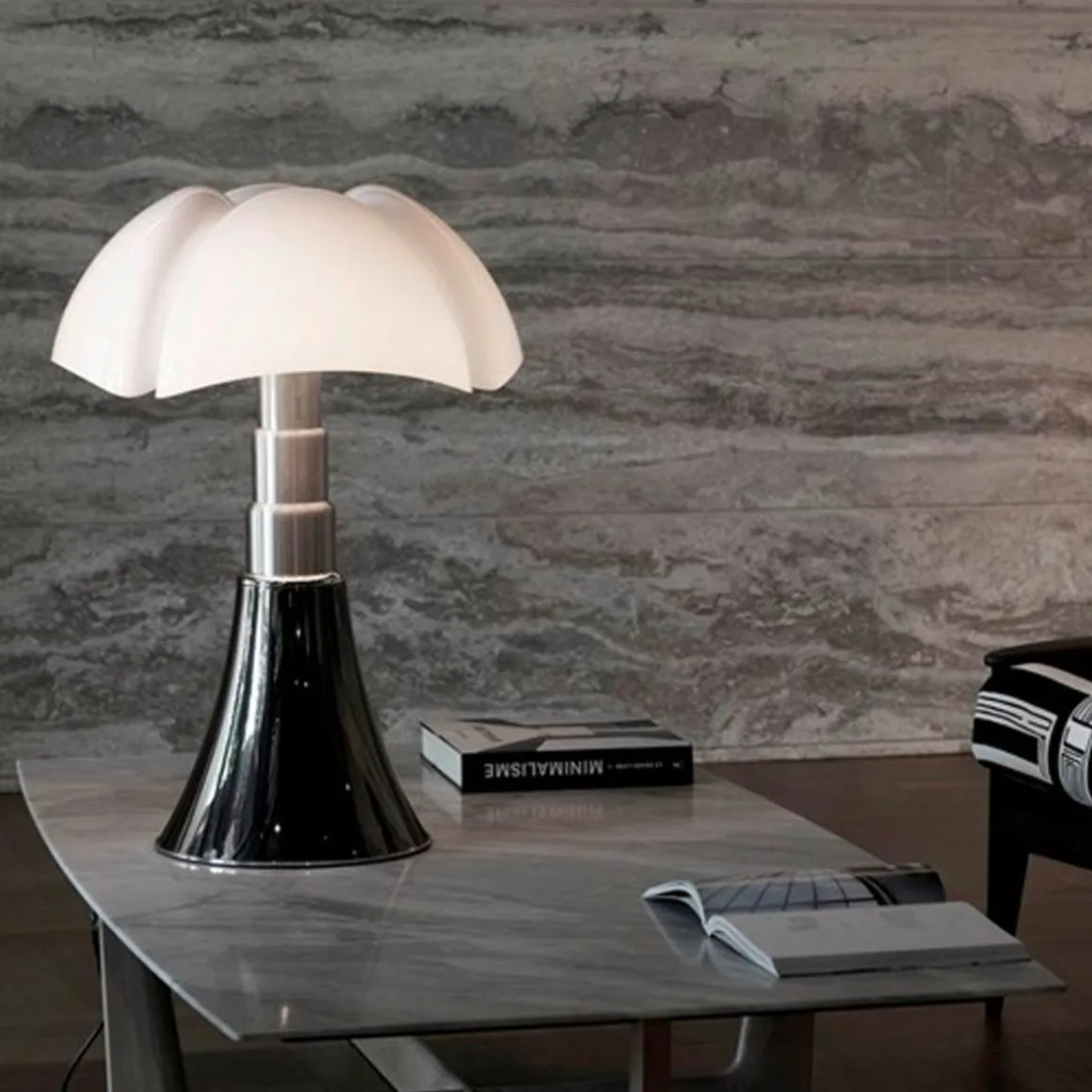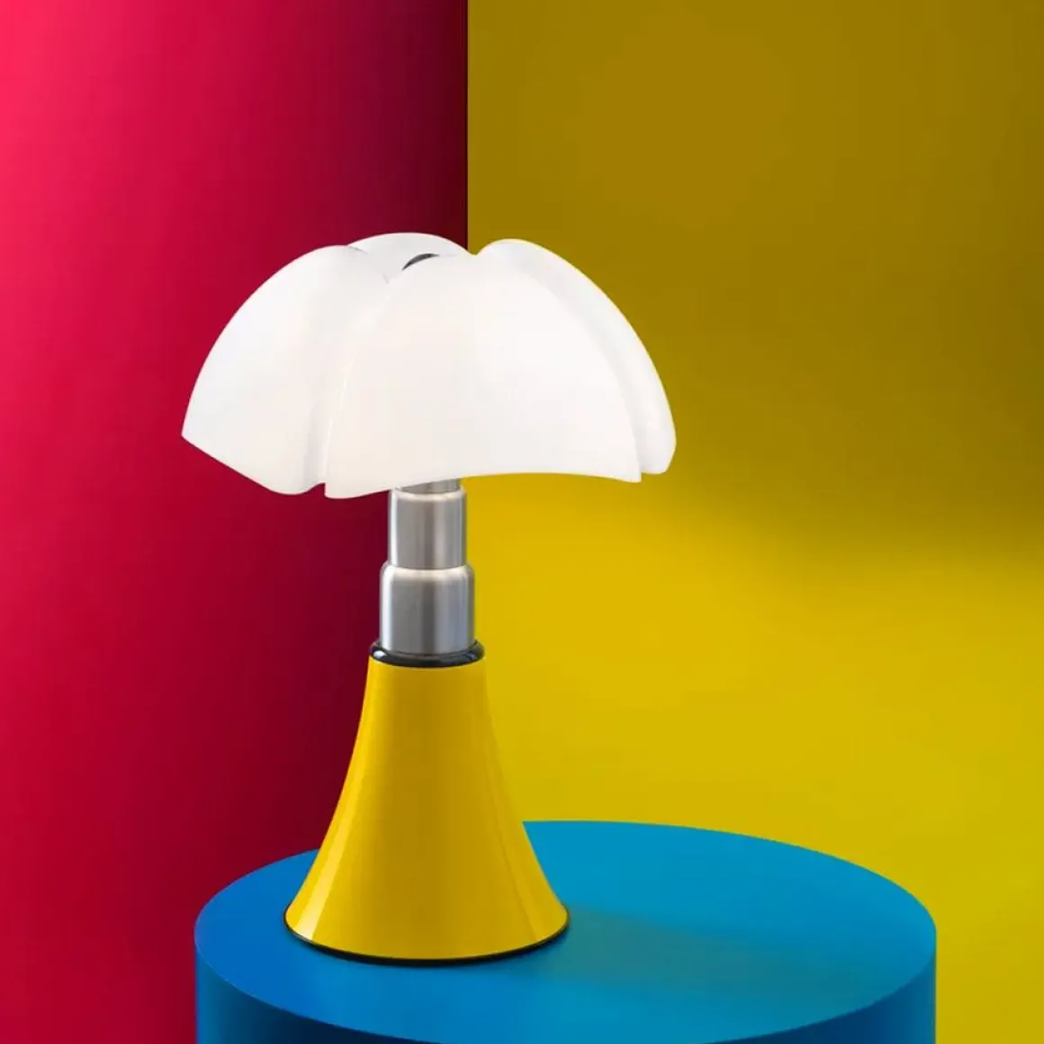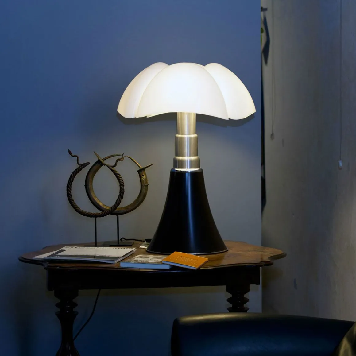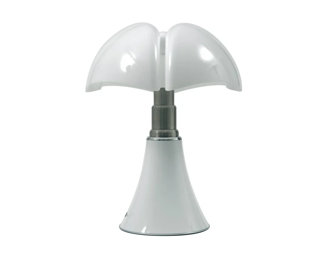 Lampe Pipistrello LED grand modèle réglable en hauteur grâce à un mouvement télescopique, équipé d’un système d’éclairage LED intégré, la célèbre lampe Pipistrello a été exposée dans les plus grands musées du monde entier et est devenue un objet culte du design. C’est une lampe de table ou de sol. Le diffuseur en forme de chauve-souris (ce que signifie pipistrello en italien) émet une lumière diffuse. La lampe Pipistrello de Martinelli fait partie de ces objets culte qui constitue notre patrimoine universel.