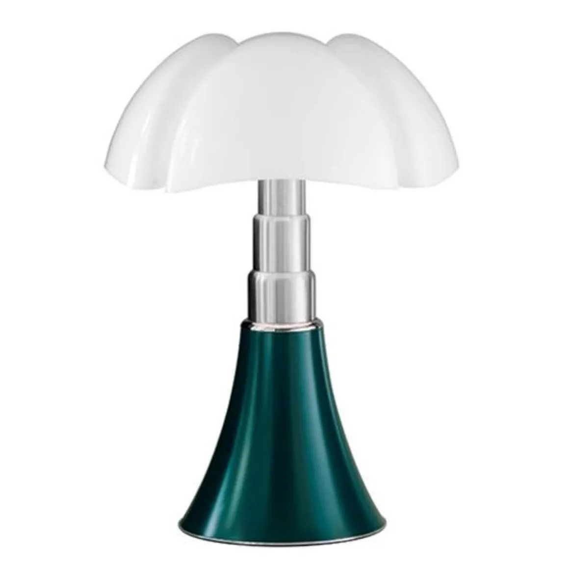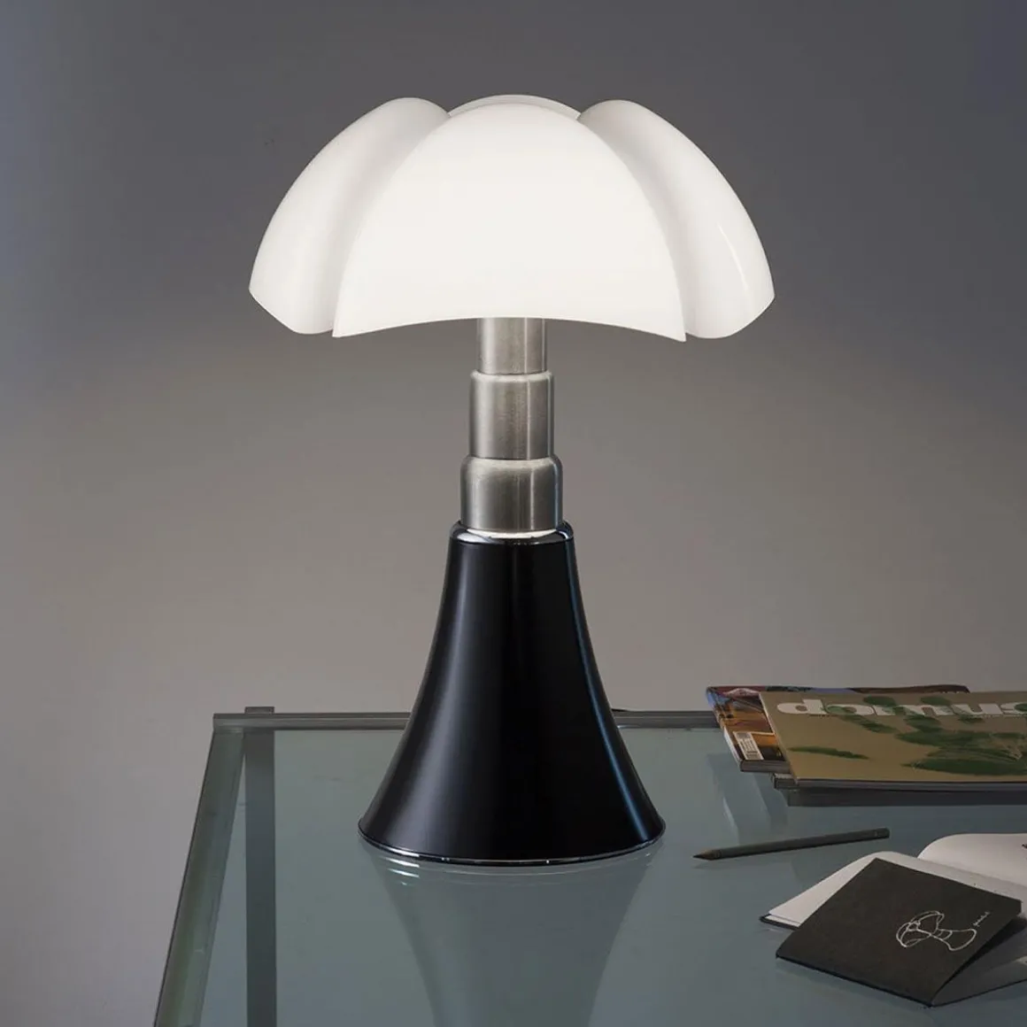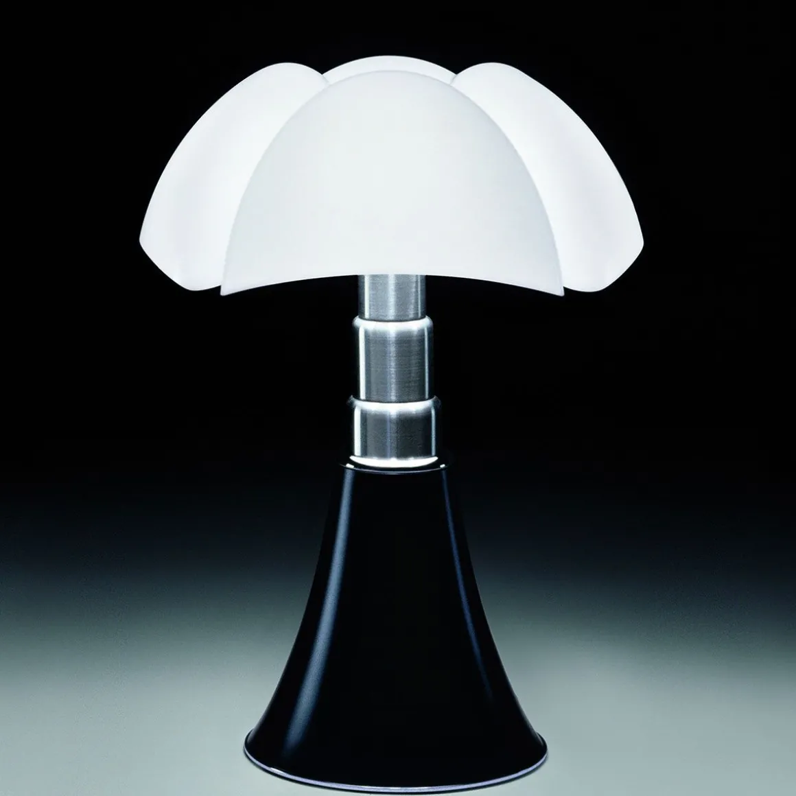 Lampe pipistrello en version de taille moyenne, équipé d’un système d’éclairage LED intégré. Pipistrello est une lampe culte du designer Gae Aulenti, la célèbre lampe Pipistrello a été exposée dans les plus grands musées du monde entier et est devenue un objet culte du design. C’est une lampe de table ou de sol. Le diffuseur en forme de chauve-souris (ce que signifie pipistrello en italien) émet une lumière diffuse. Pipistrello est réglable en hauteur grâce à un mouvement télescopique. Lampe authentique accompagnée d’un certificat d’authenticité MARTINELLI LUCE. Modèle original fabriqué en Italie par l’usine Martinelli Luce.