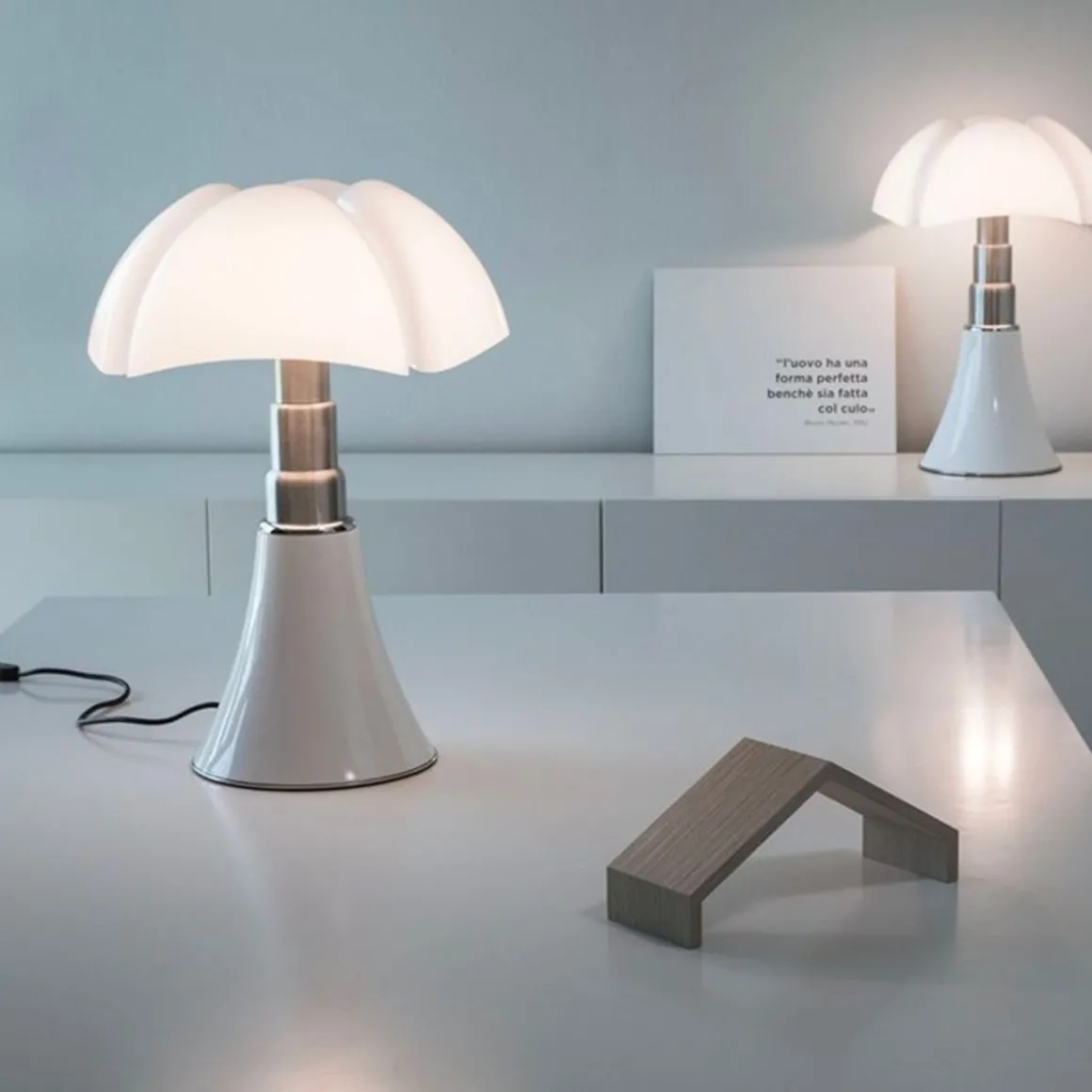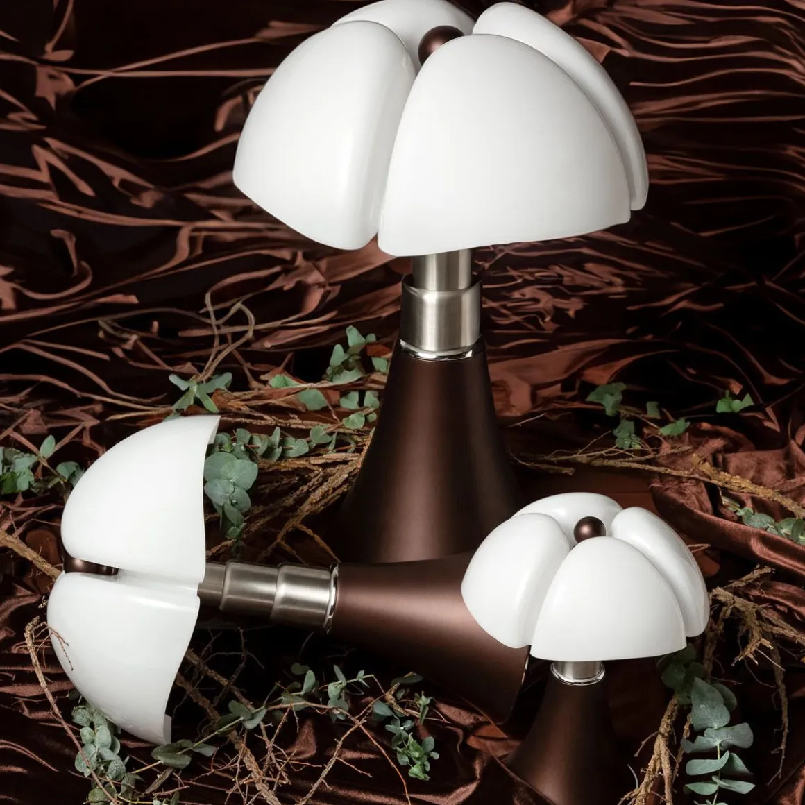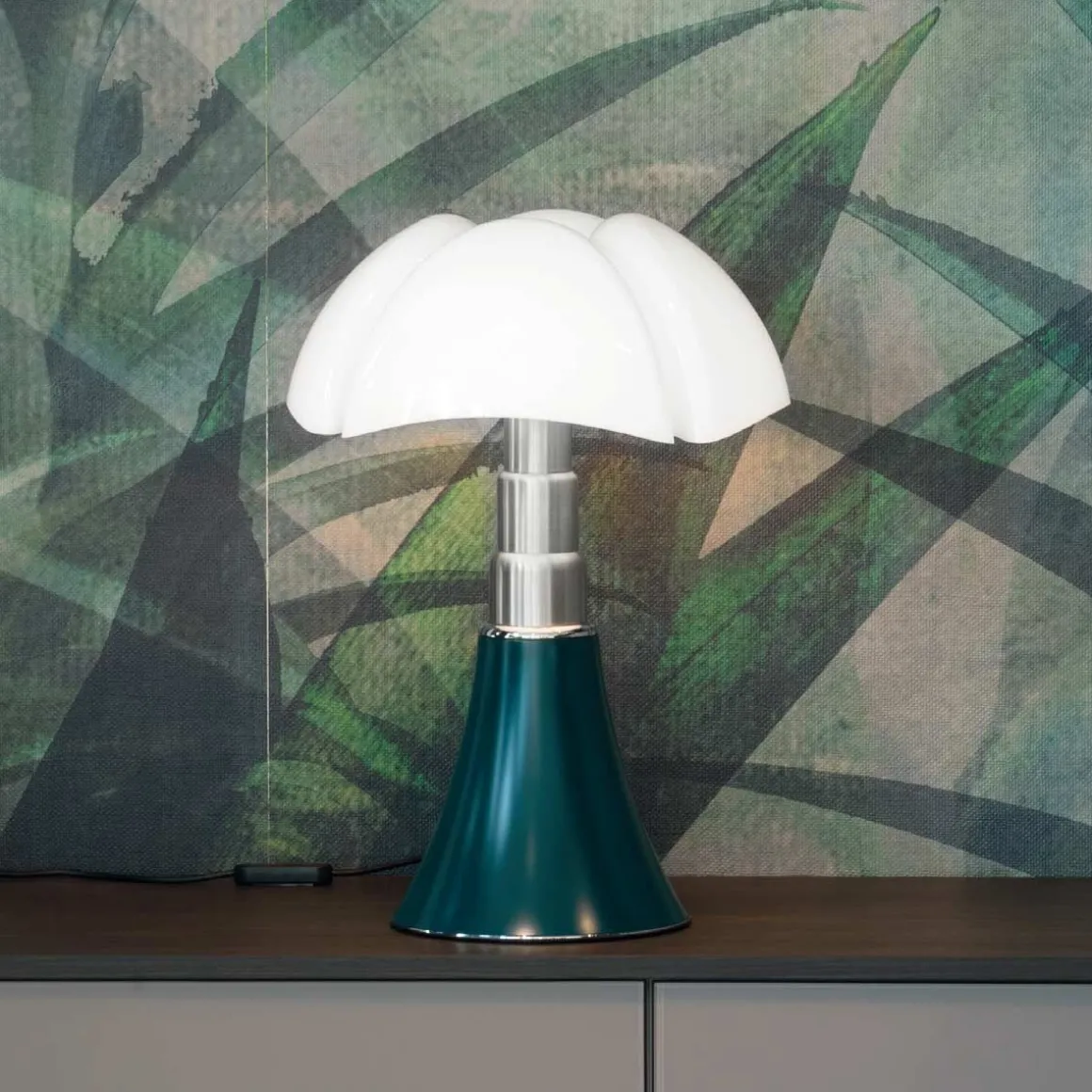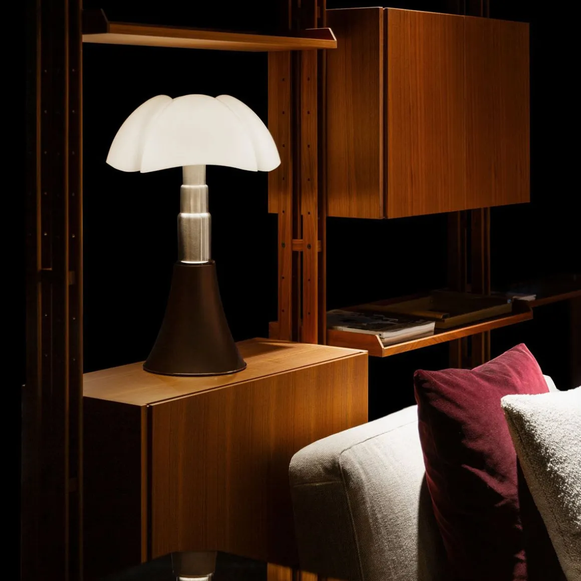 Lampe pipistrello en version de taille moyenne, équipé d’un système d’éclairage LED intégré. Pipistrello est une lampe culte du designer Gae Aulenti, la célèbre lampe Pipistrello a été exposée dans les plus grands musées du monde entier et est devenue un objet culte du design. C’est une lampe de table ou de sol. Le diffuseur en forme de chauve-souris (ce que signifie pipistrello en italien) émet une lumière diffuse. Pipistrello est réglable en hauteur grâce à un mouvement télescopique. Lampe authentique accompagnée d’un certificat d’authenticité MARTINELLI LUCE. Modèle original fabriqué en Italie par l’usine Martinelli Luce.