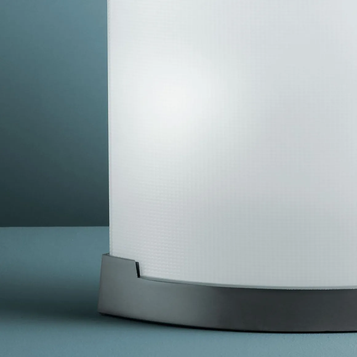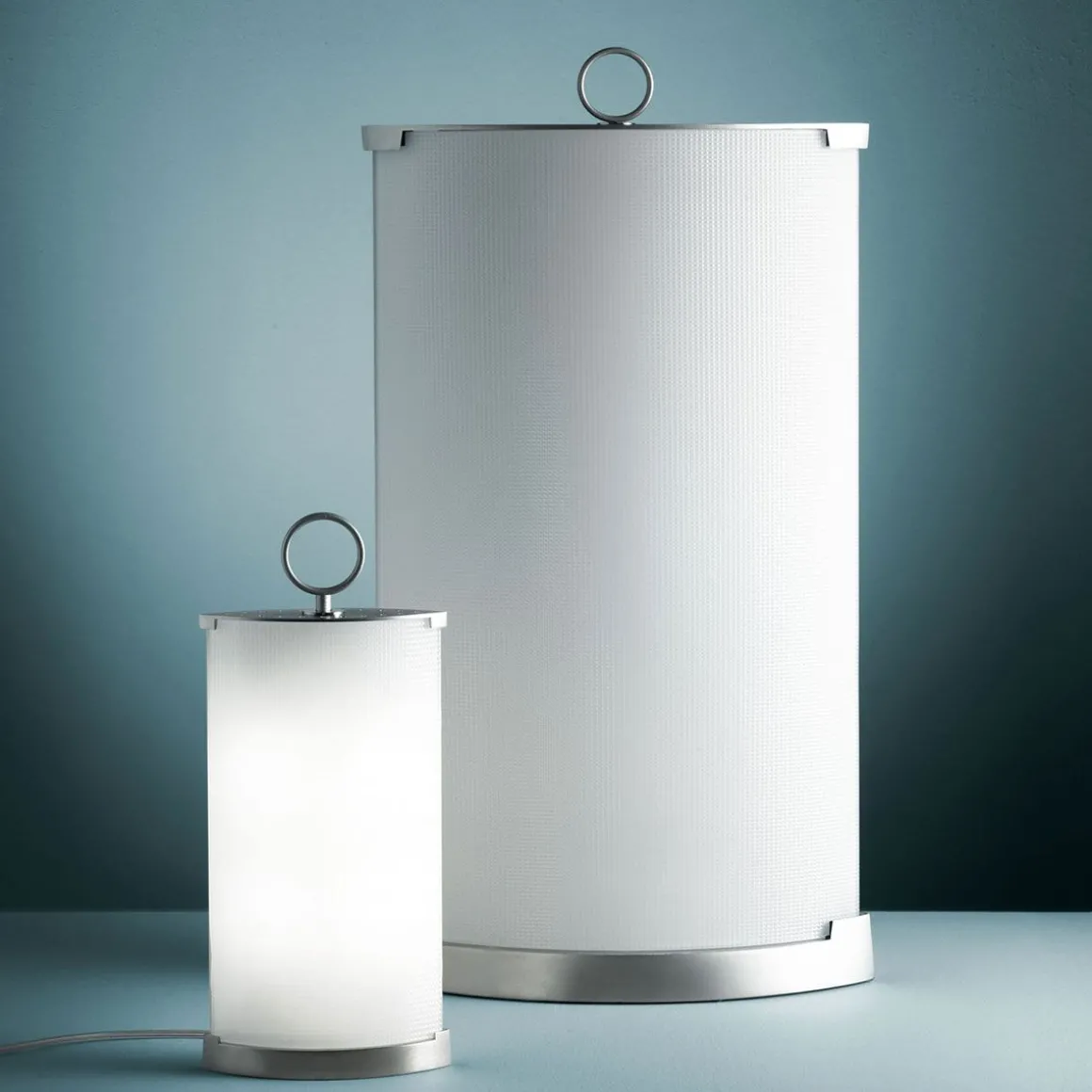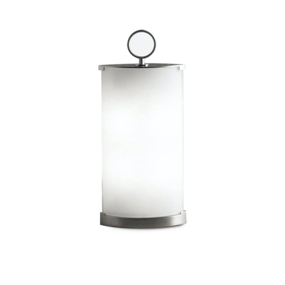 Lampe de table à lumière diffuse et dimmable. Monture en métal nickelé. Diffuseur en verre pressé bombé. Câble d’alimentation, variateur et prise transparents. Fiche bipolaire européenne. Ampoule non incluse. Pirellina est un classique de l’éclairage depuis 40 ans. Deux morceaux de verre bombé maintenus en place par des éléments métalliques à la base et au dessus : le secret de cette structure simple réside dans l’utilisation d’un verre spécial résistant aux chocs.