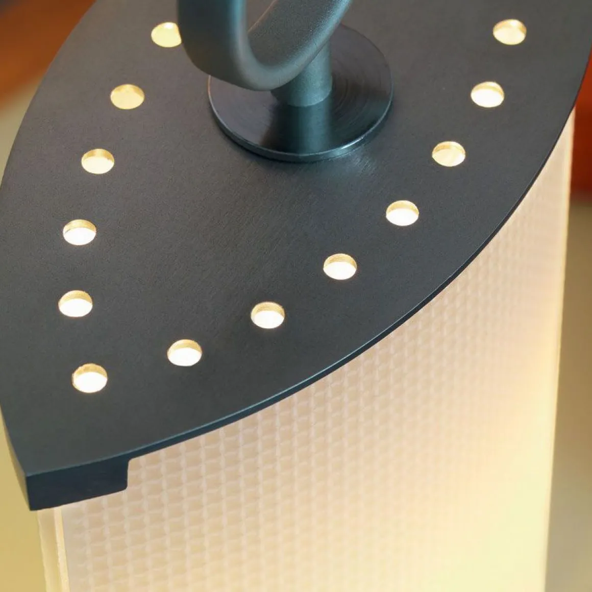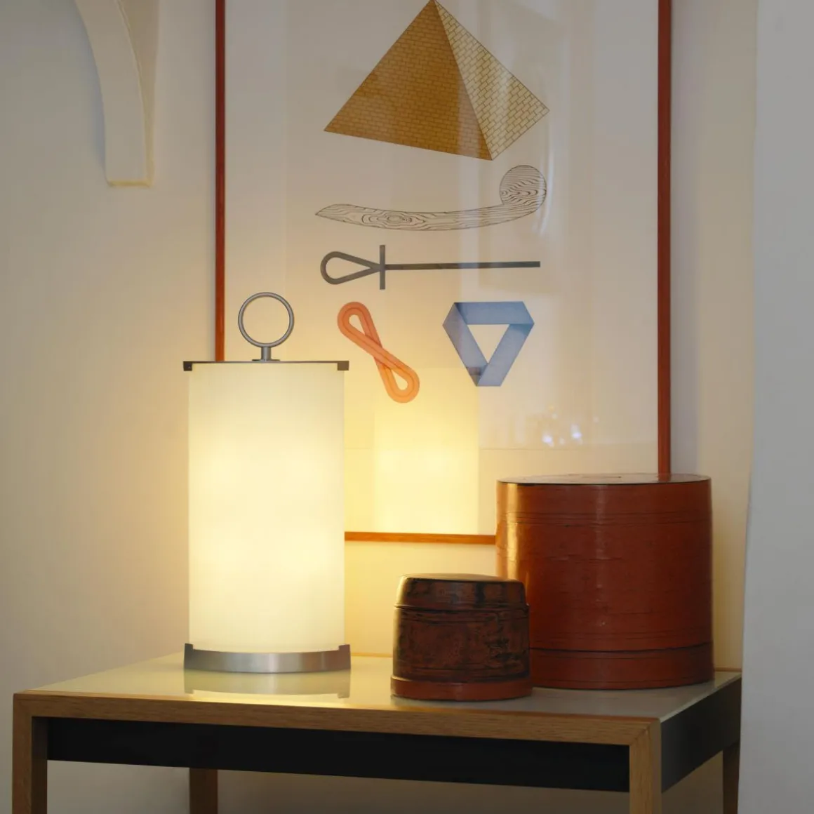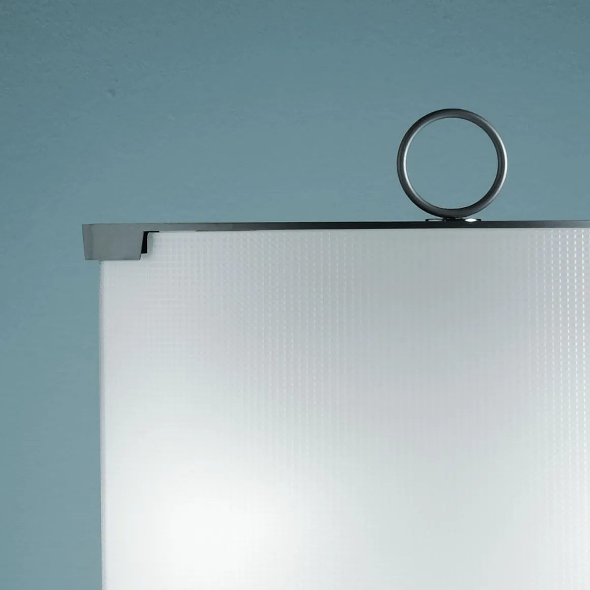 Lampe de table à lumière diffuse et dimmable. Monture en métal nickelé. Diffuseur en verre pressé bombé. Câble d’alimentation, variateur et prise transparents. Fiche bipolaire européenne. Ampoule non incluse. Pirellina est un classique de l’éclairage depuis 40 ans. Deux morceaux de verre bombé maintenus en place par des éléments métalliques à la base et au dessus : le secret de cette structure simple réside dans l’utilisation d’un verre spécial résistant aux chocs.