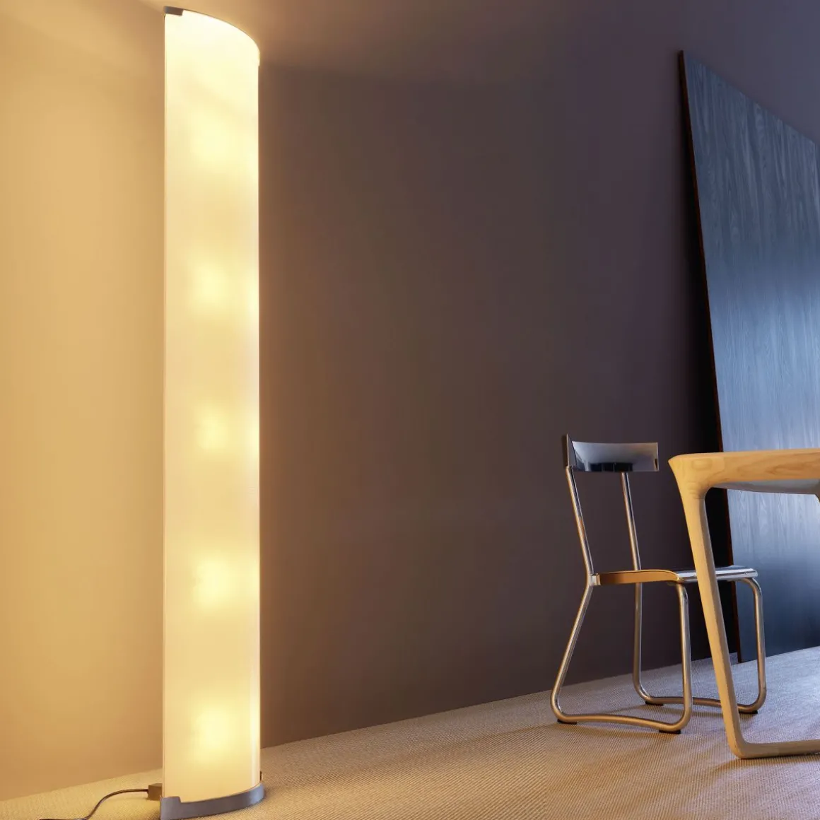 Lampadaire avec lumière diffuse / indirecte et partiellement dimmable avec interrupteur coulissant. Le variateur permet d’allumer / éteindre les sources lumineuses à l’intérieur du diffuseur, et il assure la gradation de l’ampoule supérieure. Cadre en métal nickelé. Diffuseur en verre pressé bombé. Câble d’alimentation, variateur et prise noirs. Prise Shuko, adaptateur non inclus. Ampoule non incluse. Pirellone est un classique de l’éclairage depuis 40 ans. Deux morceaux de verre bombé maintenus en place par des éléments métalliques à la base et au dessus: le secret de cette structure simple réside dans l’utilisation d’un verre spécial résistant aux chocs.
