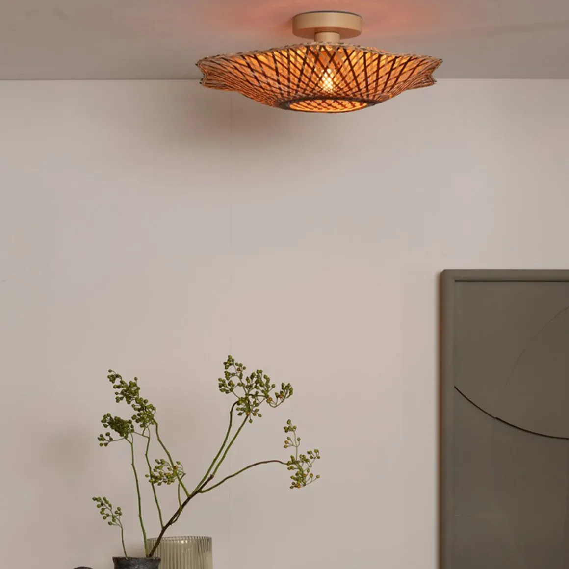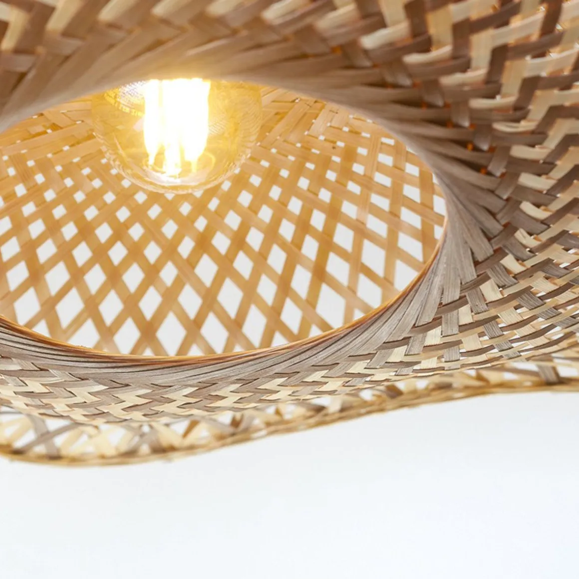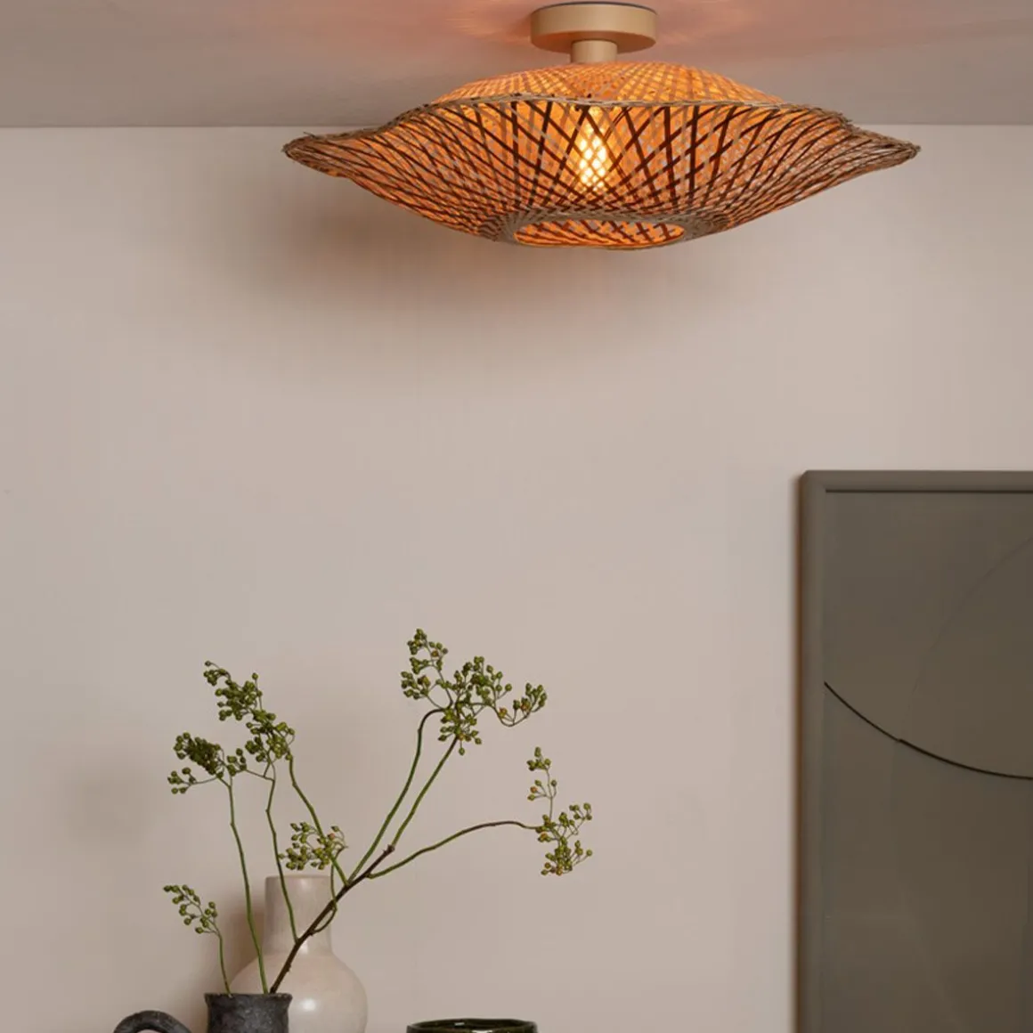 Ces lampes s’inspirent de la culture vibrante et de la beauté naturelle de l’île de Madura. En forme de fleurs épanouies, ces abat-jour sont fabriqués à la main en bambou tressé, combinant harmonieusement des lamelles de bambou naturel et brun. Leur design organique reflète non seulement les paysages luxuriants et les riches traditions de l’île, mais aussi les superbes motifs d’ombres rayées qui ornent les murs.