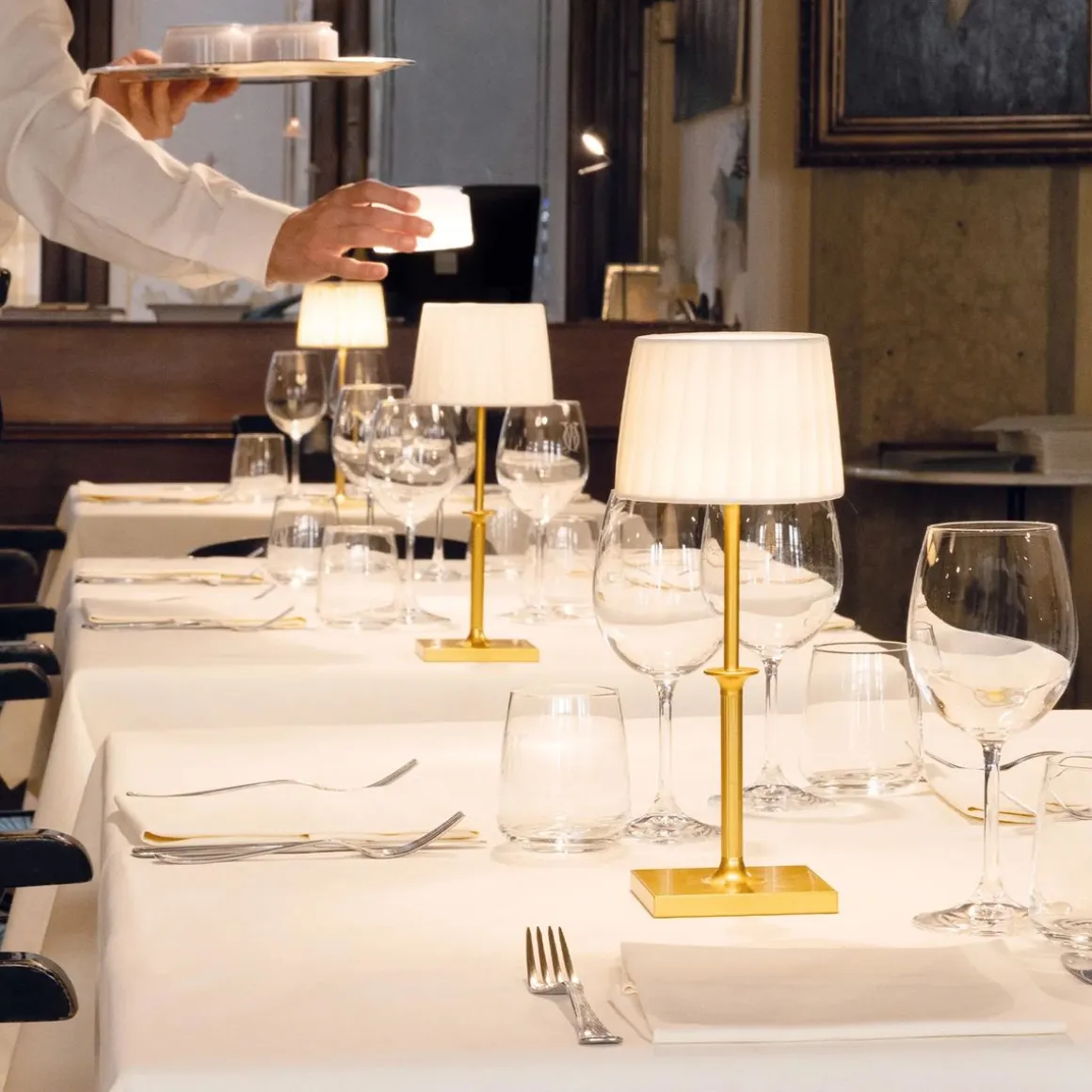 Poldina Classic est une lampe de table rechargeable sans fil, dotée d’un abat-jour en tissu plissé et d’un innovant chapeau lumineux magnétique, amovible et rechargeable séparément via une base de recharge à contact. Cette solution rend l’utilisation de la lampe encore plus pratique, en particulier dans un contexte professionnel : dans les restaurants ou les hôtels, par exemple, le chapeau déchargé peut être remplacé immédiatement par un autre déjà chargé, sans attendre la recharge complète. Le chapeau lumineux – également disponible à l’achat séparément – intègre des commandes tactiles sur le dessus : allumage/extinction, réglage de l’intensité lumineuse et choix de la température de couleur. Poldina Classic est conçue exclusivement pour une utilisation en intérieur et dispose d’un système de contrôle électronique qui surveille l’autonomie de la batterie et en optimise la charge. La batterie rechargeable et remplaçable offre environ 10 heures d’autonomie à pleine puissance. Disponible en trois finitions : blanc, bronze et or.
