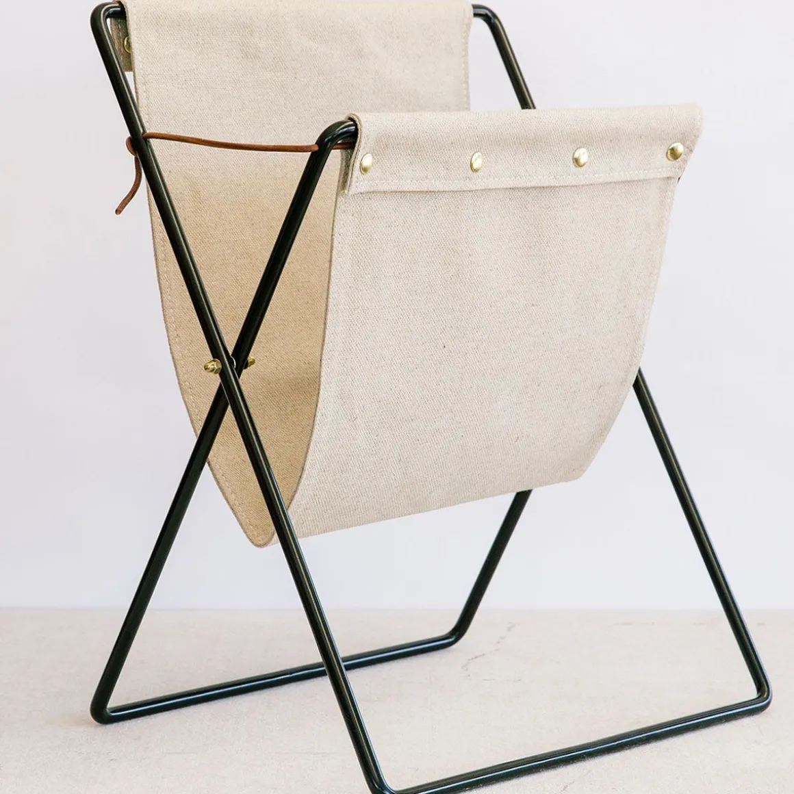 Le porte magazine Herman de Ferm Living, tire son inspiration de l’esthétique vintage. Il associe et mixe différents matériaux. Le support de la toile durable est fixé sur un cadre en métal enduit de poudre fixé avec des lacets en cuir. Des boutons-pression en laiton et une étiquette en cuir du logo terminent ce dessin rétro-inspiré. Ce porte-revues est pliants et se range facilement. Son design retro vous séduira !