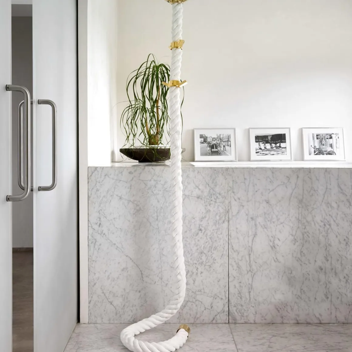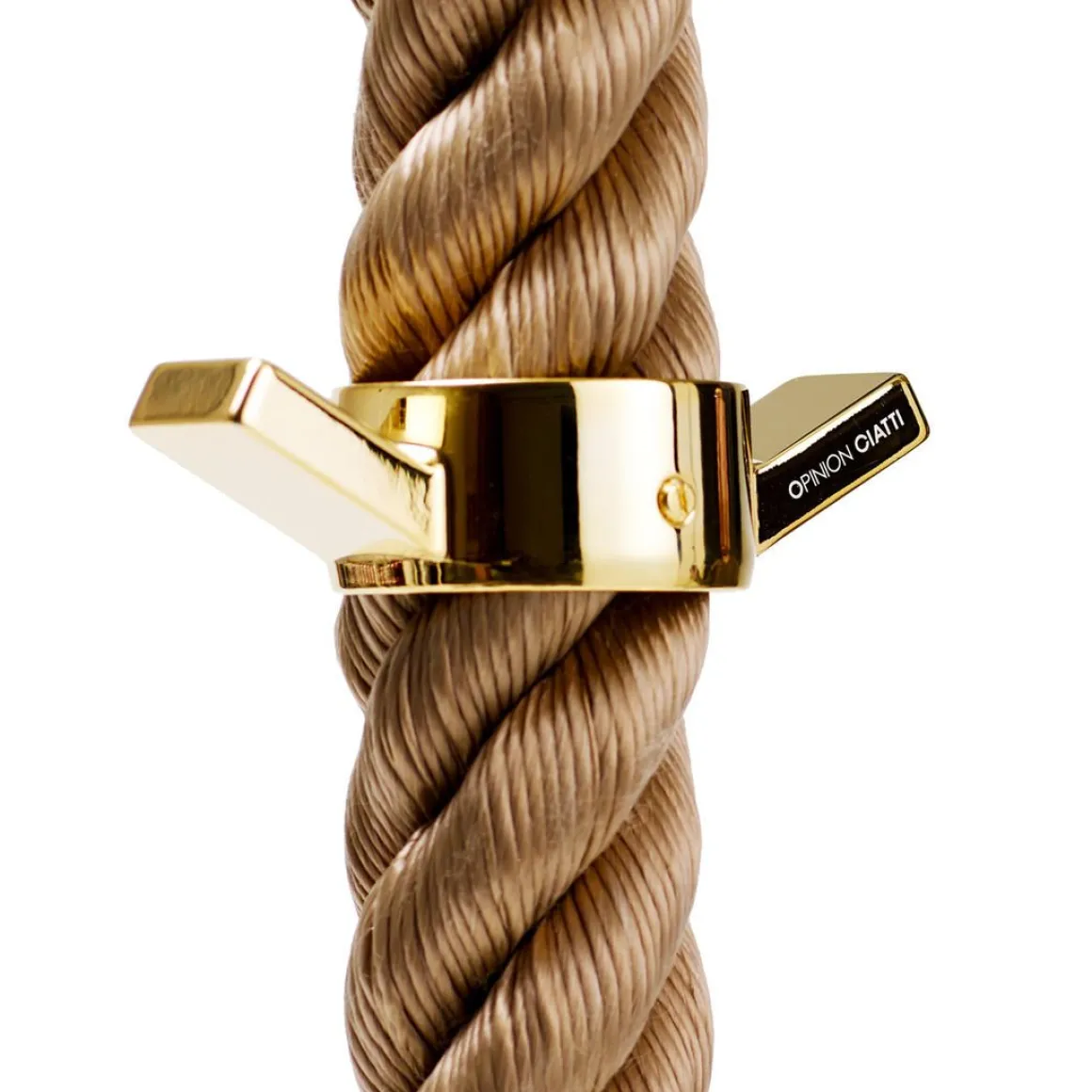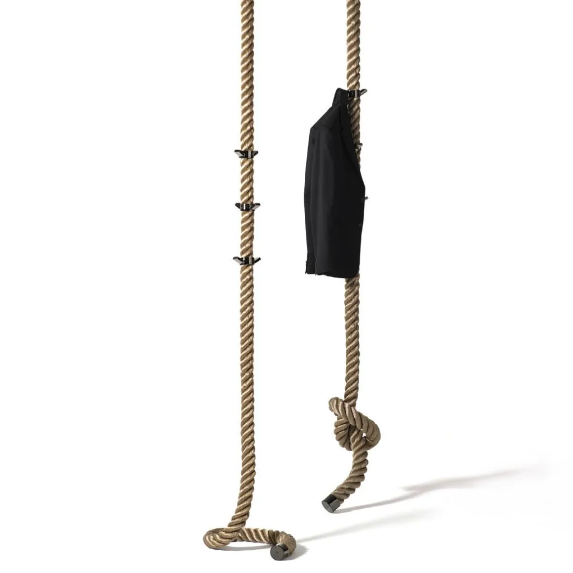 La Cima de Lapo Ciatti représente l’idée du ready-made et du design : la corde nautique tressée la plus classique est réinterprétée pour devenir un cintre innovant et captivant. Une corde à accrocher à l’aide de crochets spécifiques, soit au plafond, soit au mur, qui, grâce à trois anneaux, se transforme en un cintre aussi original que fonctionnel. Un meuble dans lequel la forme devient le protagoniste sans sacrifier la facilité d’utilisation, capable en effet de transformer, comme tous les vrais objets de design, une action quotidienne en une expérience inoubliable. Pas un simple cintre mais un protagoniste absolu de chaque espace de vie , à la maison, au bureau, au bar ou dans le hall d’ un hôtel. Séjour, antichambres, chambres mais aussi salles de bains et cuisines, La Cima est une touche ironique et amusante pour tout type d’ environnement. La Cima est disponible en trois couleurs (blanc, noir ou sable) et peut être combinée avec des patères à deux crochets en quatre finitions différentes (métal peint en noir, chrome, nickel noir, or 24 carats).
