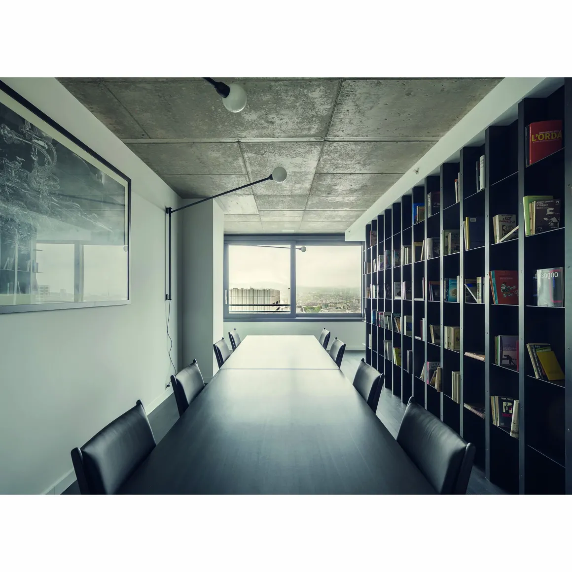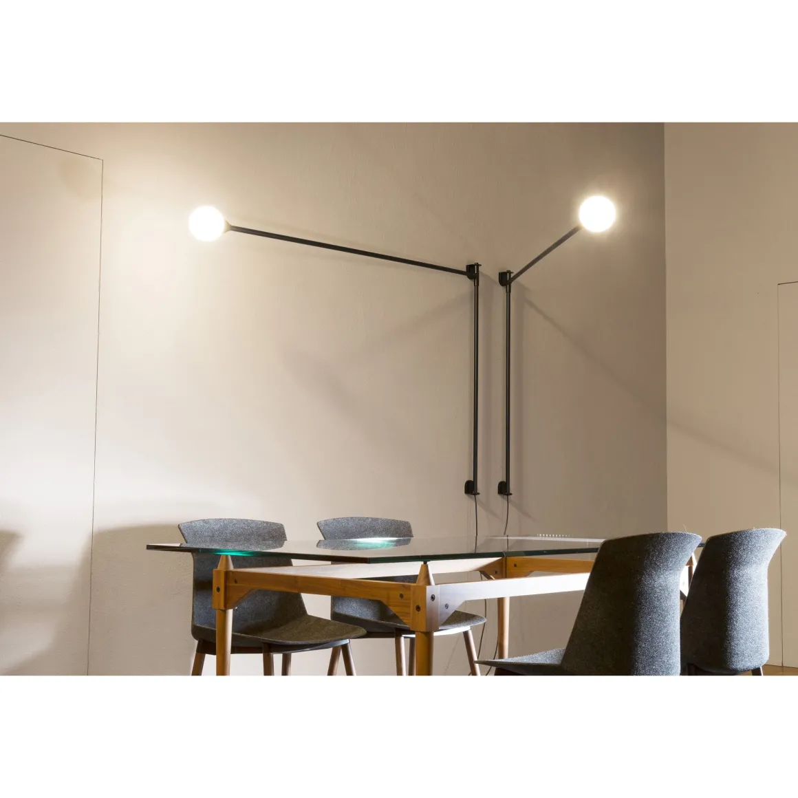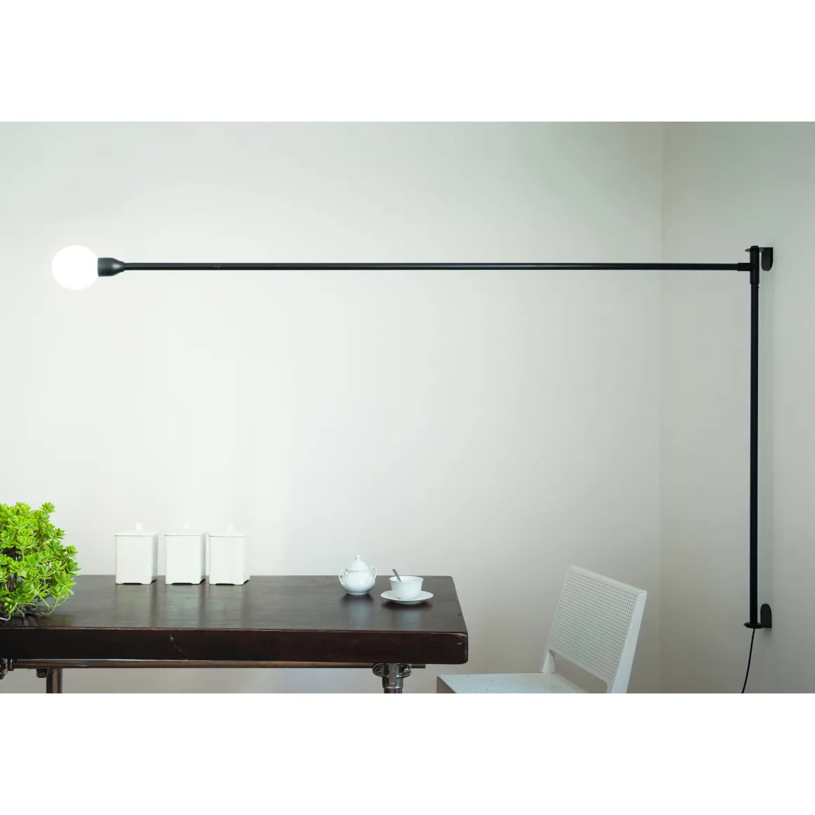 Lampe tout en simplicité, tout en longueur et rondeur. Son angle parfait lui permet de s’intégrer facilement dans votre foyer. Lampe en aluminium et en métal, vernie en noir mat. Diffuseur en verre opale. Applique orientable sur l’axe horizontal, décrivant un angle presque 180°. Le câble d’alimentation est fourni avec fiche et dimmer.