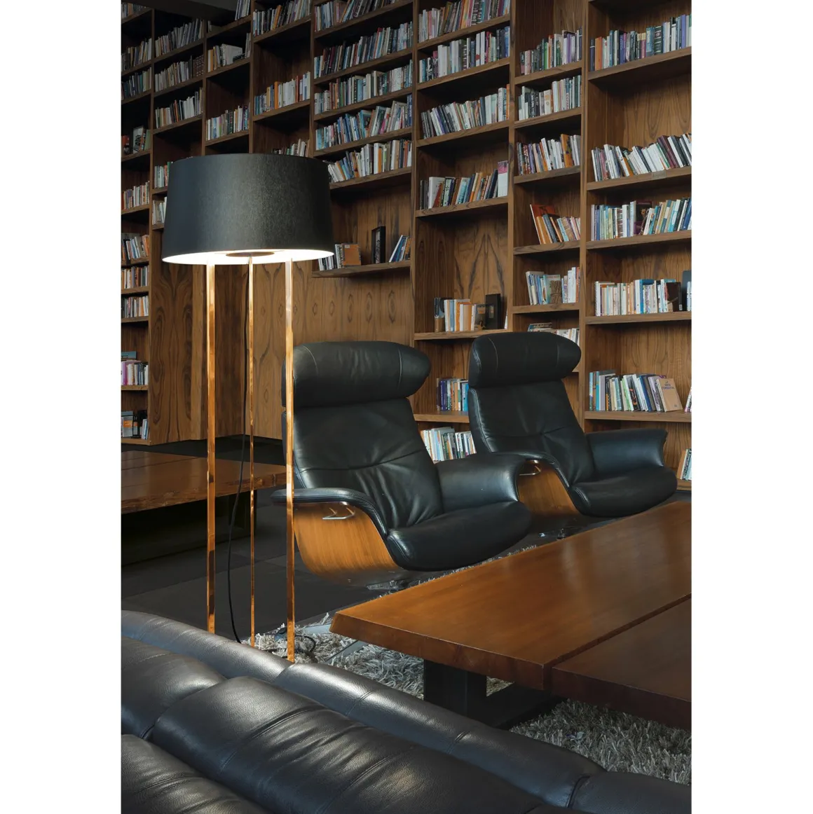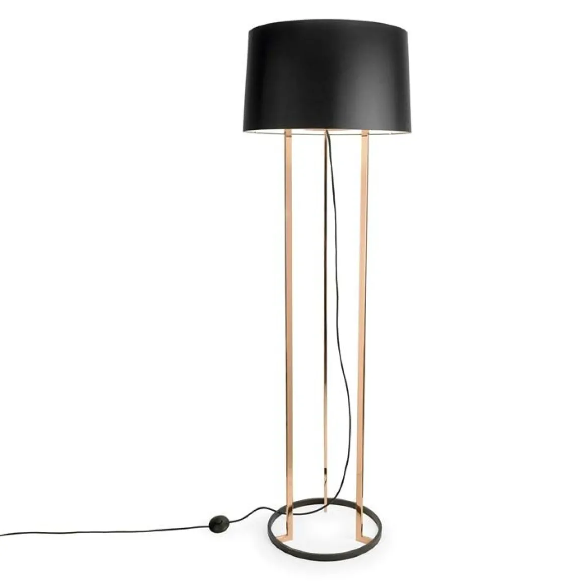 Chaleureux Trépied. Avec sa finition cuivre et son abat-jour noir, ce luminaire ne manque pas de présence. Admriez sa silhouette, allumé comme éteint. Sa ligne sculpturale délimite les espaces, diffusant sa lumière douce et élégante.