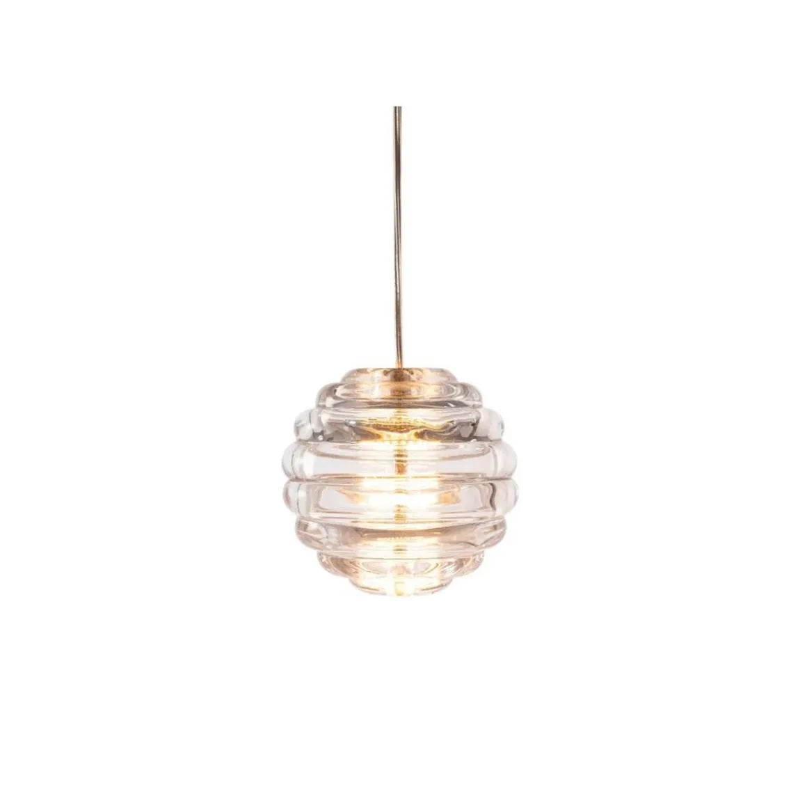 Press Pendant Mini Sphere LED de Tom Dixon. Une superbe mini suspension contemporaine fabriquée à partir du verre pressé industriellement le plus épais. Conçu et fabriqué pour capter et réfracter la lumière et pour durer éternellement. Le verre nervuré crée une diffusion de la source lumineuse et projette des motifs linéaires et rayés. Press Sphere Mini est un nouveau pendentif plus compact, plus léger et conçu pour être regroupé et suspendu par plusieurs.