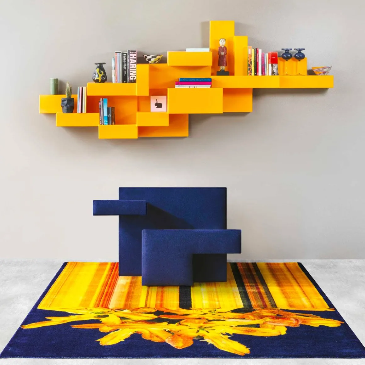 Primitive de Qeeboo par Studio Nucléo. Le fauteuil Primitive, jouant sur l’asymétrie des volumes primaires, est réalisé avec une structure rembourrée et recouverte d’un tissu de couleur mélangée. « Primitif comme figure géométrique primaire.