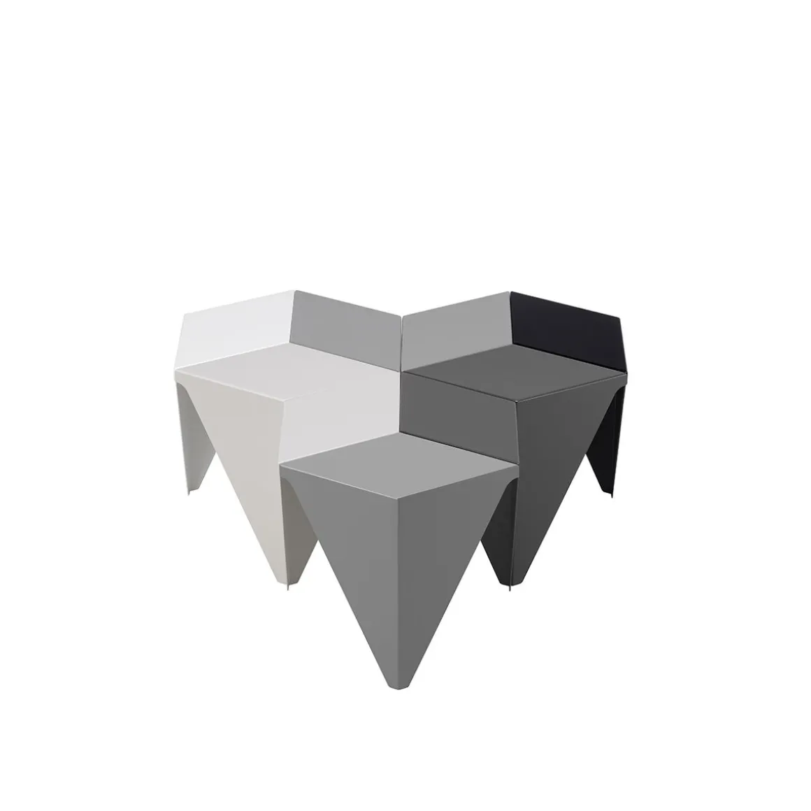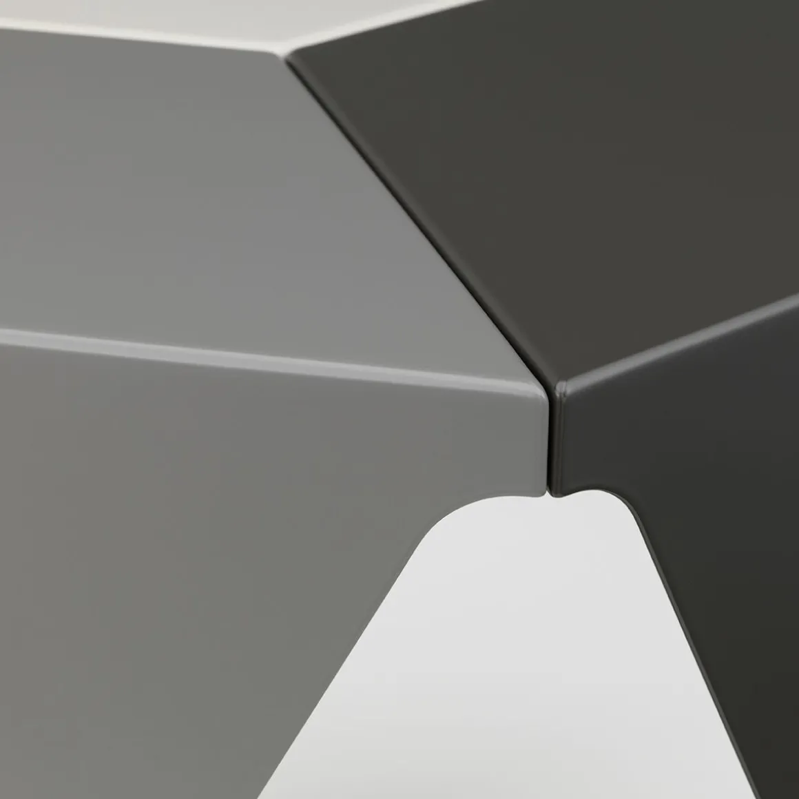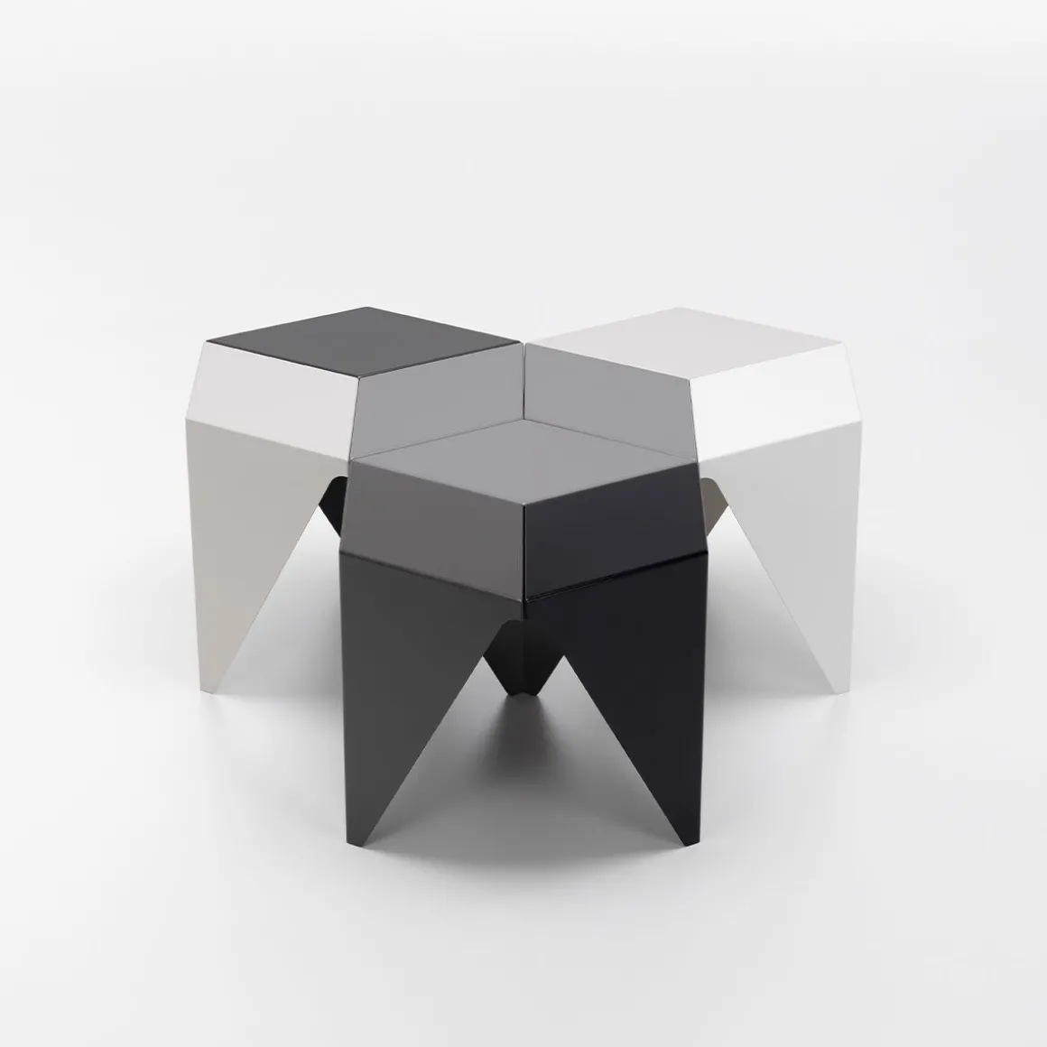 La table Prismatic s’inscrit dans un langage formel purement géométrique, elle s’inspire des techniques de pliage de papier japonais traditionnelles. Cette table d’appoint se compose de trois éléments en tôle d’aluminium pliée dotés d’une finition époxy haut de gamme. Réunis, les éléments forment une table à trois pieds avec un plateau hexagonal. Comme l’avait prévu Isami Noguchi à l’origine, Vitra produit la Prismatic Table en trois versions, dont les trois composant se déclinent en différentes nuances sobres de gris. Disposés à plusieurs, les Prismatic Tables forment des motifs extraordinaires, aux apparences de kaléidoscopes.