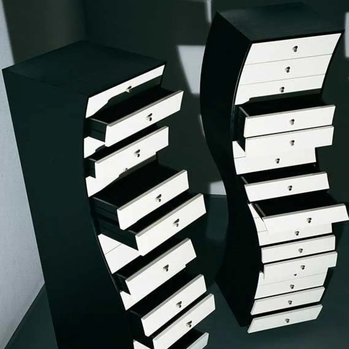 La structure des commodes Progetti Compiuti est en frêne teinté noir et les tiroirs sont laqués blanc mat.