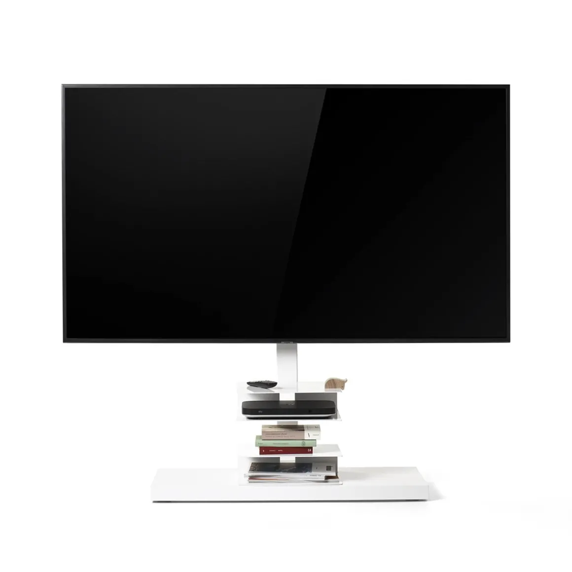 Essentiel, léger, fonctionnel. Ptolomeo TV Smart est l’ évolution naturelle de Ptolomeo TV Light, le support multimédia de la famille Ptolomeo de plus en plus nombreuse. Les besoins changent, la consommation évolue, Ptolomeo TV Smart les suit en s’adaptant aux dimensions sans cesse croissantes des téléviseurs de dernière génération. La structure reste la même, une colonne de collecte de câbles avec deux séries d’ étagères en acier – conçues pour contenir les périphériques les plus populaires – et un support avec adaptateur TVau sommet. Quels changements sont les volumes, la base et la colonne ont augmenté pour assurer la stabilité même en présence de poids et de dimensions plus élevés.