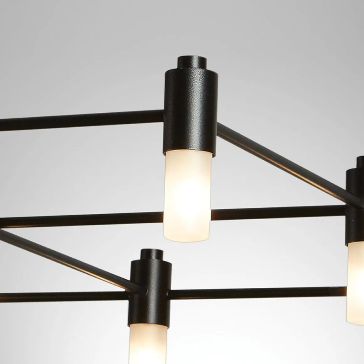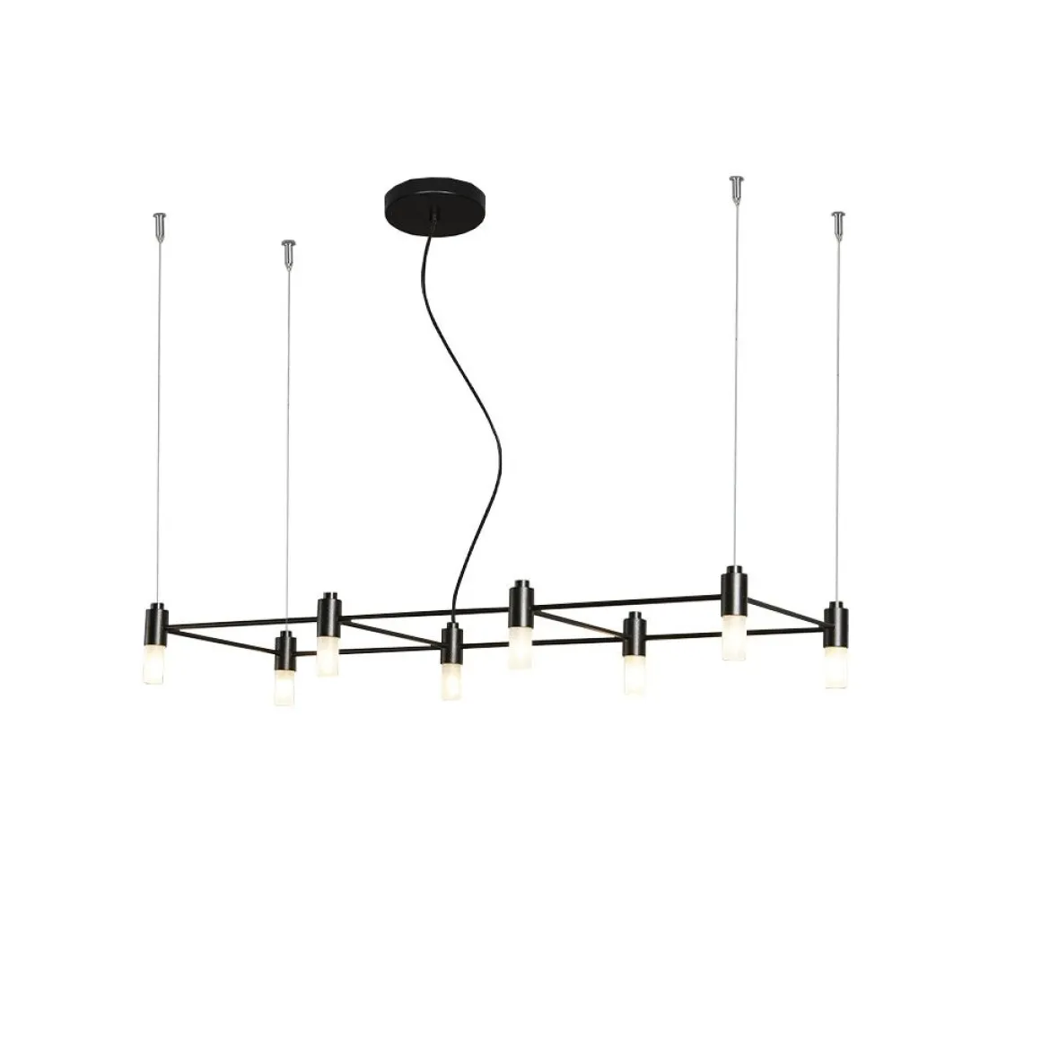 Suspension modulaire en tubes d’acier soudés et enduits de poudre. Les configurations possibles sont nombreuses et créent un système de grilles lumineuses.