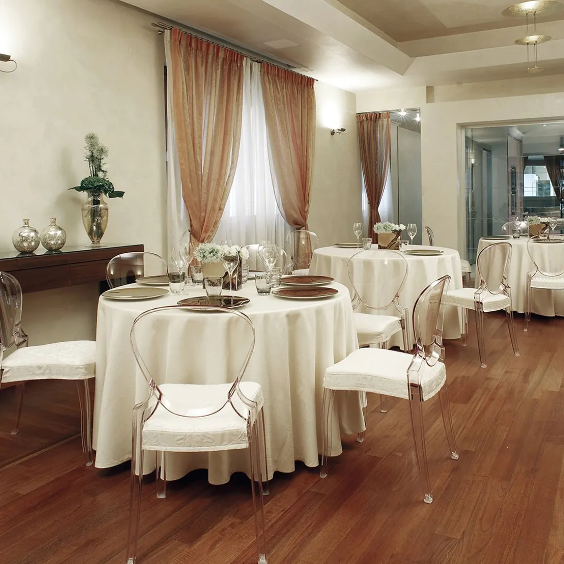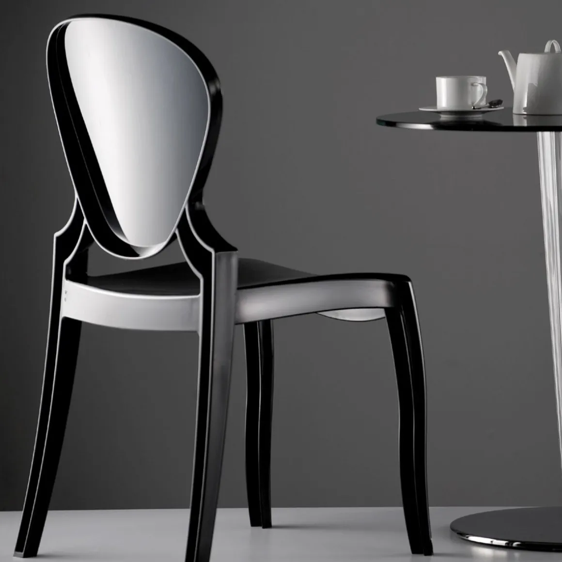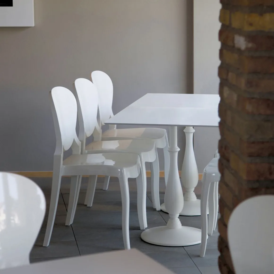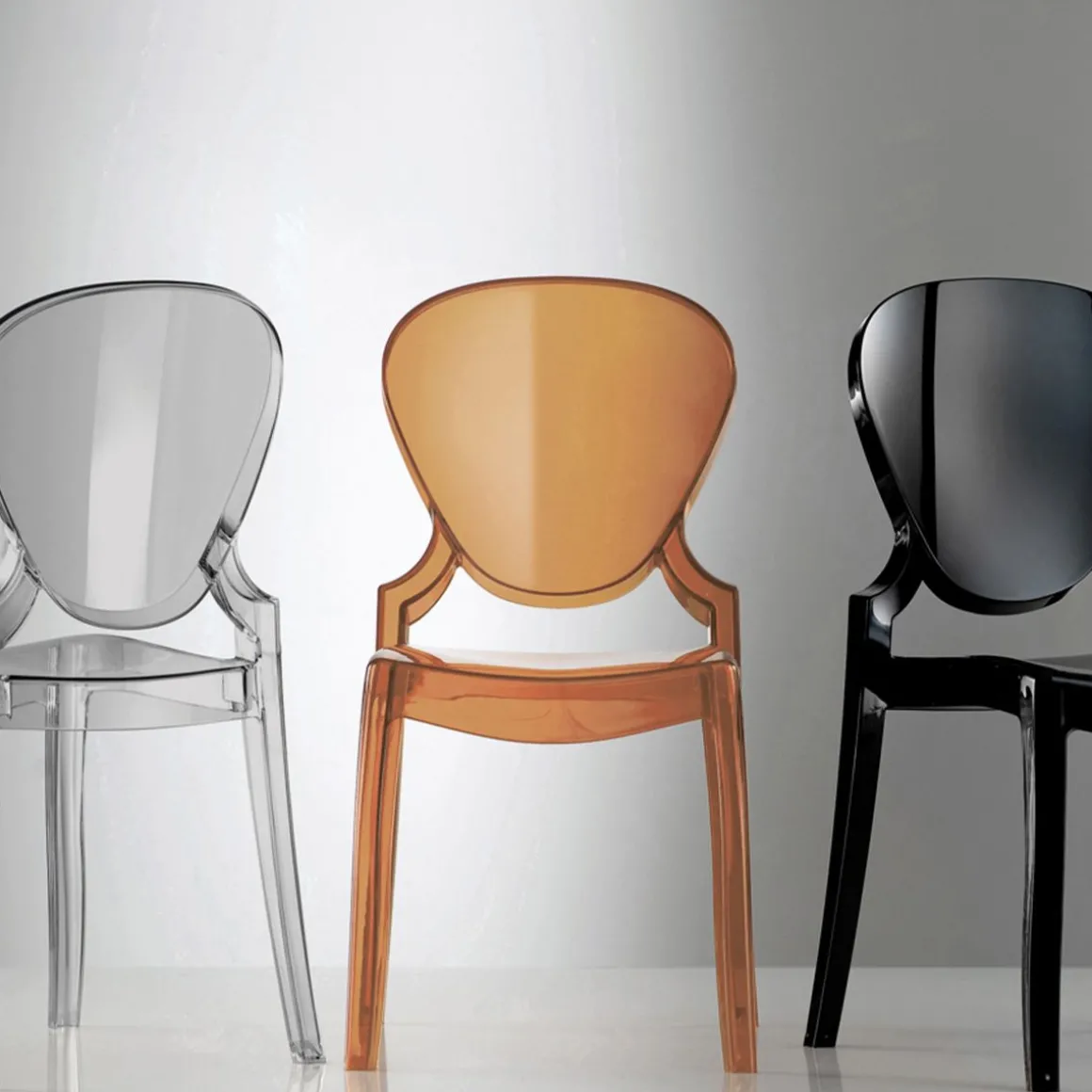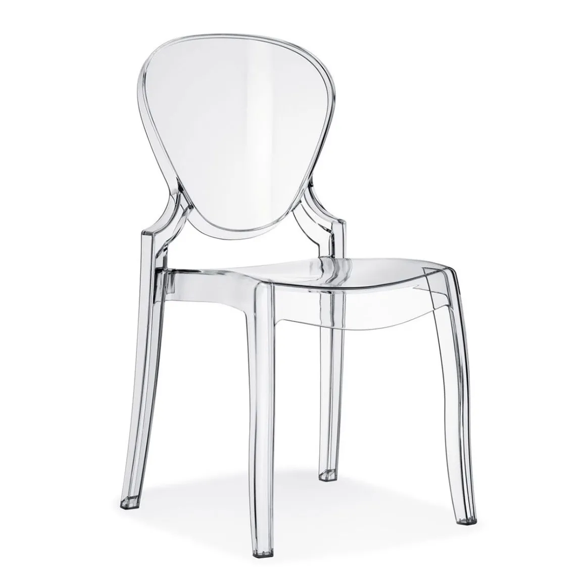 Queen est entièrement réalisée en polycarbonate, matériel résistant et indiqué pour n’importe quel milieu. La chaise s’inspire aux canons les plus traditionnels mais introduit aussi des éléments de contemporanéité aussi bien dans le dessin que dans le matériel et dans la technologie constructive. La forme est pensée pour évoquer les traits néoclassiques et pour s’insérer dans des contextes très élégants et formels. A ce but un coussin textile est prédisposé pour compléter le produit en lui conférant une élégance définitive.